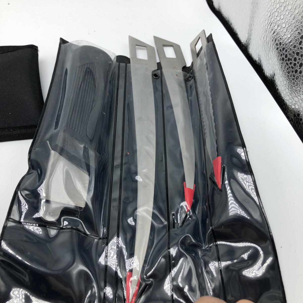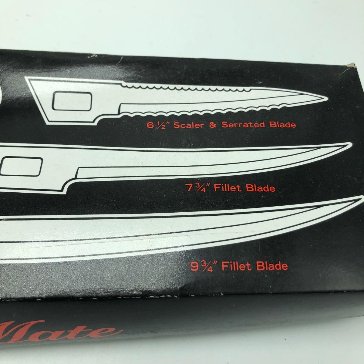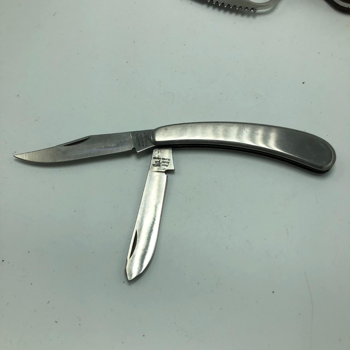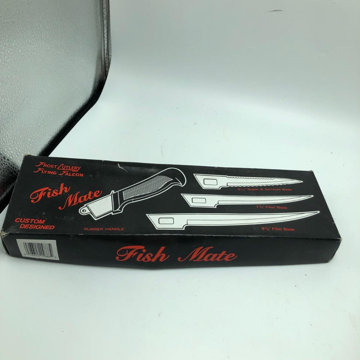 Lot contains a total of six knives: two Bowie knives, one skinner knife, two pocket knives and a three blade fish knife. Largest knife measures 16” long.