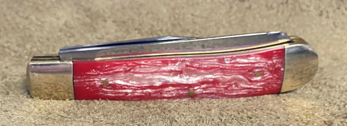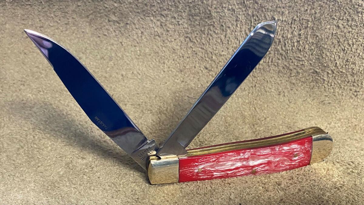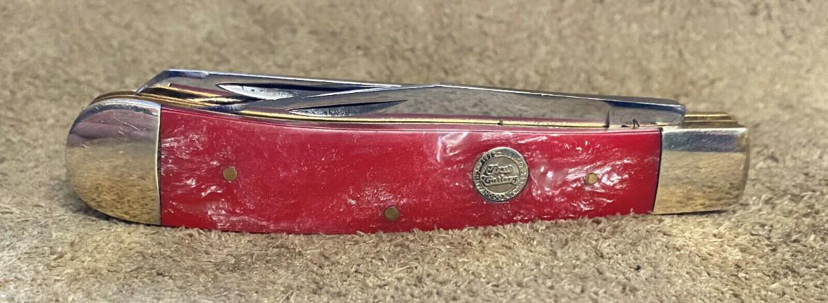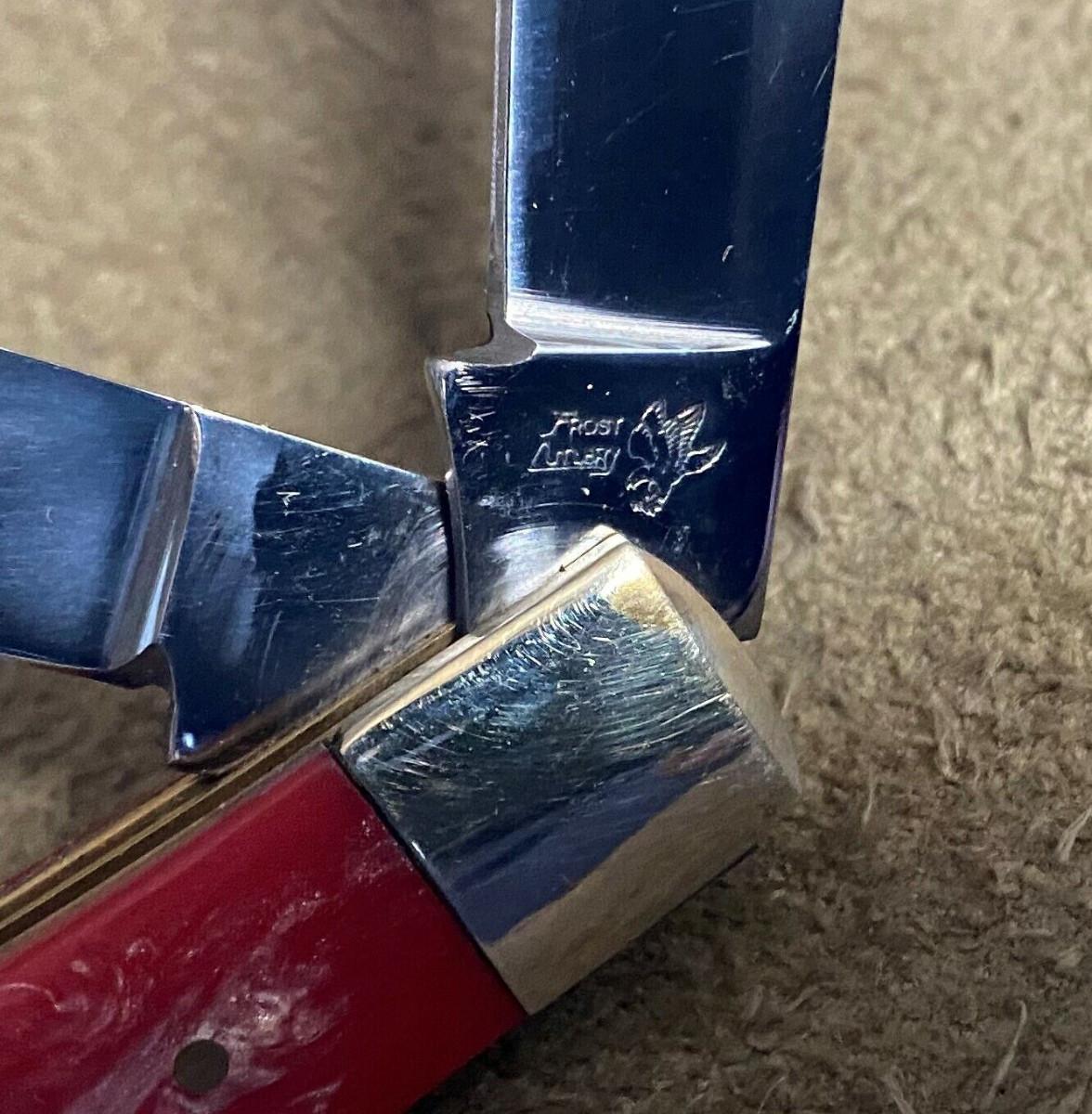 Virtually new condition on this 2 folding blade Frost Cutlery Trapper pocketknife...German stainless clip and spey blades...Factory edge...Brass liners..Nickel silver bolsters..4 1/8" closed...3.3 oz...Salmon pearl handles...Tight..Good snap...No wobble...Slightest use...Offered with no reserve...