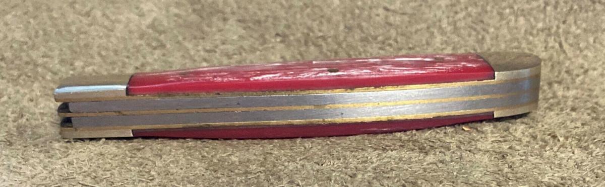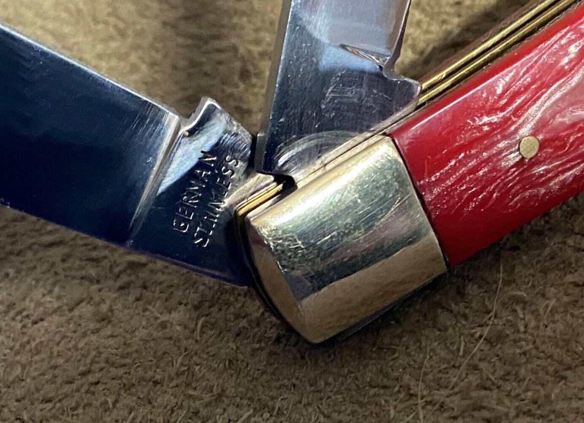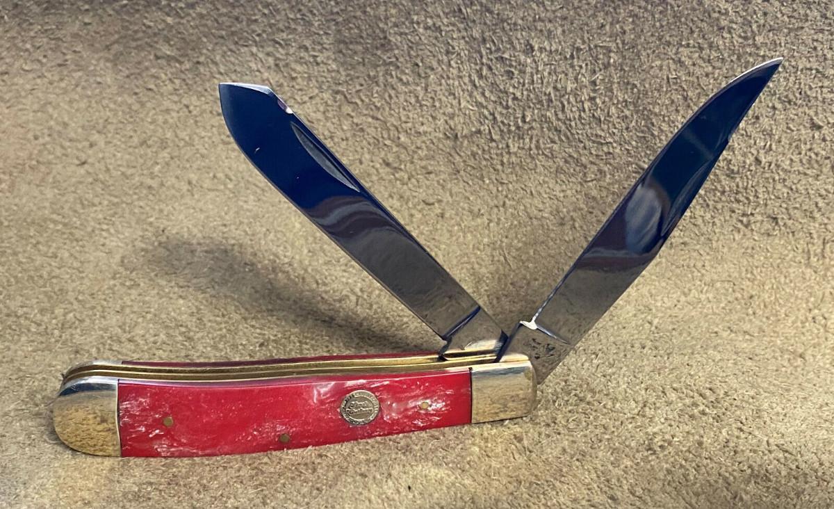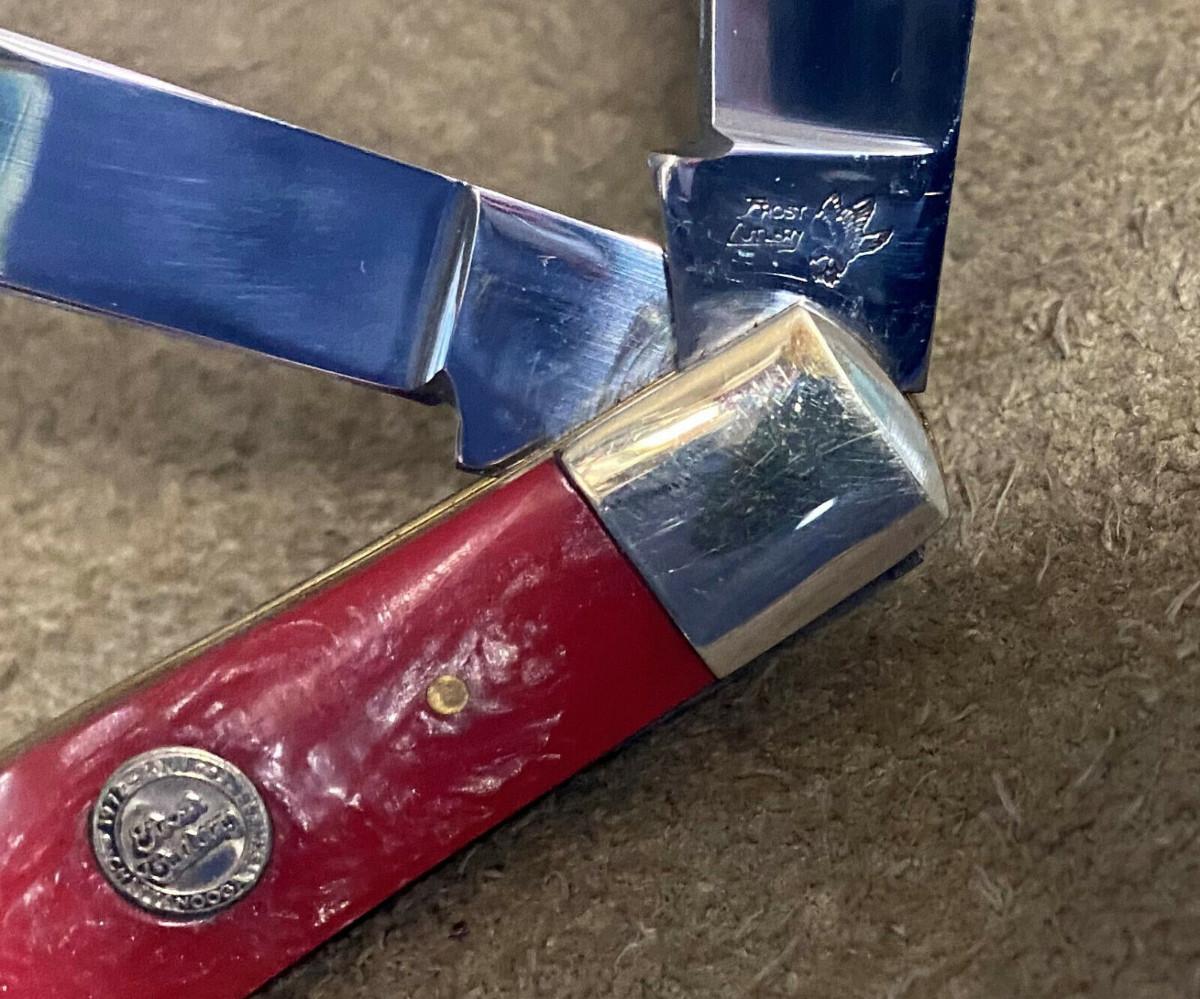 Virtually new condition on this 2 folding blade Frost Cutlery Trapper pocketknife...German stainless clip and spey blades...Factory edge...Brass liners..Nickel silver bolsters..4 1/8" closed...3.3 oz...Salmon pearl handles...Tight..Good snap...No wobble...Slightest use...Offered with no reserve...