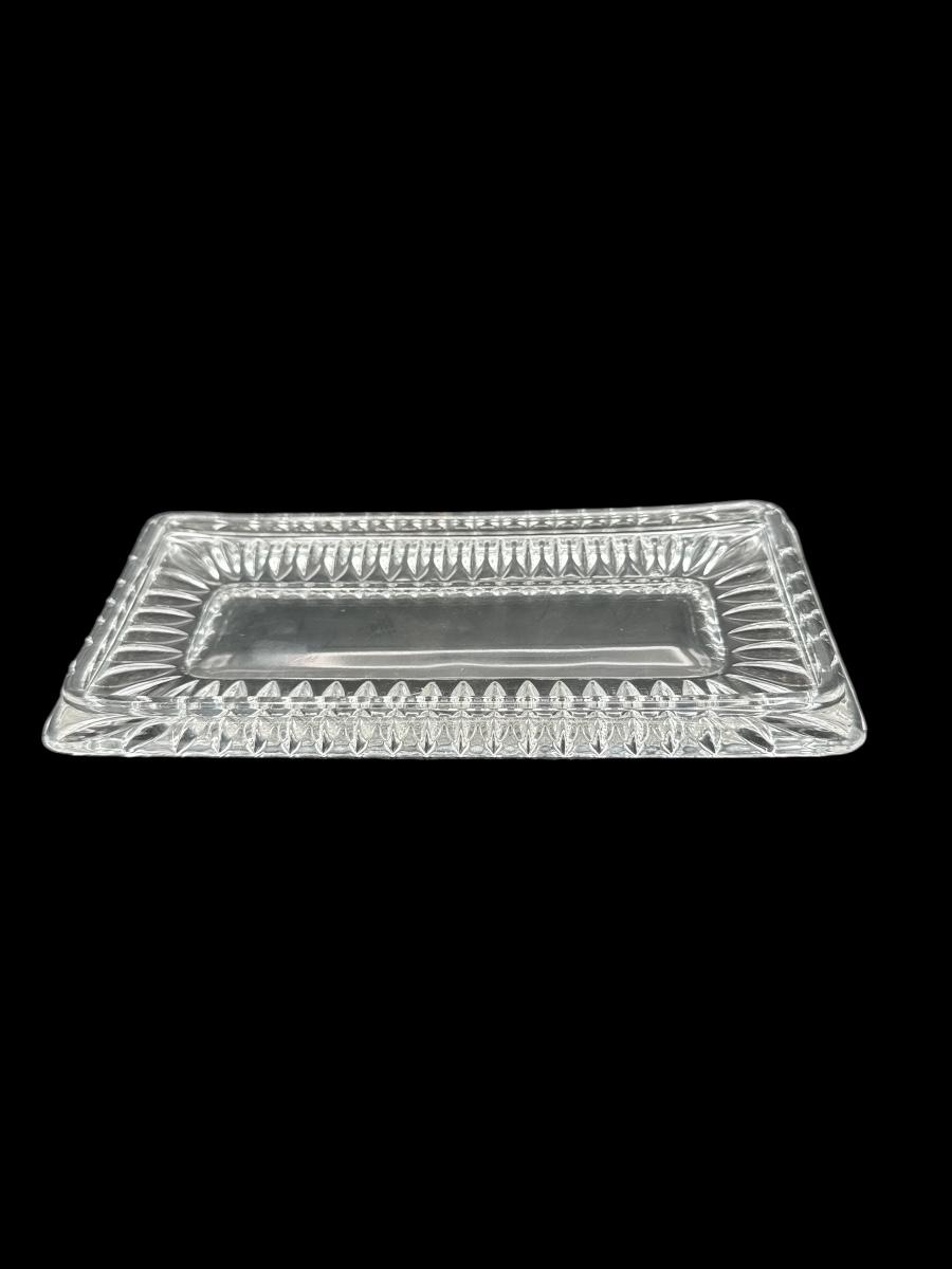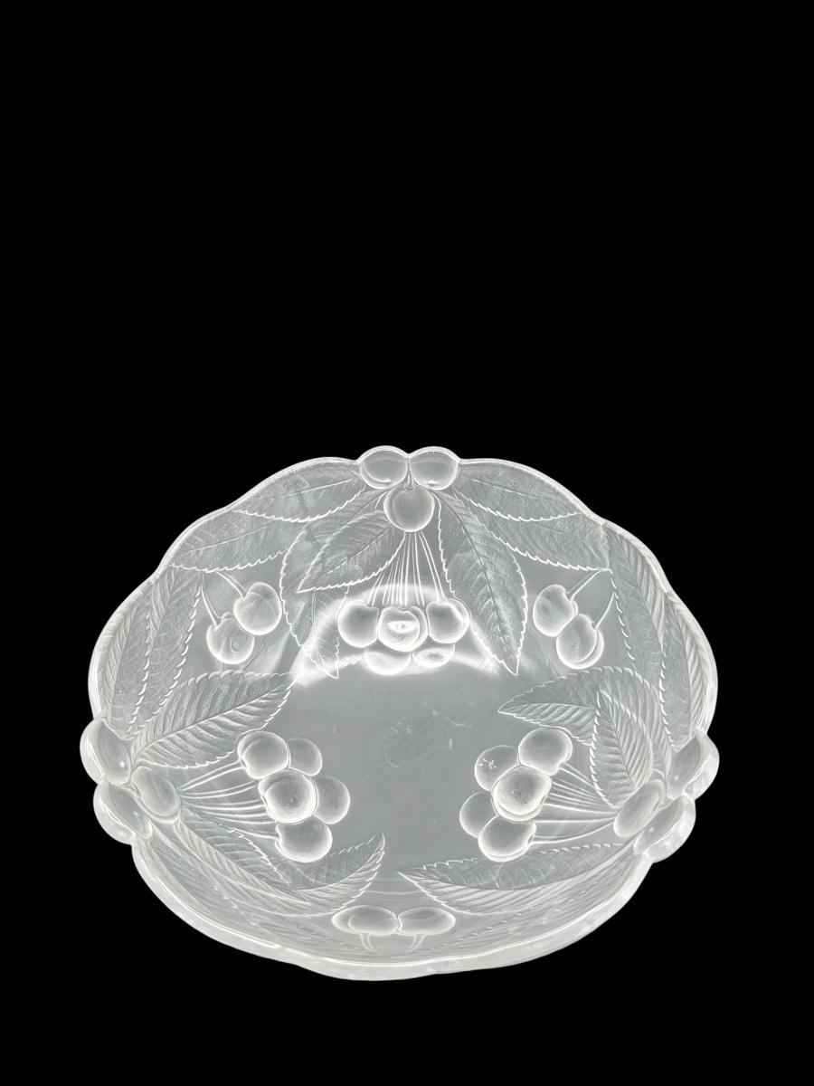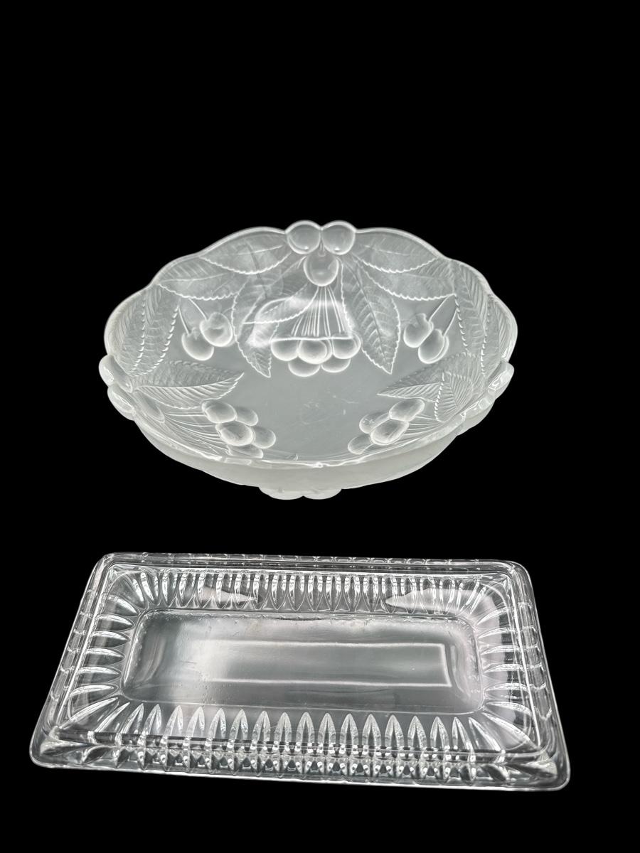 Includes a frosted glass bowl with embossed cherry and leaf motif, and a rectangular pressed glass tray with a cut-style border. Both in excellent condition—ideal for serving, display, or vintage décor.