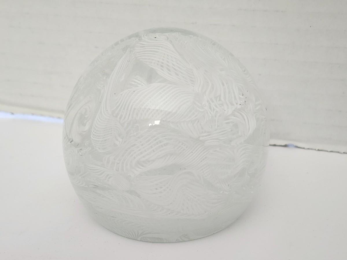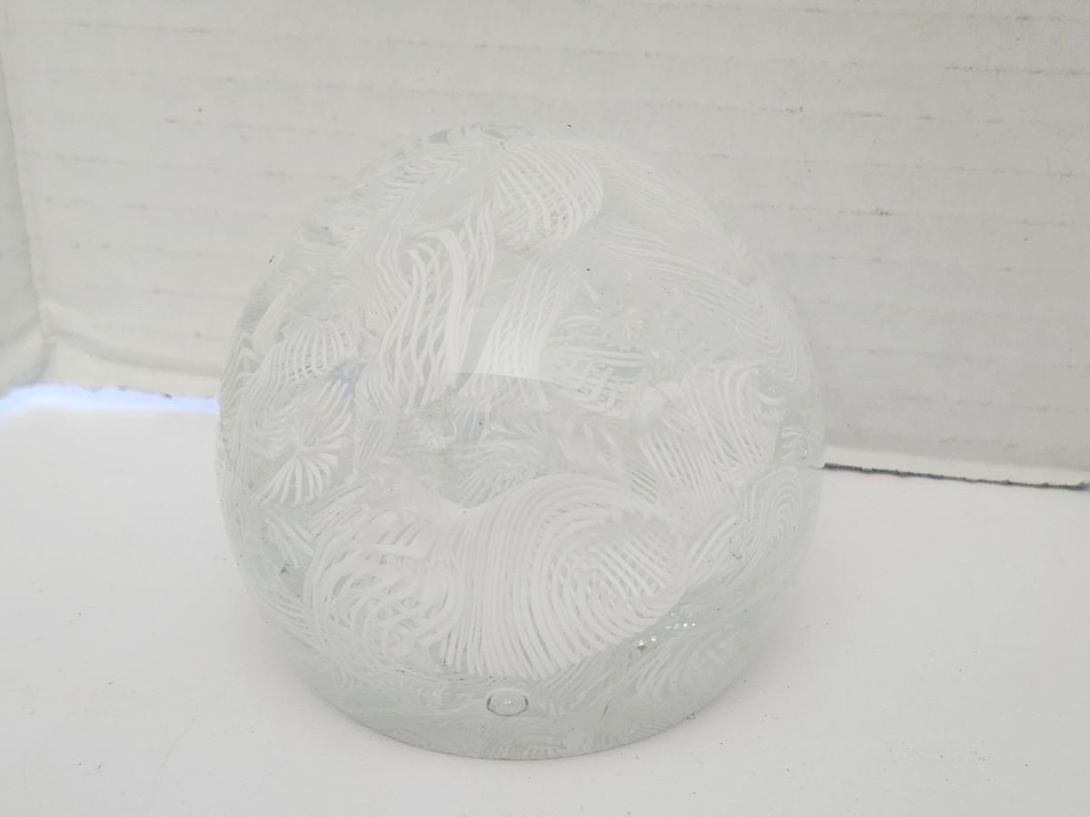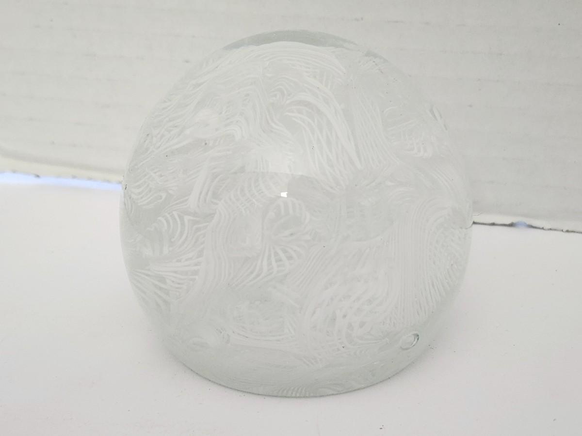 Clear glass paperweight with a frosted appearance and allover swirled etched pattern. Rounded dome form with smooth polished base. No maker’s mark or branding visible. Presented as a standalone decorative glass paperweight based solely on visible characteristics.