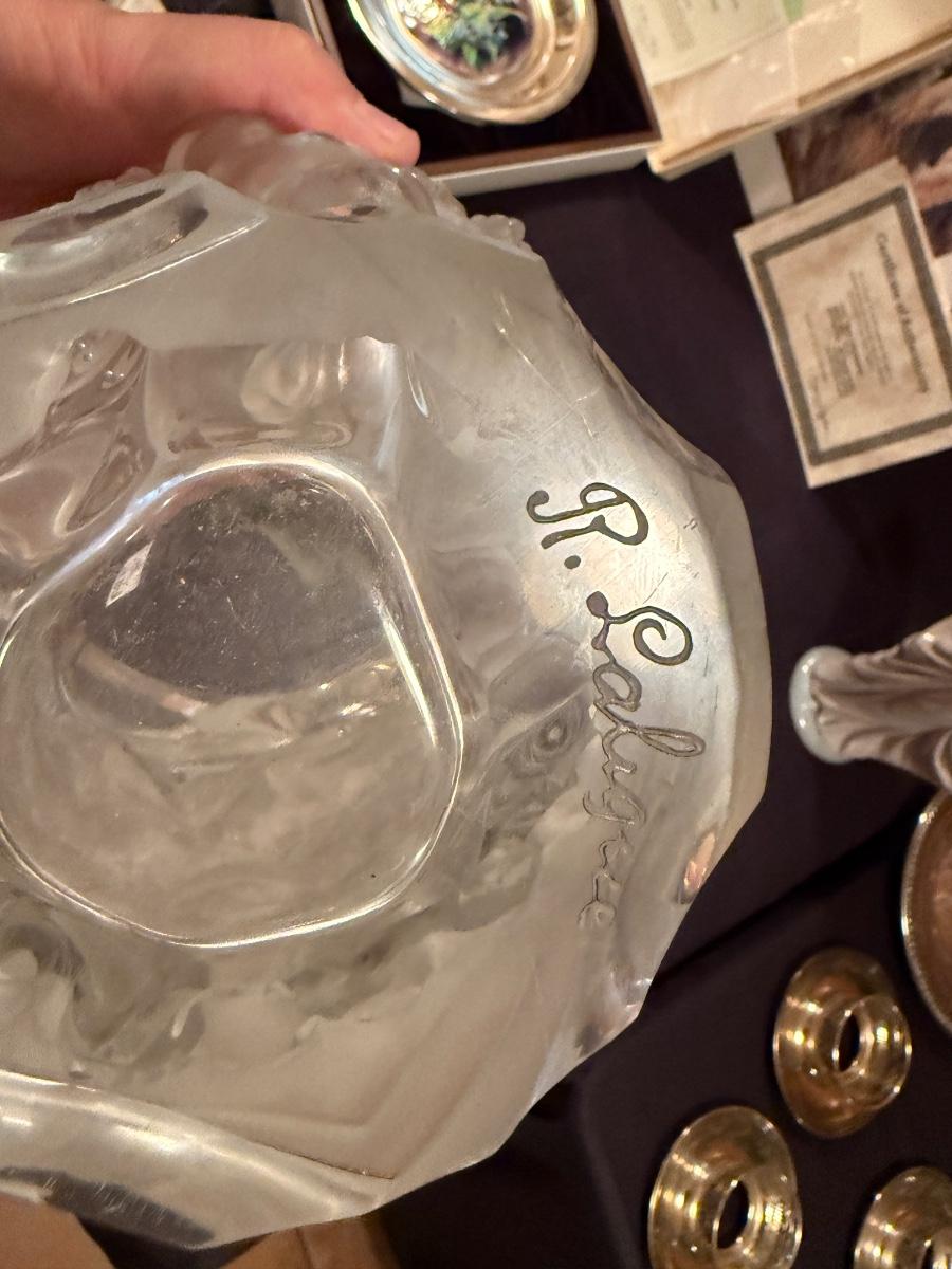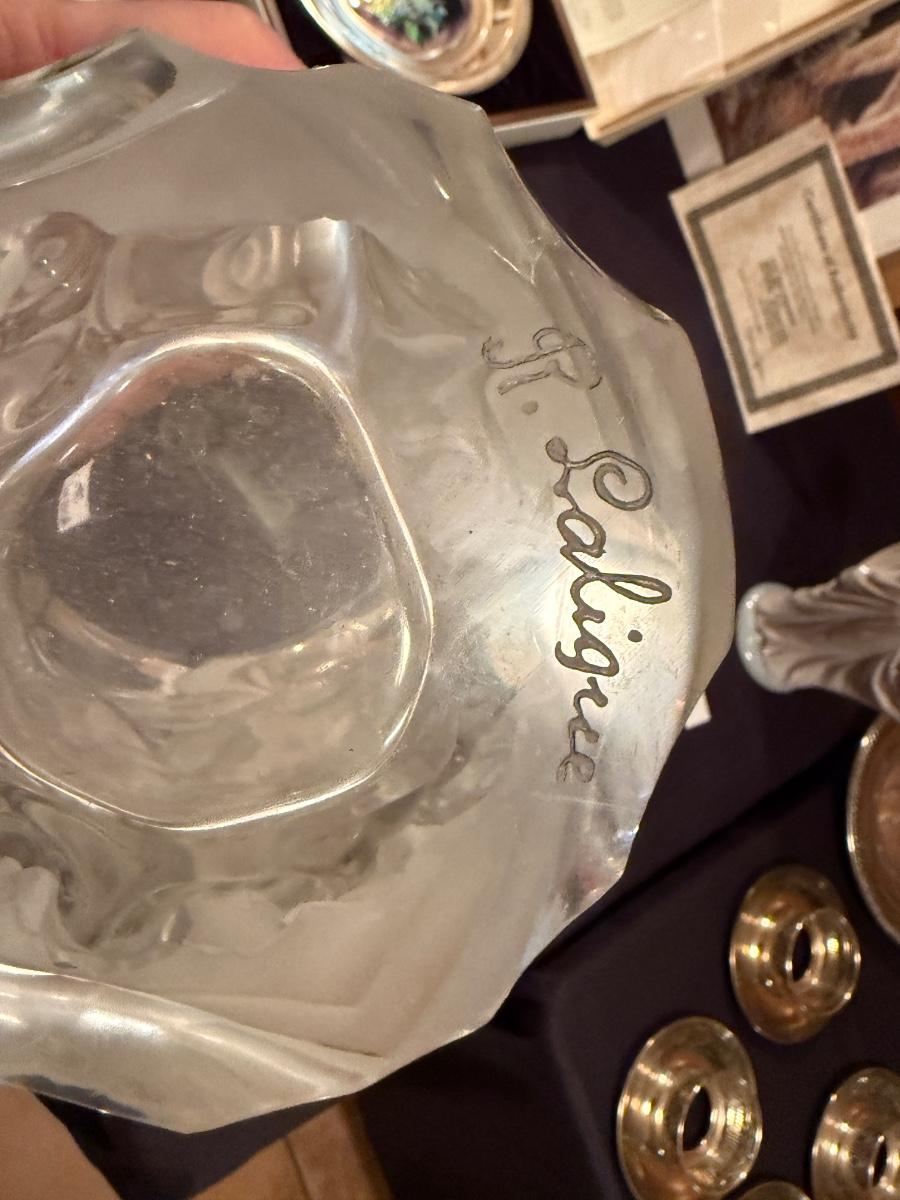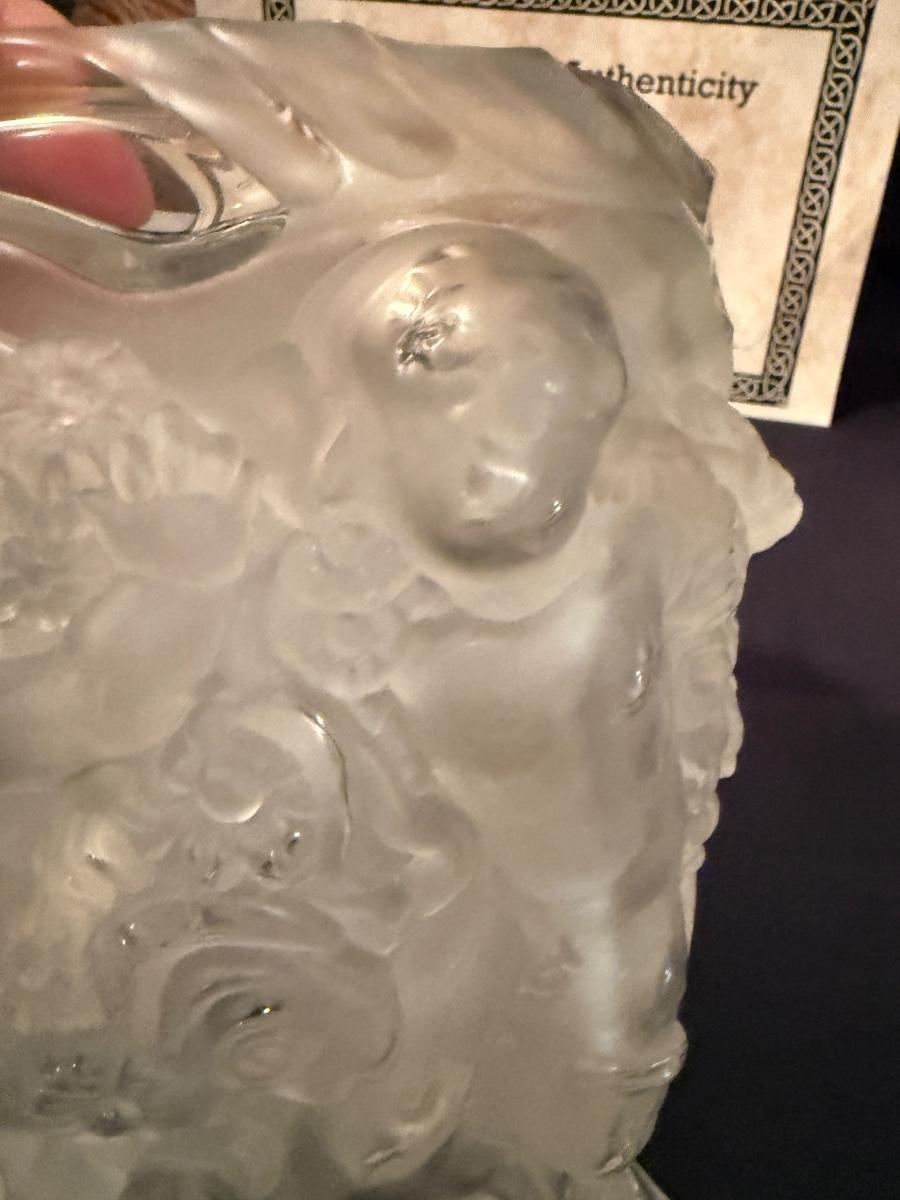 Signed " R. Lalique" on the bottom. Has a raised cherubs around the entire piece..