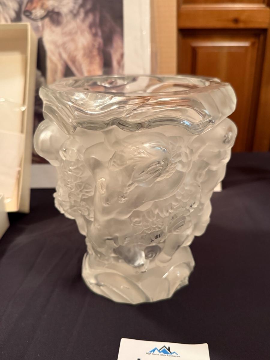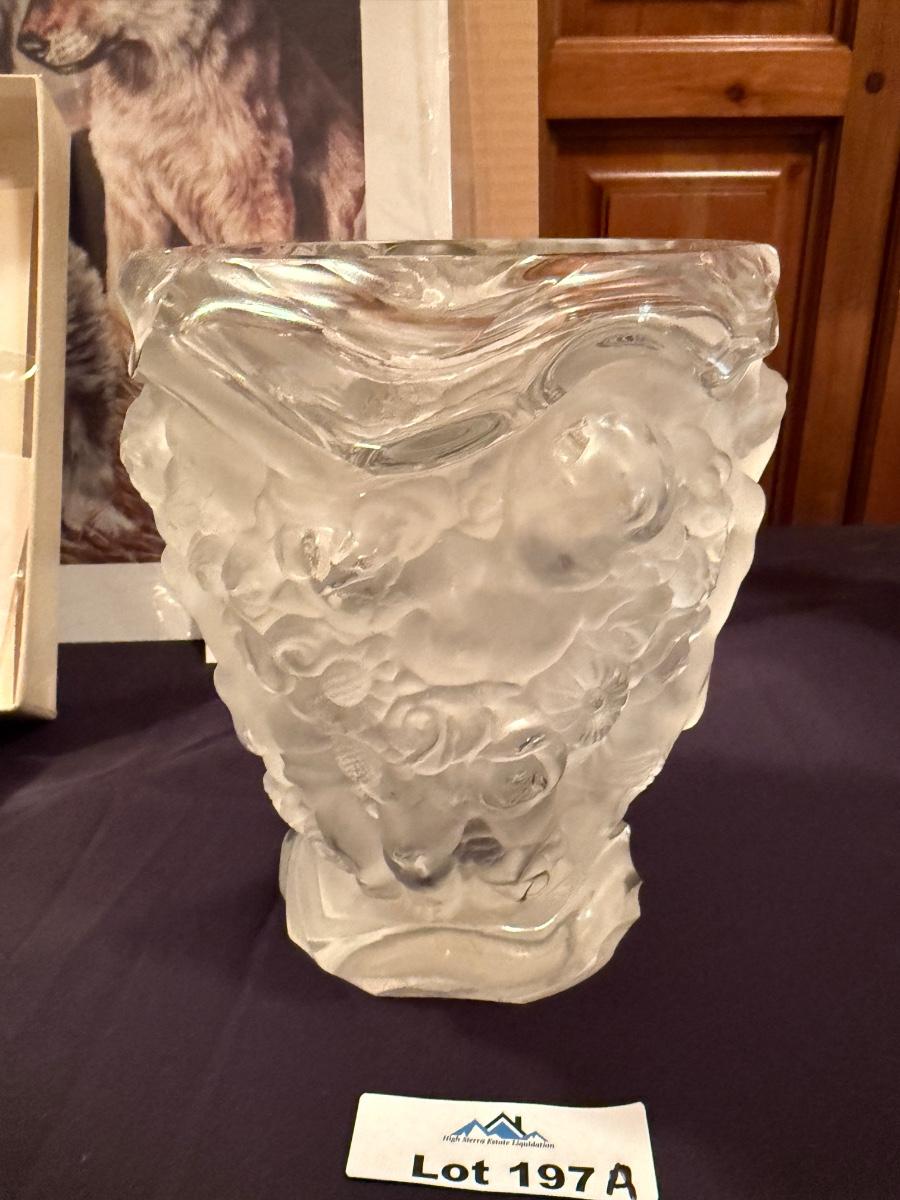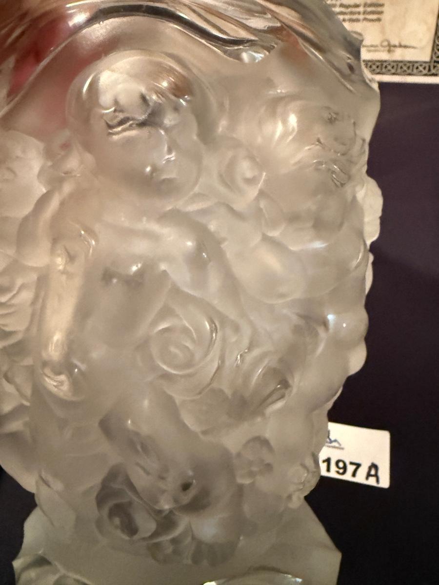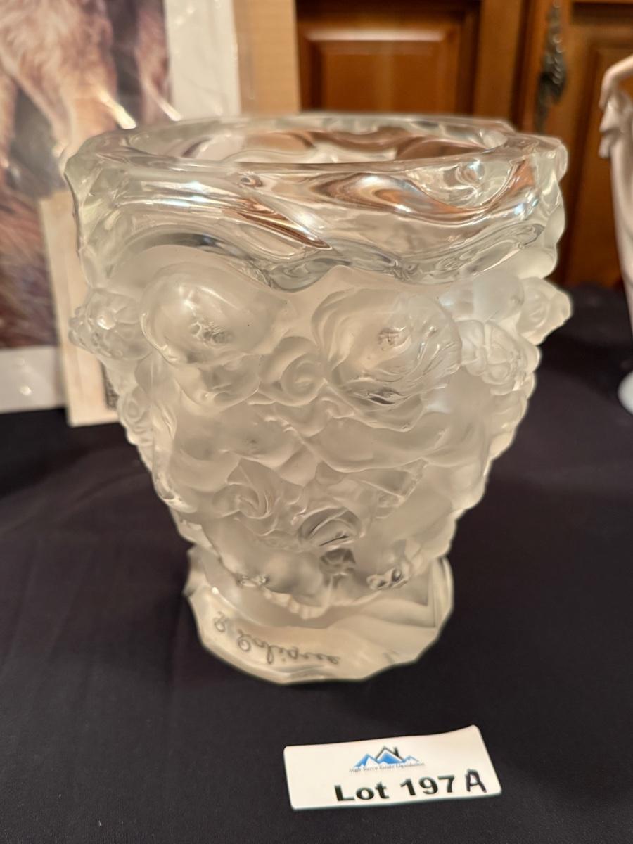 Signed " R. Lalique" on the bottom. Has a raised cherubs around the entire piece..