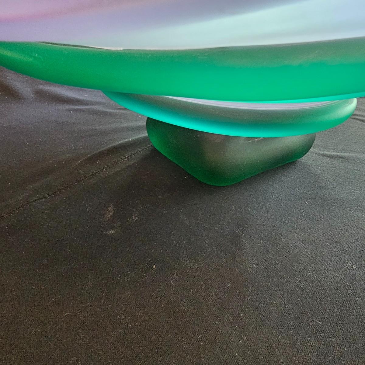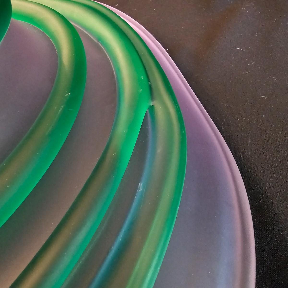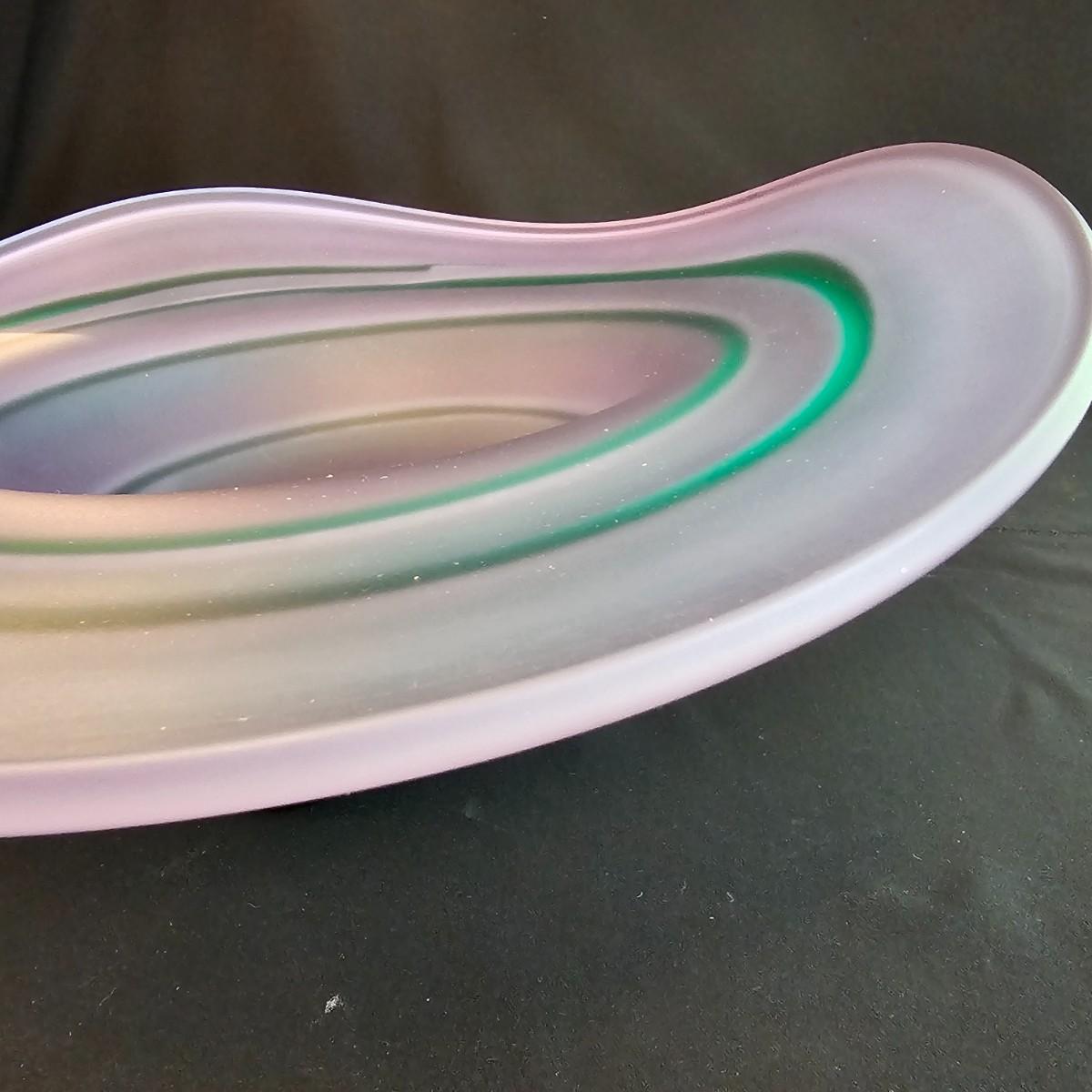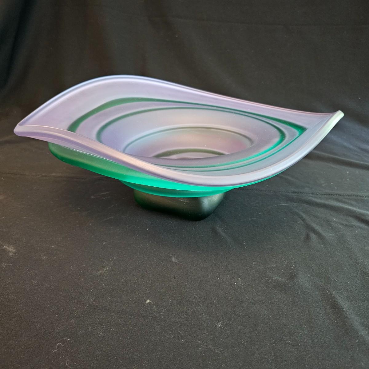 Swirling, flowing style of frosted glass and ribbon on attached base. Piece was acquired at a downtown Asheville gallery. Softly curving hues of lavender and green sit atop square black base with the name T Rush imprinted in it. Piece measures 17"D x 7"H at its extremes. See photos for details. Local pickup only.
