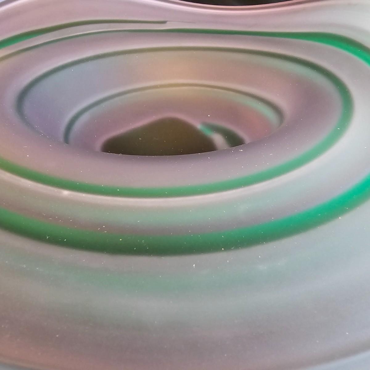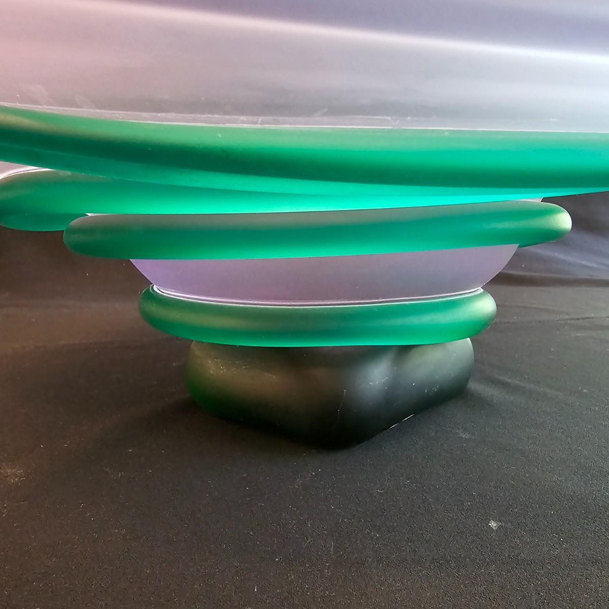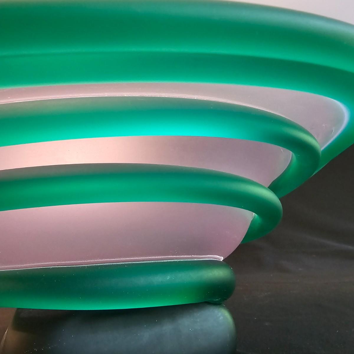 Swirling, flowing style of frosted glass and ribbon on attached base. Piece was acquired at a downtown Asheville gallery. Softly curving hues of lavender and green sit atop square black base with the name T Rush imprinted in it. Piece measures 17"D x 7"H at its extremes. See photos for details. Local pickup only.