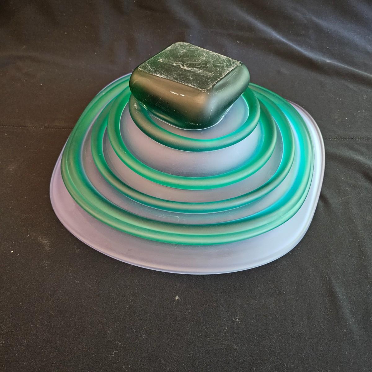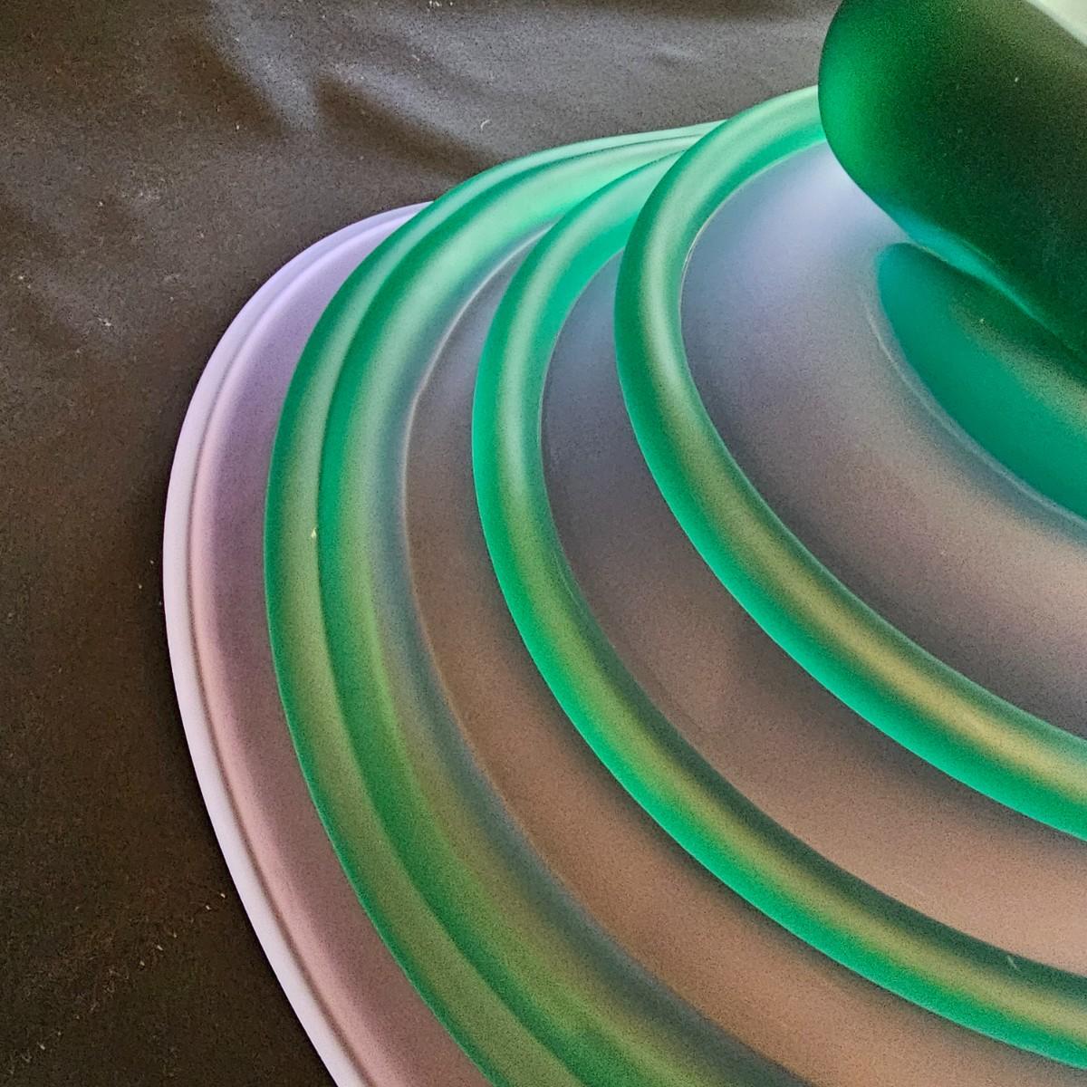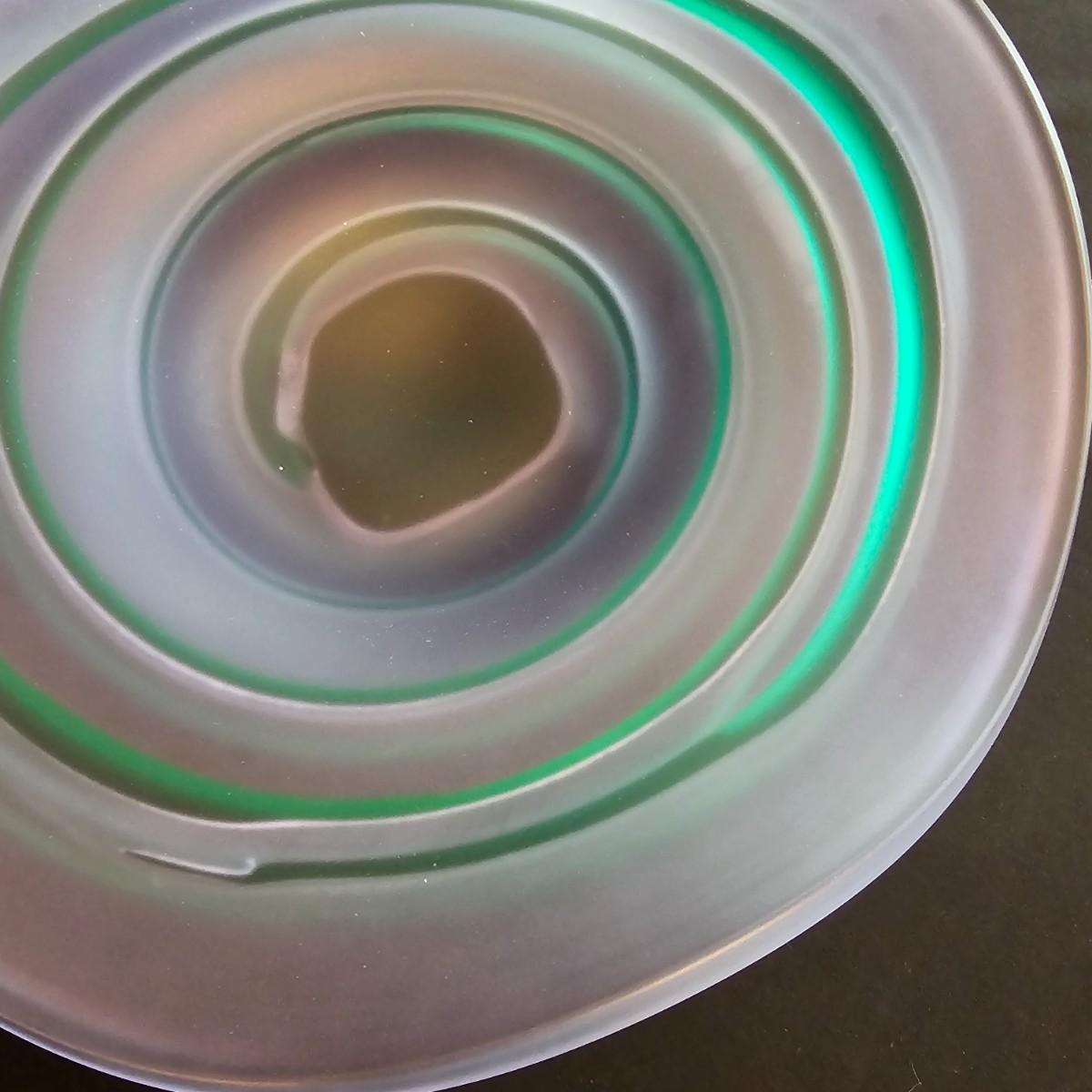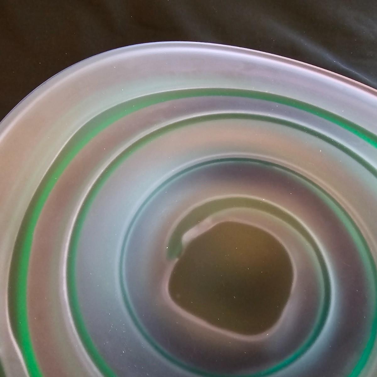 Swirling, flowing style of frosted glass and ribbon on attached base. Piece was acquired at a downtown Asheville gallery. Softly curving hues of lavender and green sit atop square black base with the name T Rush imprinted in it. Piece measures 17"D x 7"H at its extremes. See photos for details. Local pickup only.