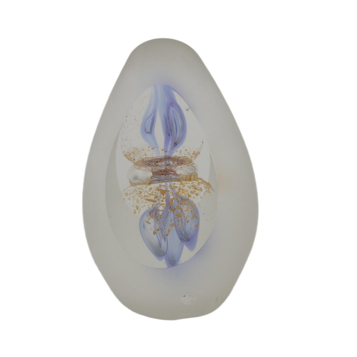 Frosted glass egg art sculpture. Small wear to one part of frost, no other issues found. Gorgeous piece! Measures 2" x 2" x 4", weighs 1 lb 1.2 oz.