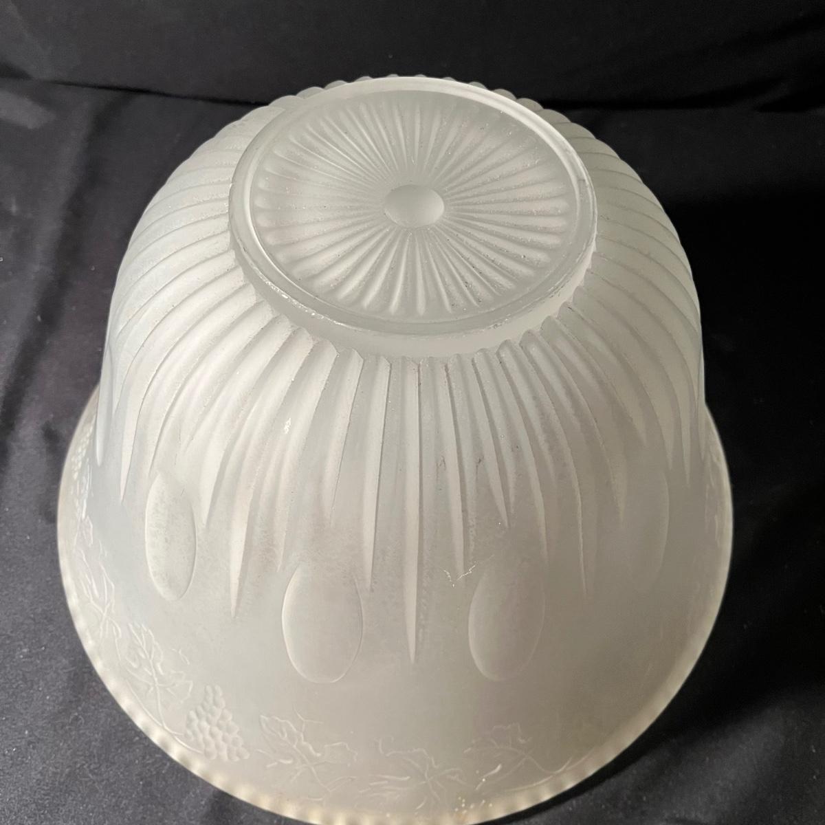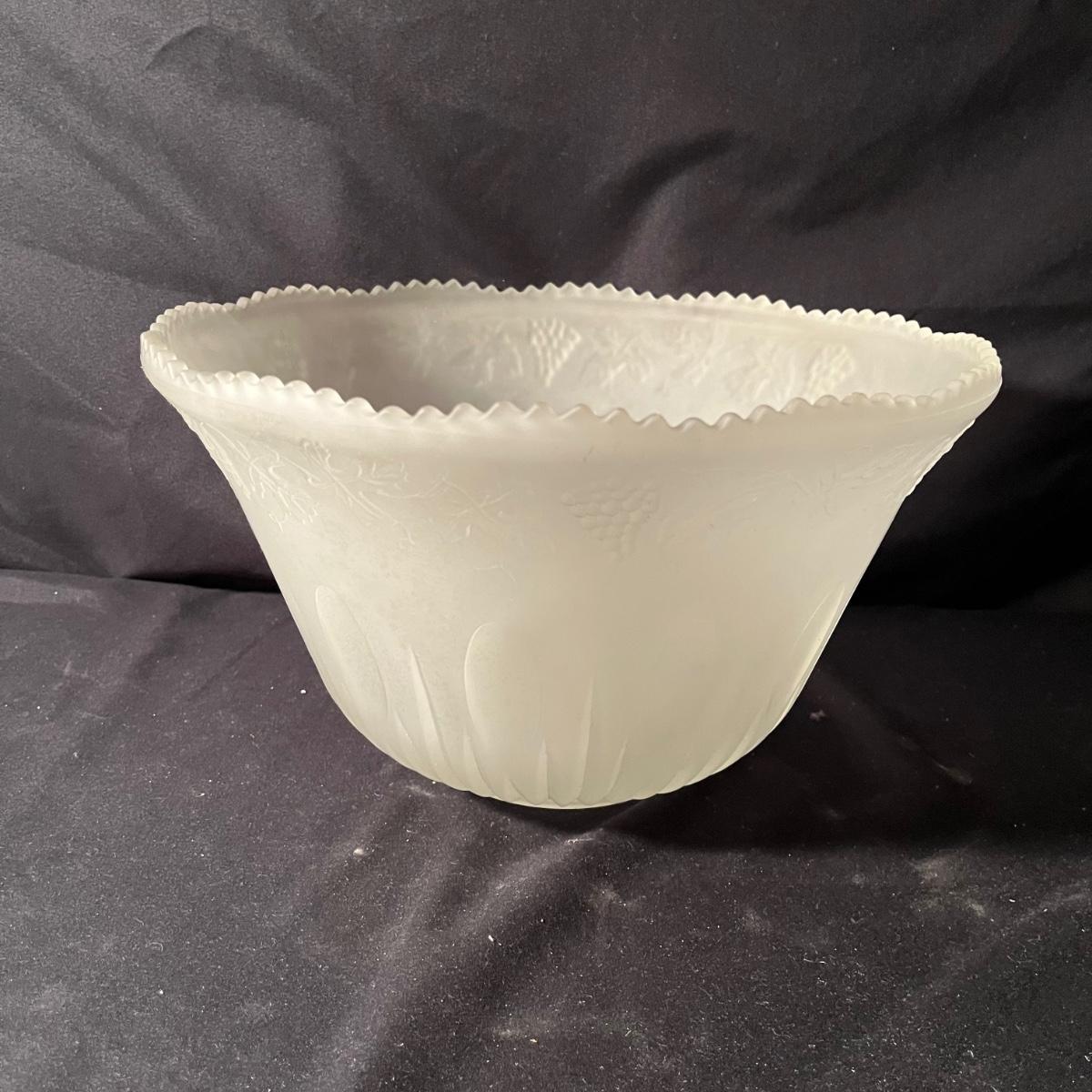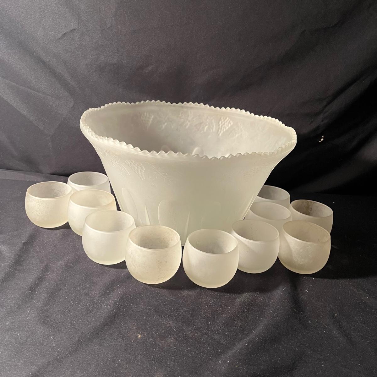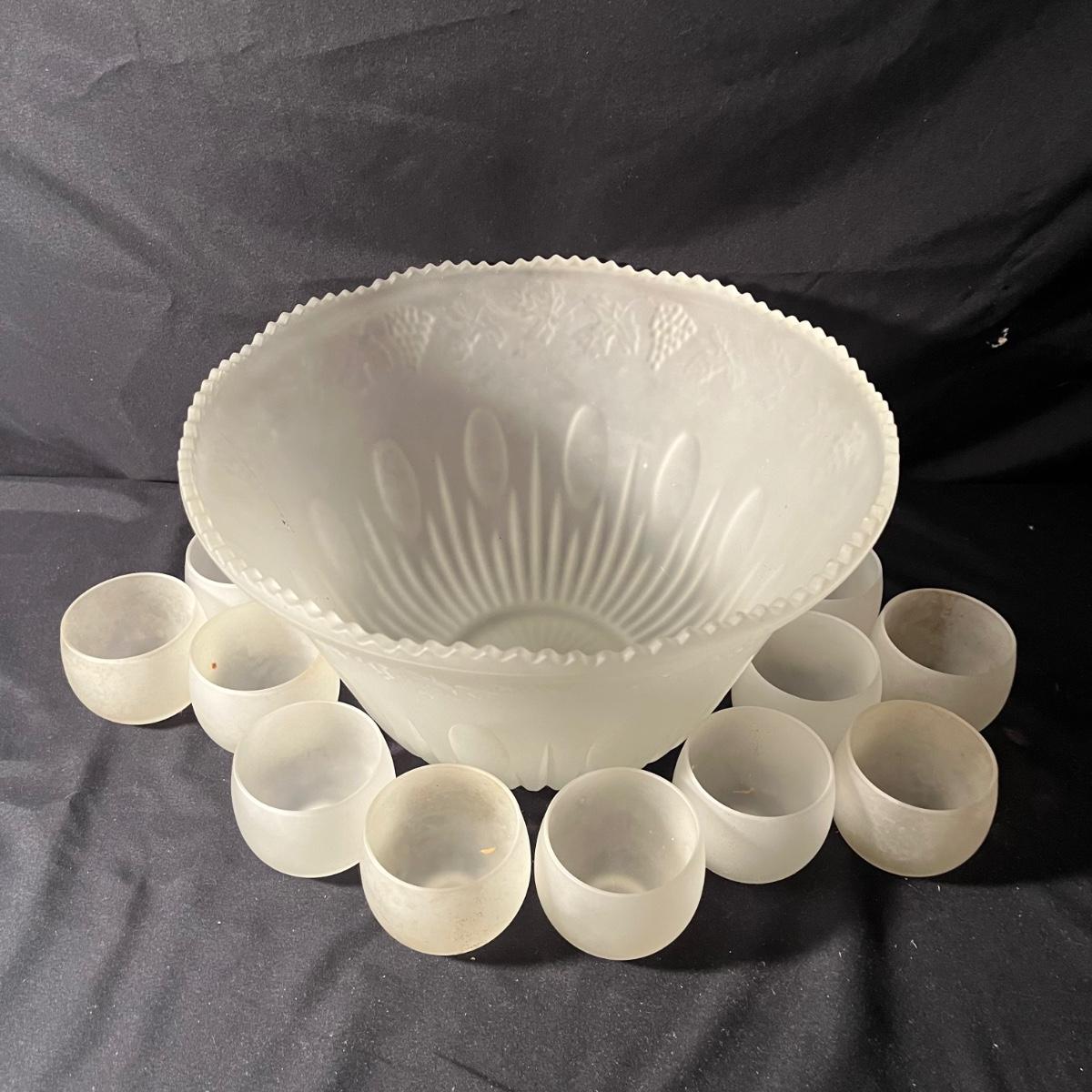 Lot includes a frosted glass punch bowl that measures 12”D x 7” tall and eleven frosted glasses.