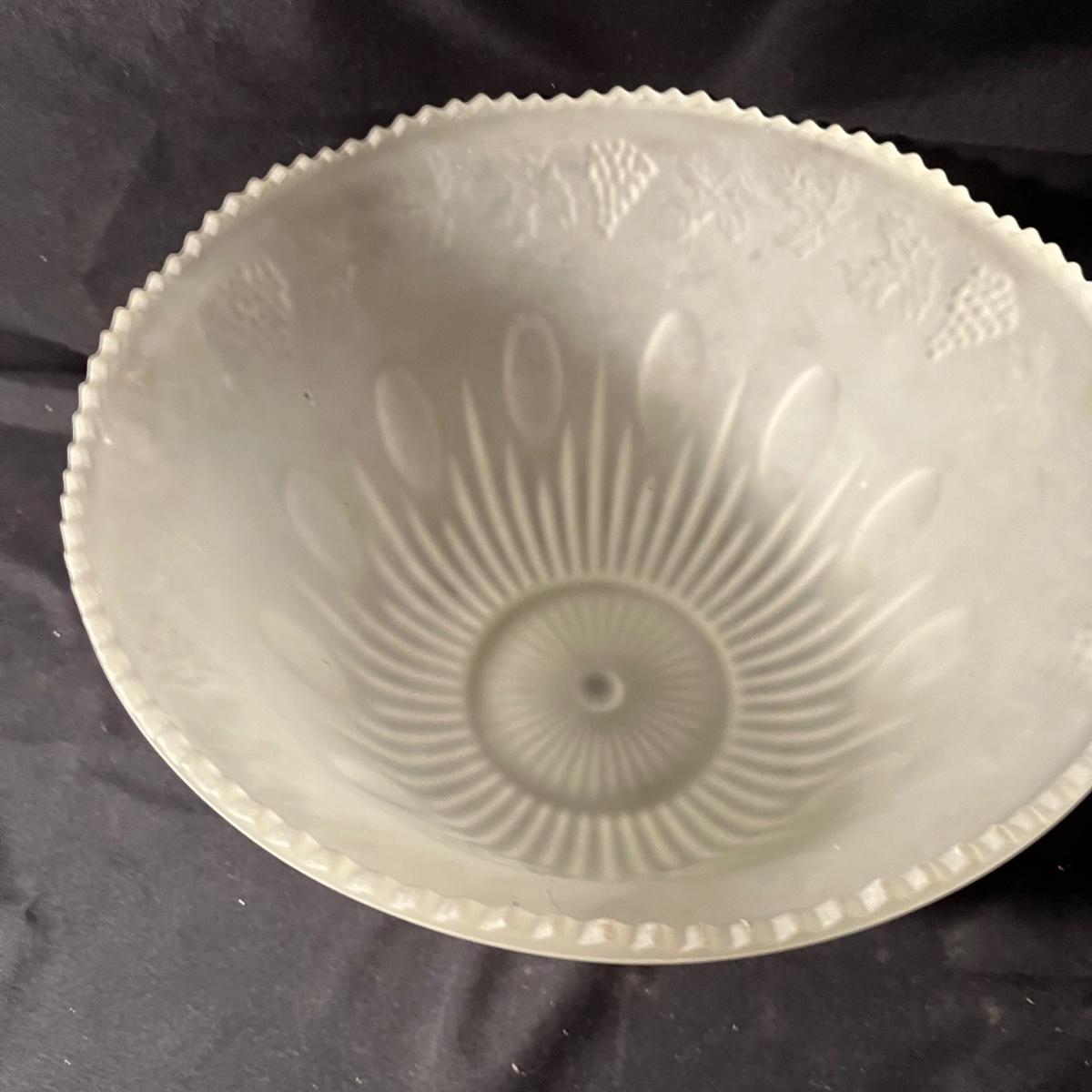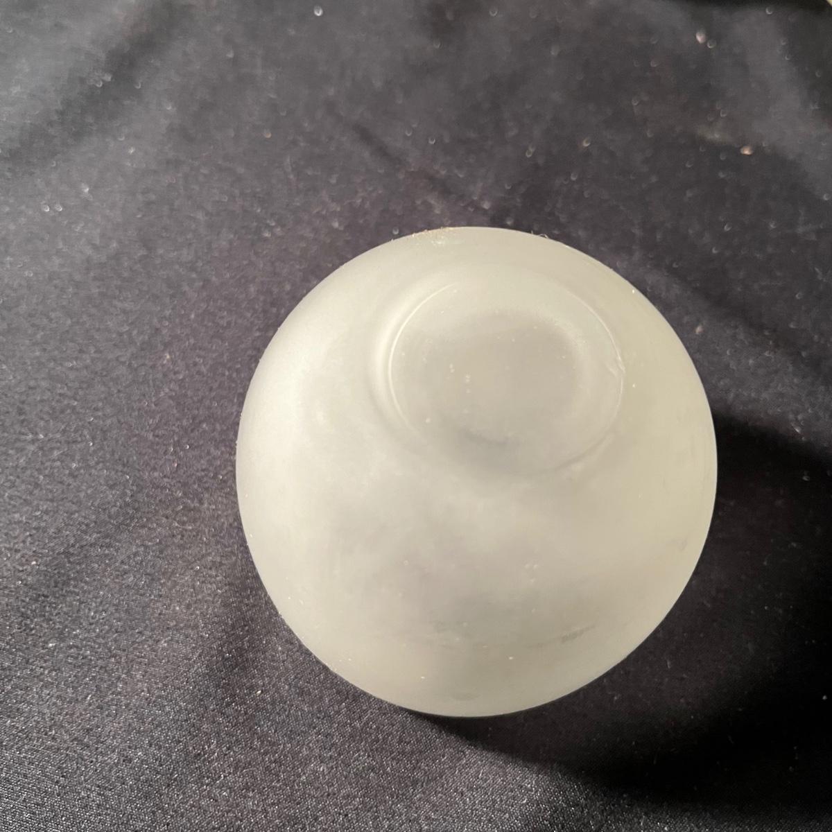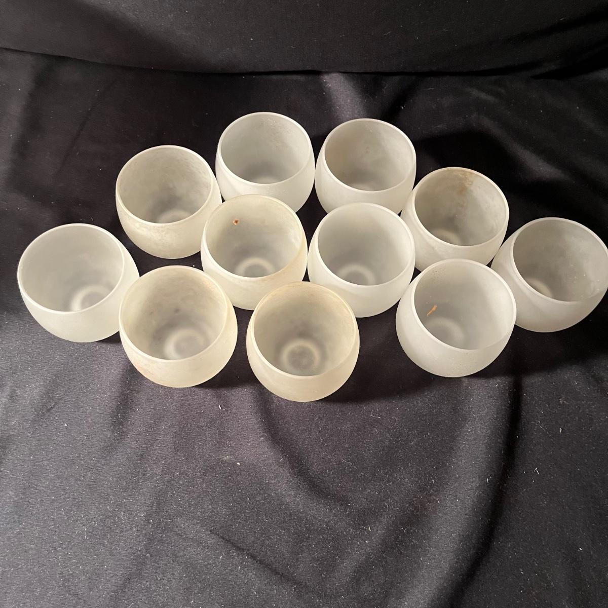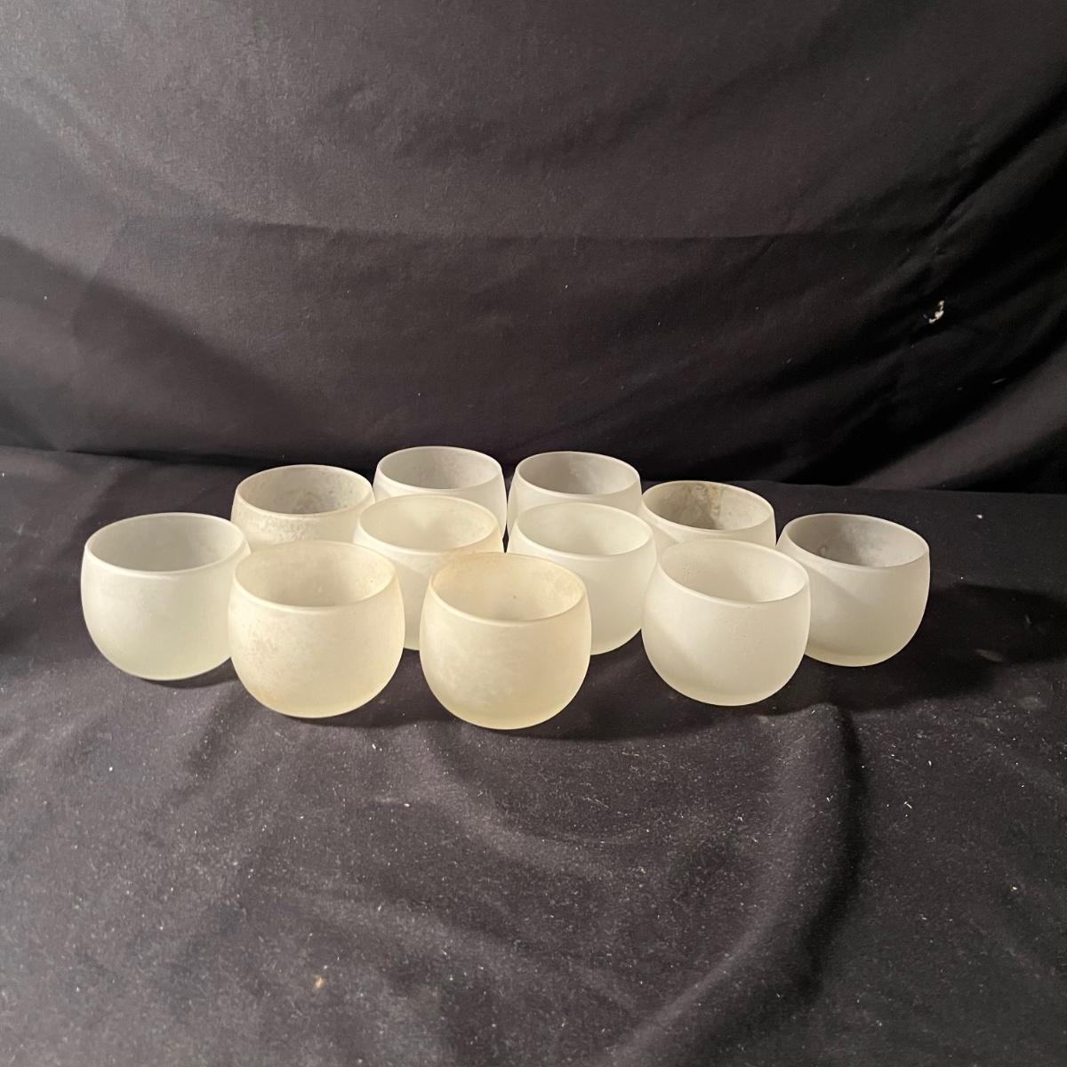 Lot includes a frosted glass punch bowl that measures 12”D x 7” tall and eleven frosted glasses.