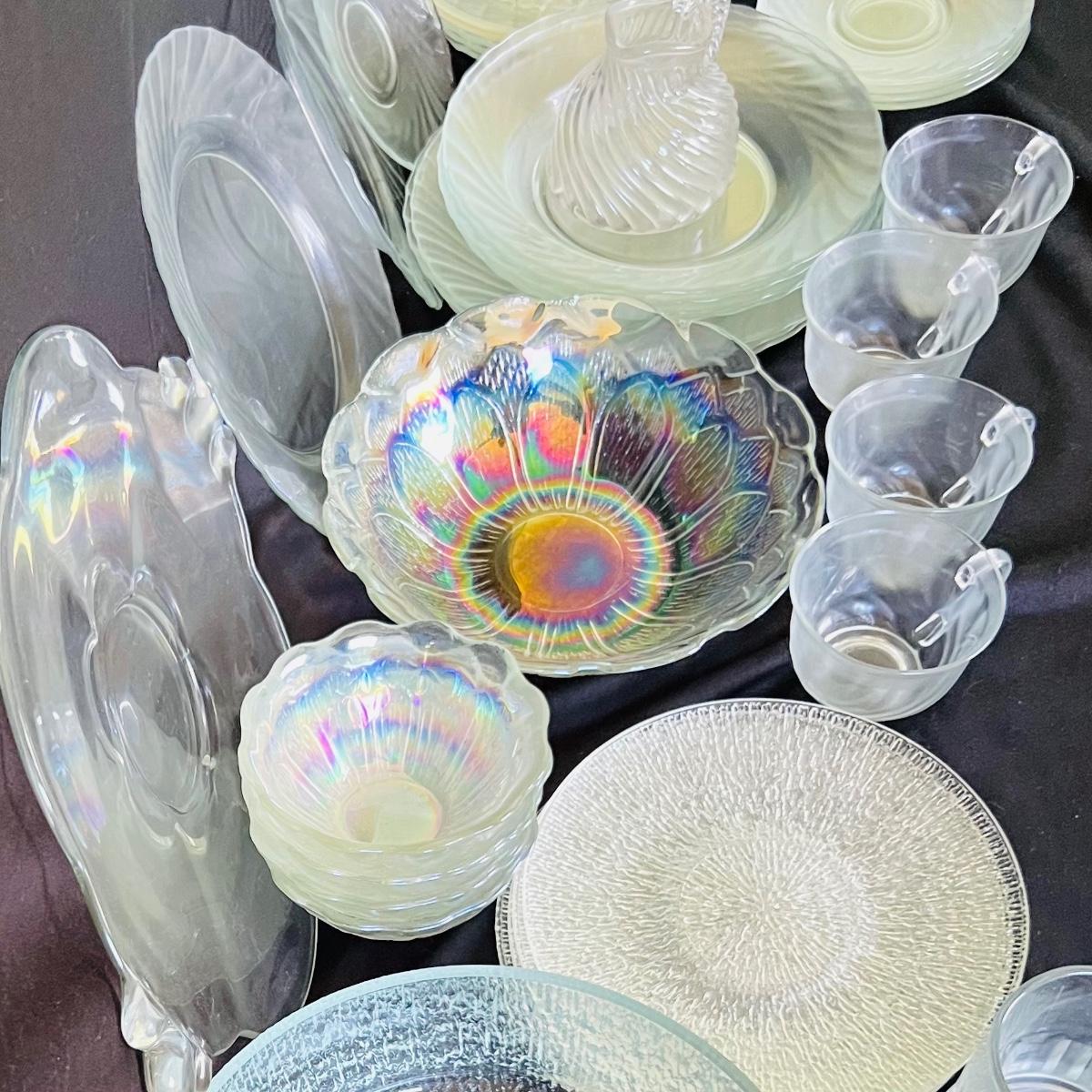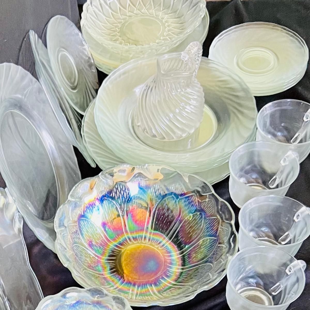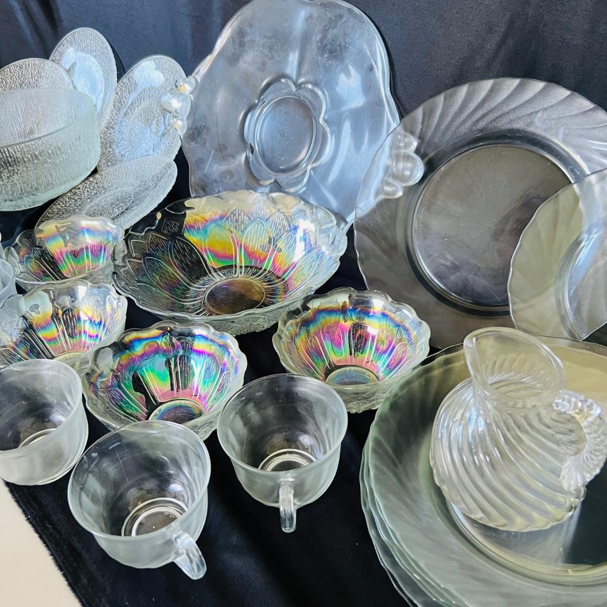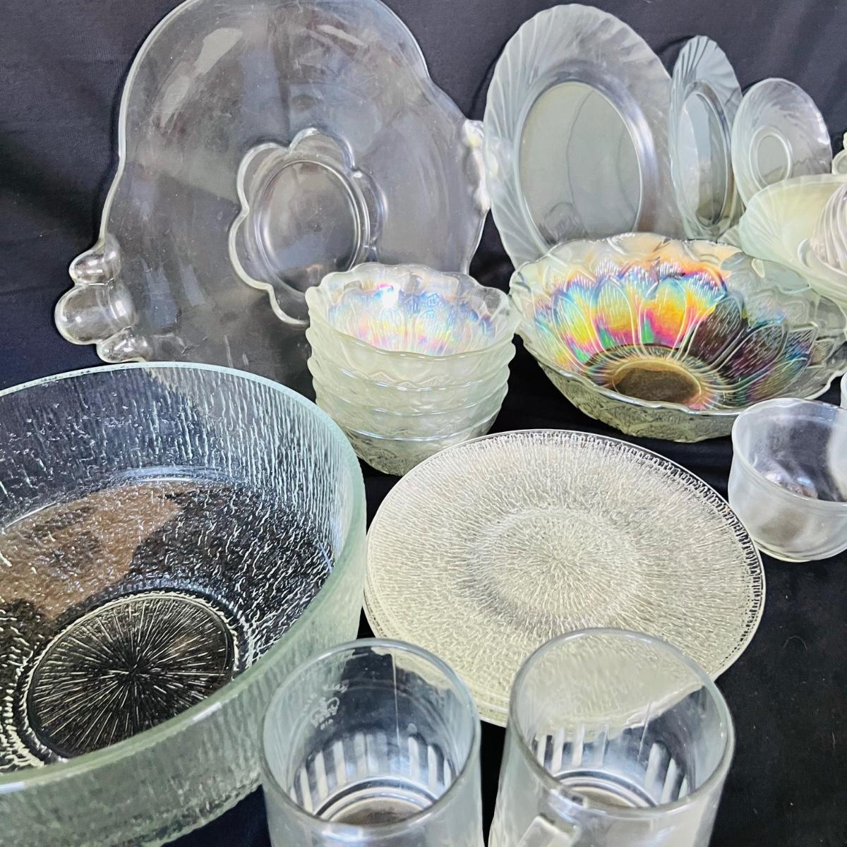 Large collection of pretty frosted and decorative glass dinnerware and bowls. Lot includes one large 9”D with four small bowls, one 9”D bowl with four small plates. One 14” platter, four dinner plates, four salad plates, four dessert plates, five saucers, four coffee cups and More.