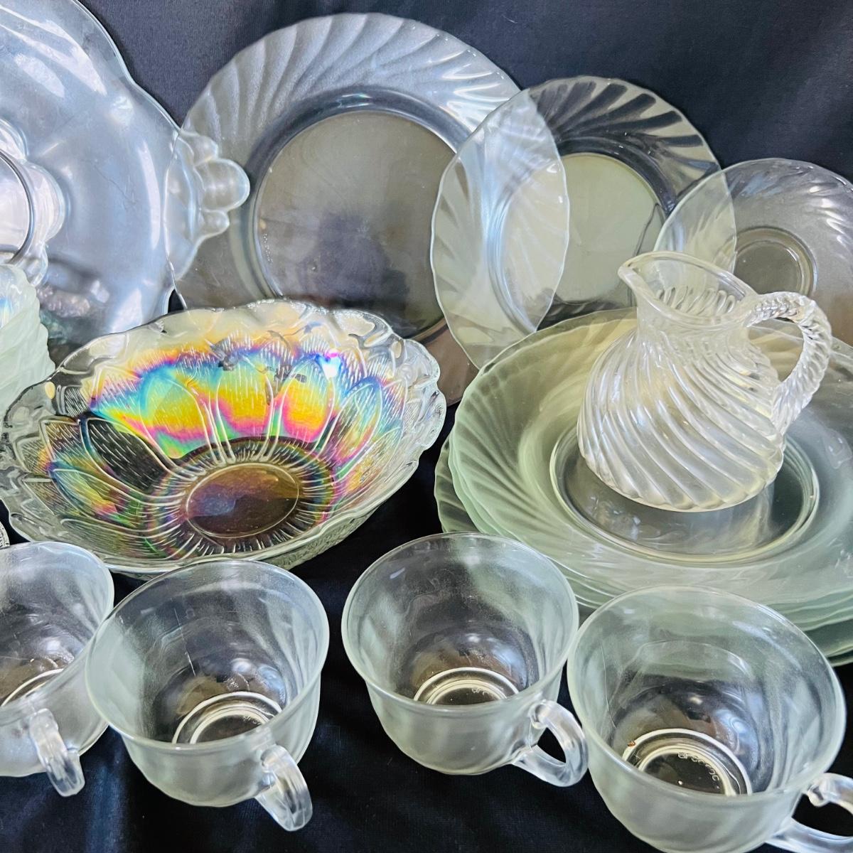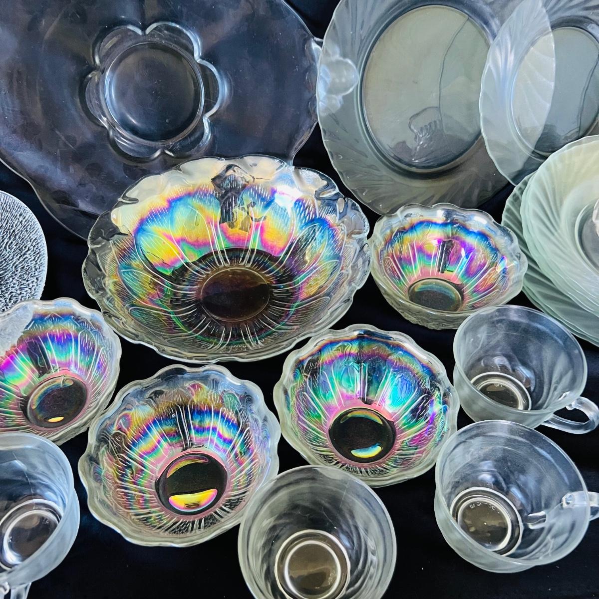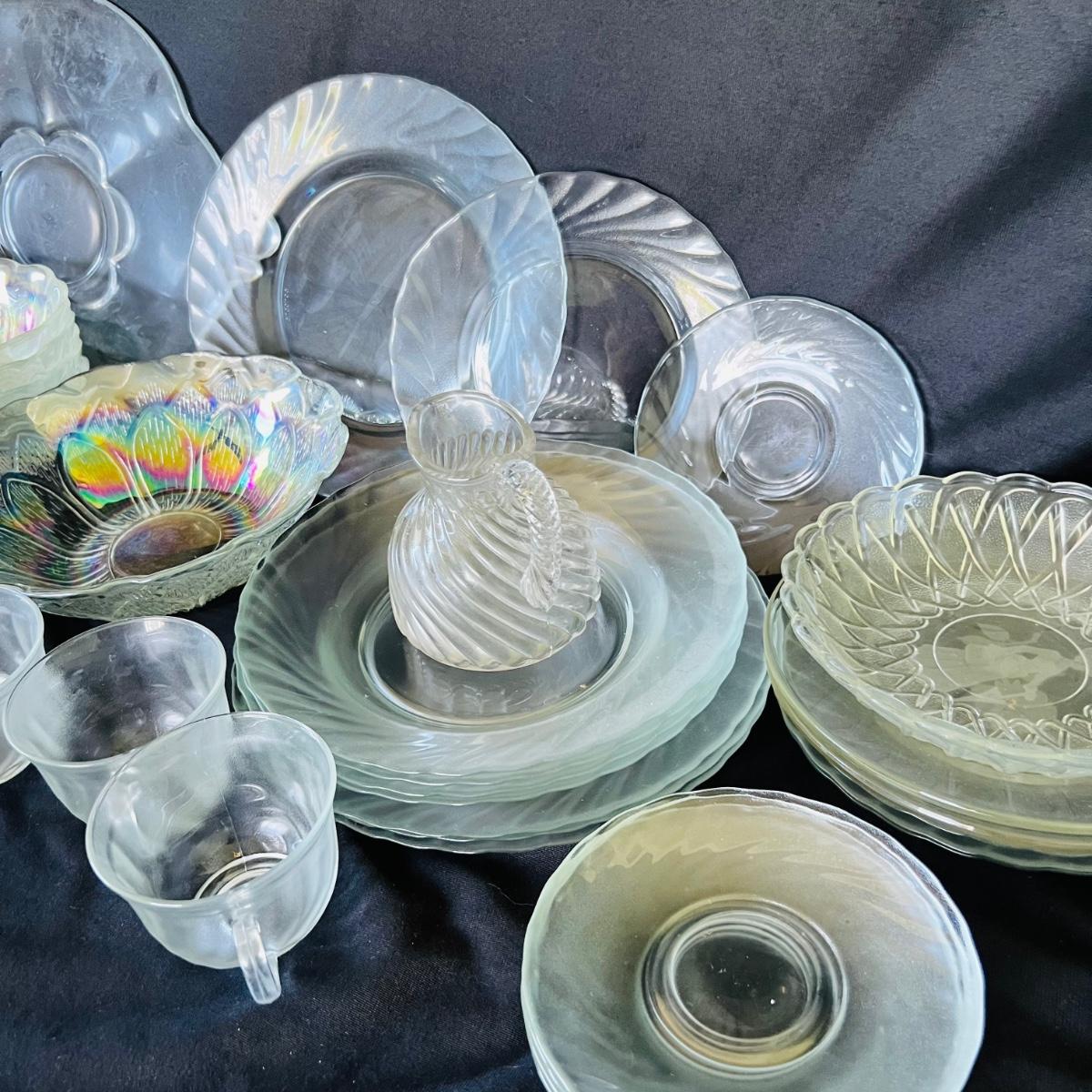 Large collection of pretty frosted and decorative glass dinnerware and bowls. Lot includes one large 9”D with four small bowls, one 9”D bowl with four small plates. One 14” platter, four dinner plates, four salad plates, four dessert plates, five saucers, four coffee cups and More.