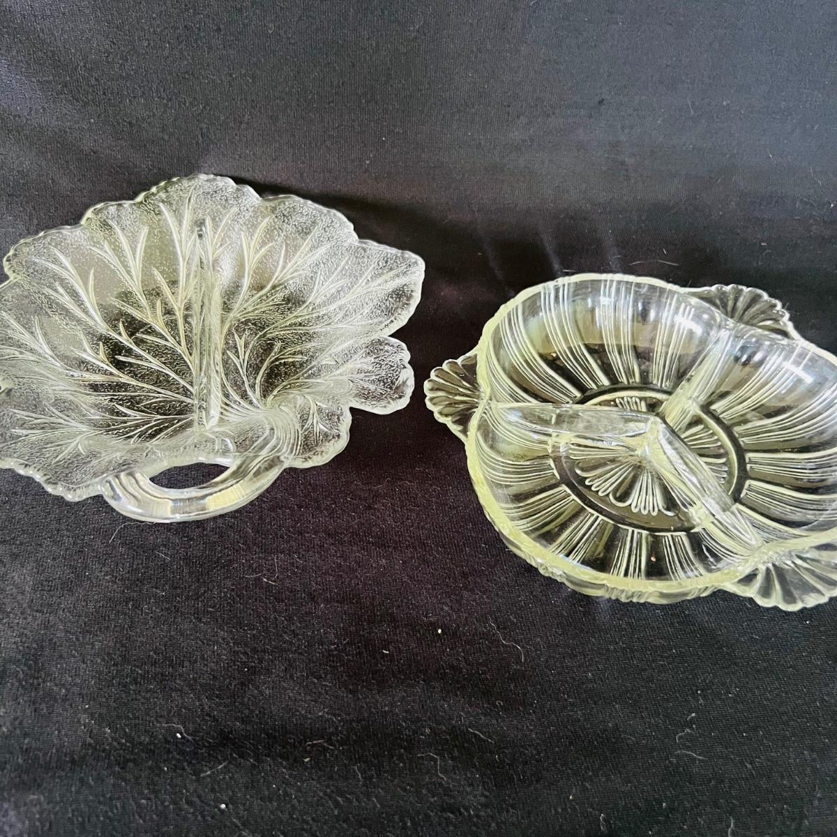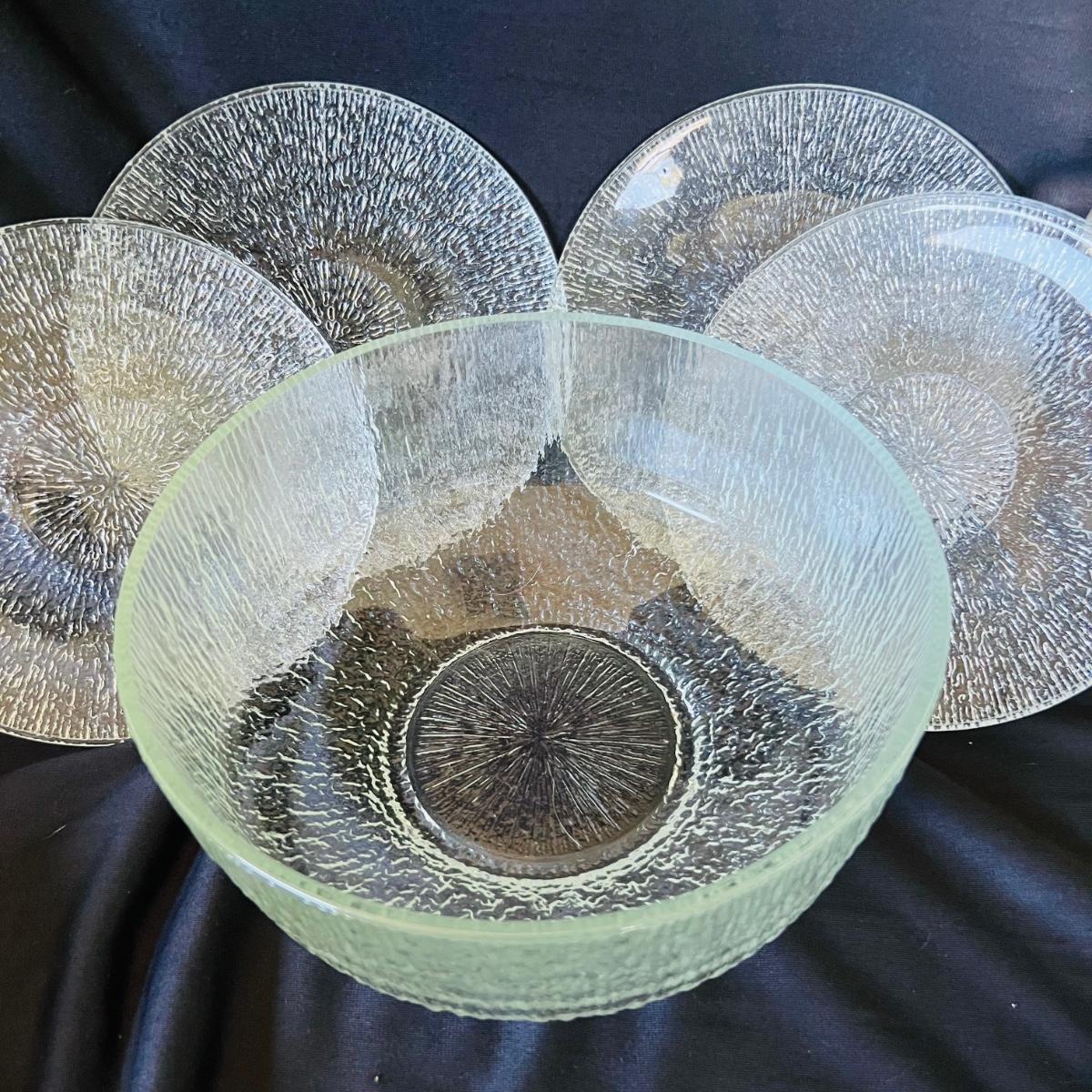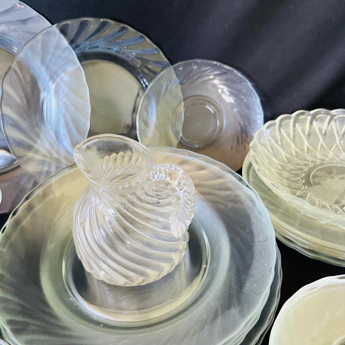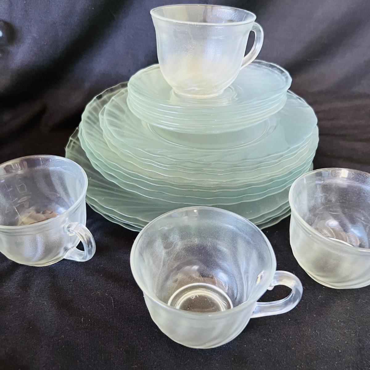 Large collection of pretty frosted and decorative glass dinnerware and bowls. Lot includes one large 9”D with four small bowls, one 9”D bowl with four small plates. One 14” platter, four dinner plates, four salad plates, four dessert plates, five saucers, four coffee cups and More.