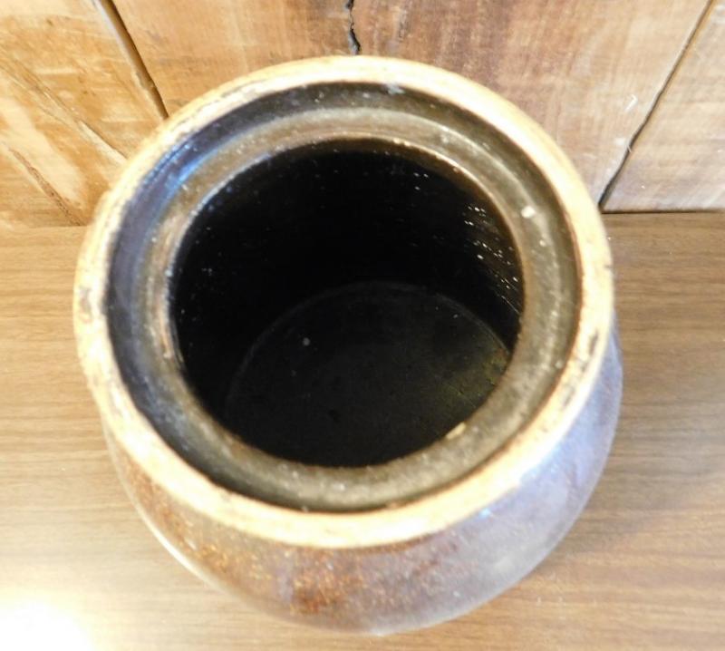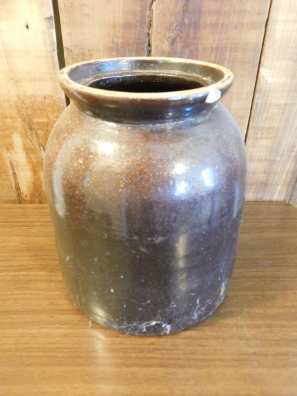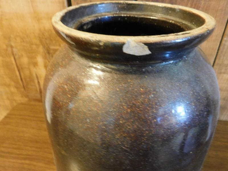 Fruit Crock Pottery Jar has chip at lip otherwise nice weight and color