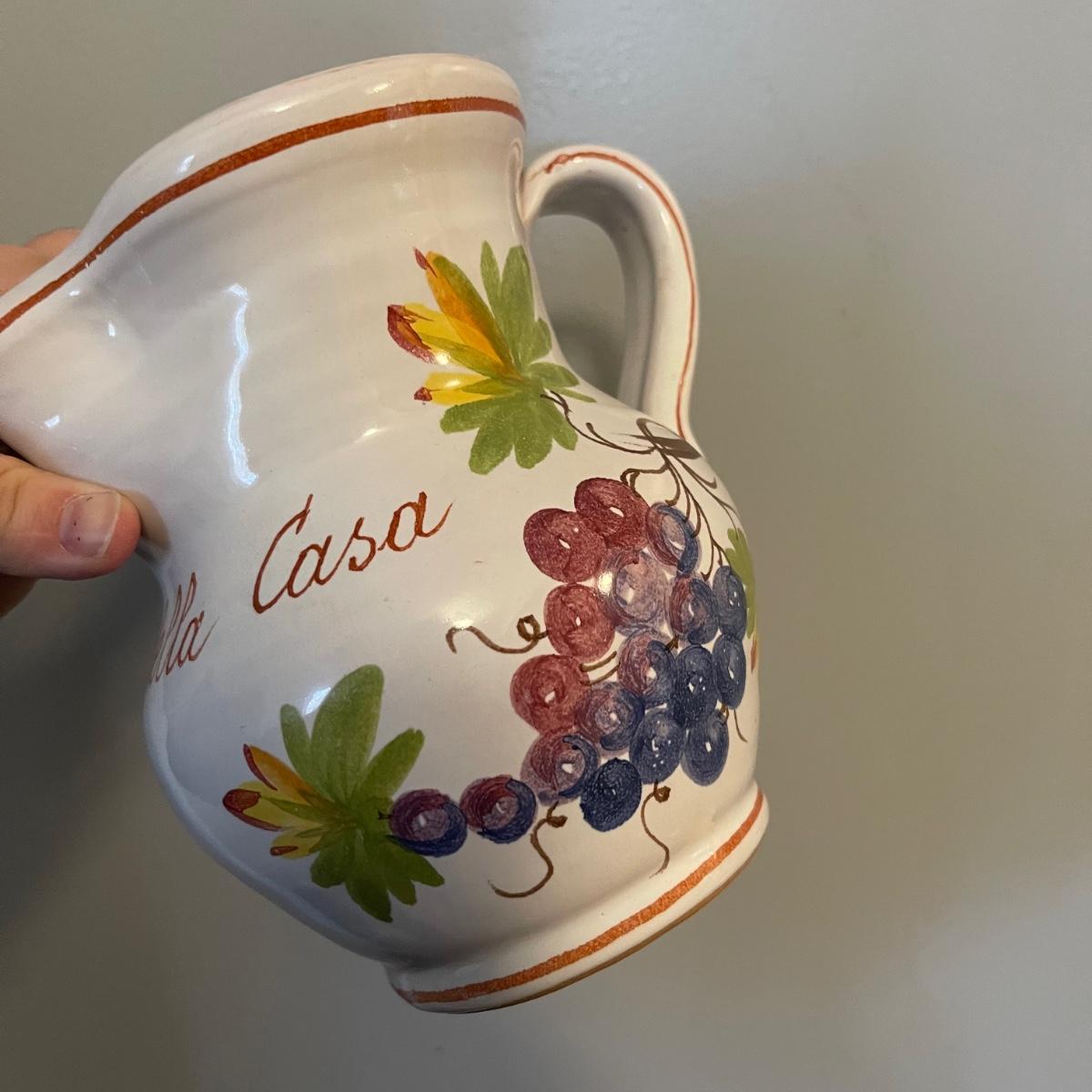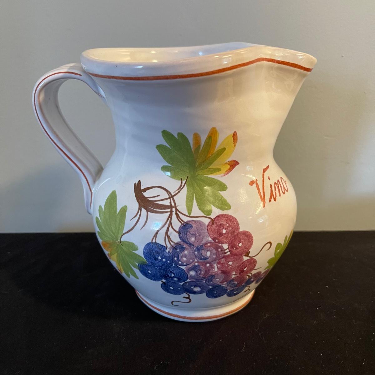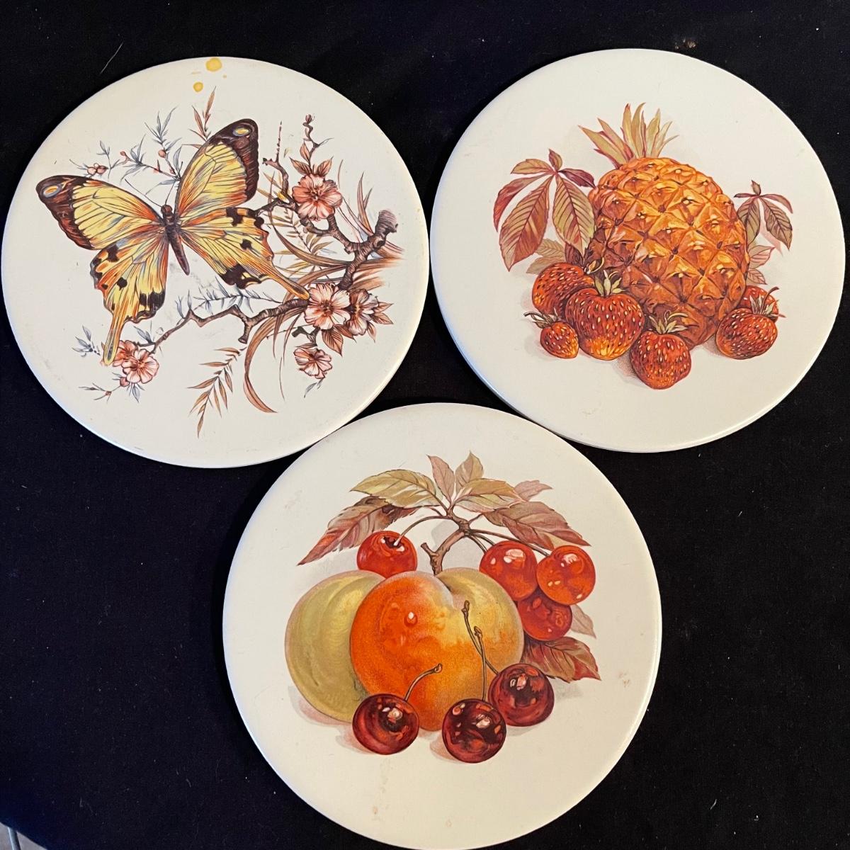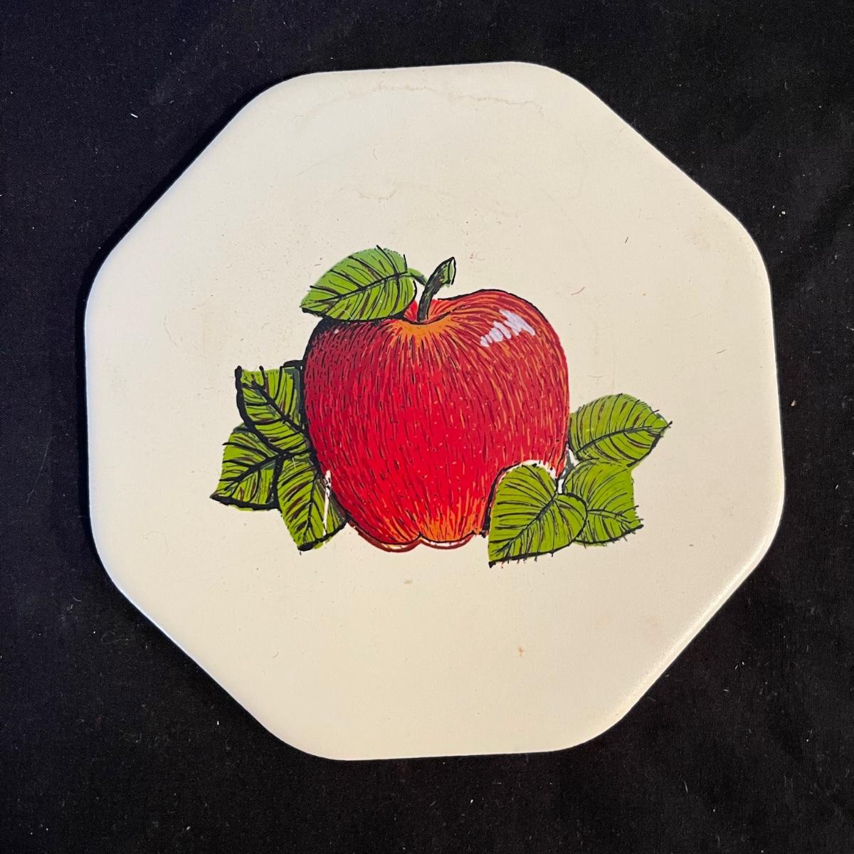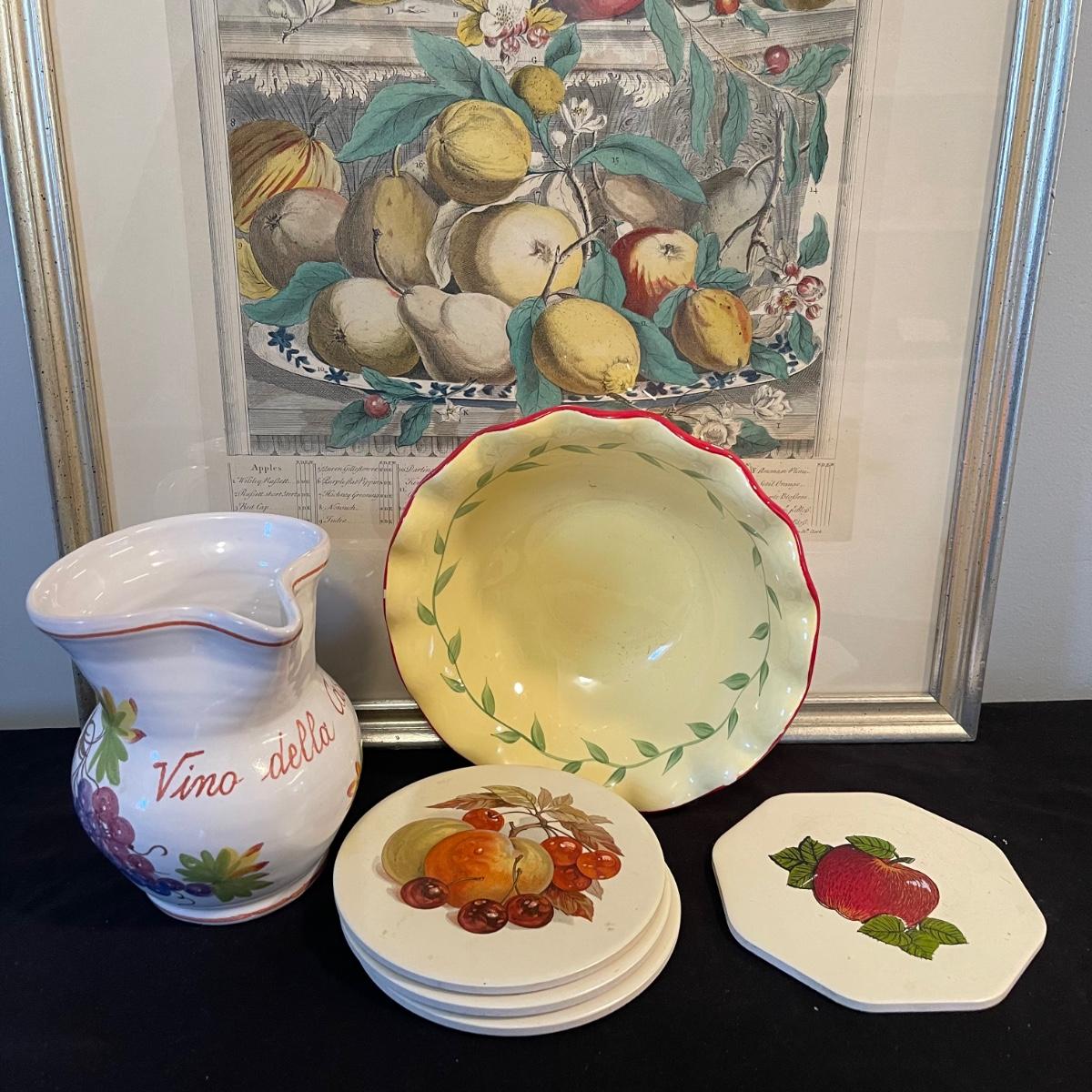 Starting this lot is a 18.5” x 24” printed artwork of fruits that’s been framed by J.J. Kormann & Son in Roanoke, VA. Next, a handmade ceramic pitcher decorated with fruit and “Vino Della Casa”, has the signature A. Zen Nove, and is 6.5” tall. There are three round ceramic trivets, an octagonal trivet with an apple, and lastly, a Pfaltzgraff painted bowl.