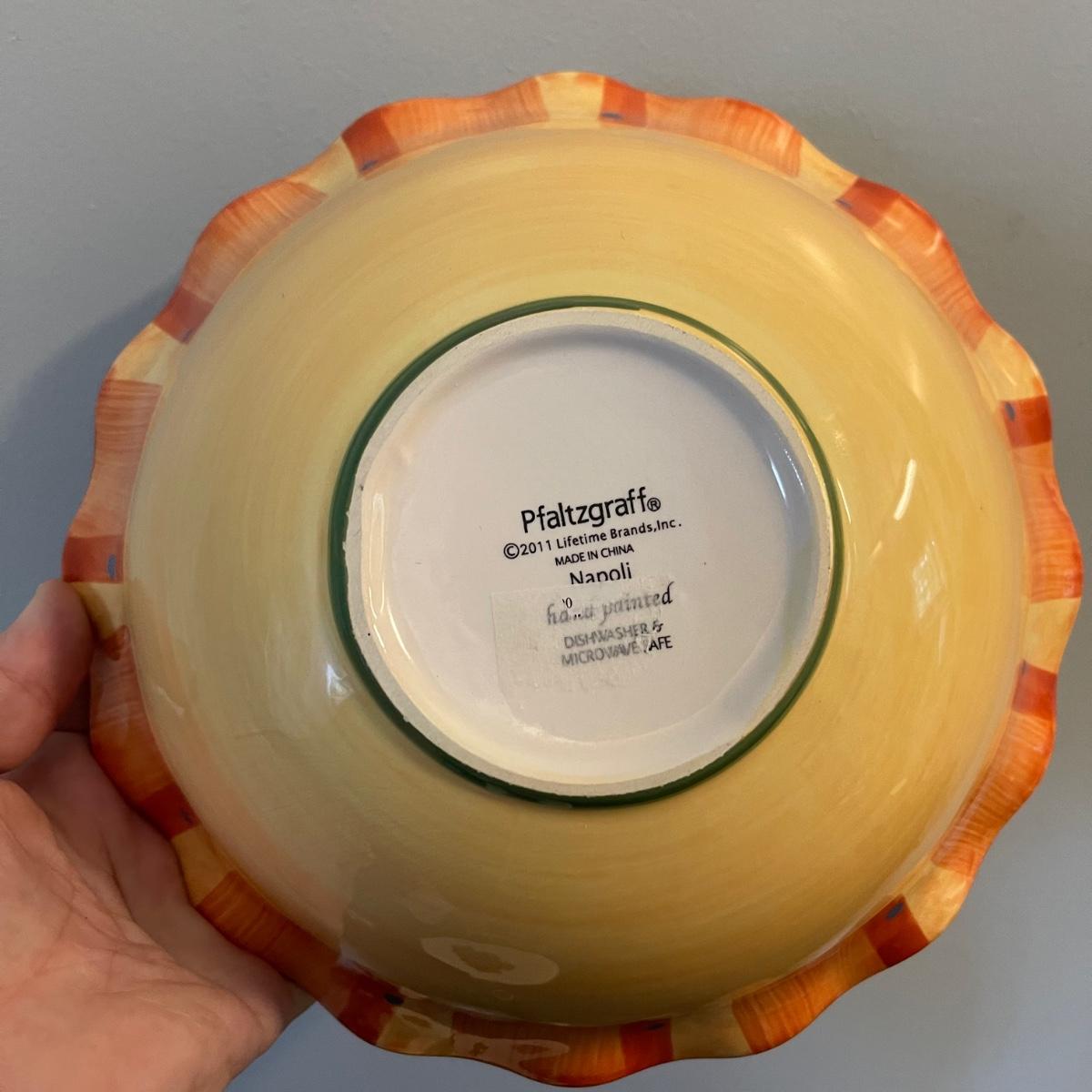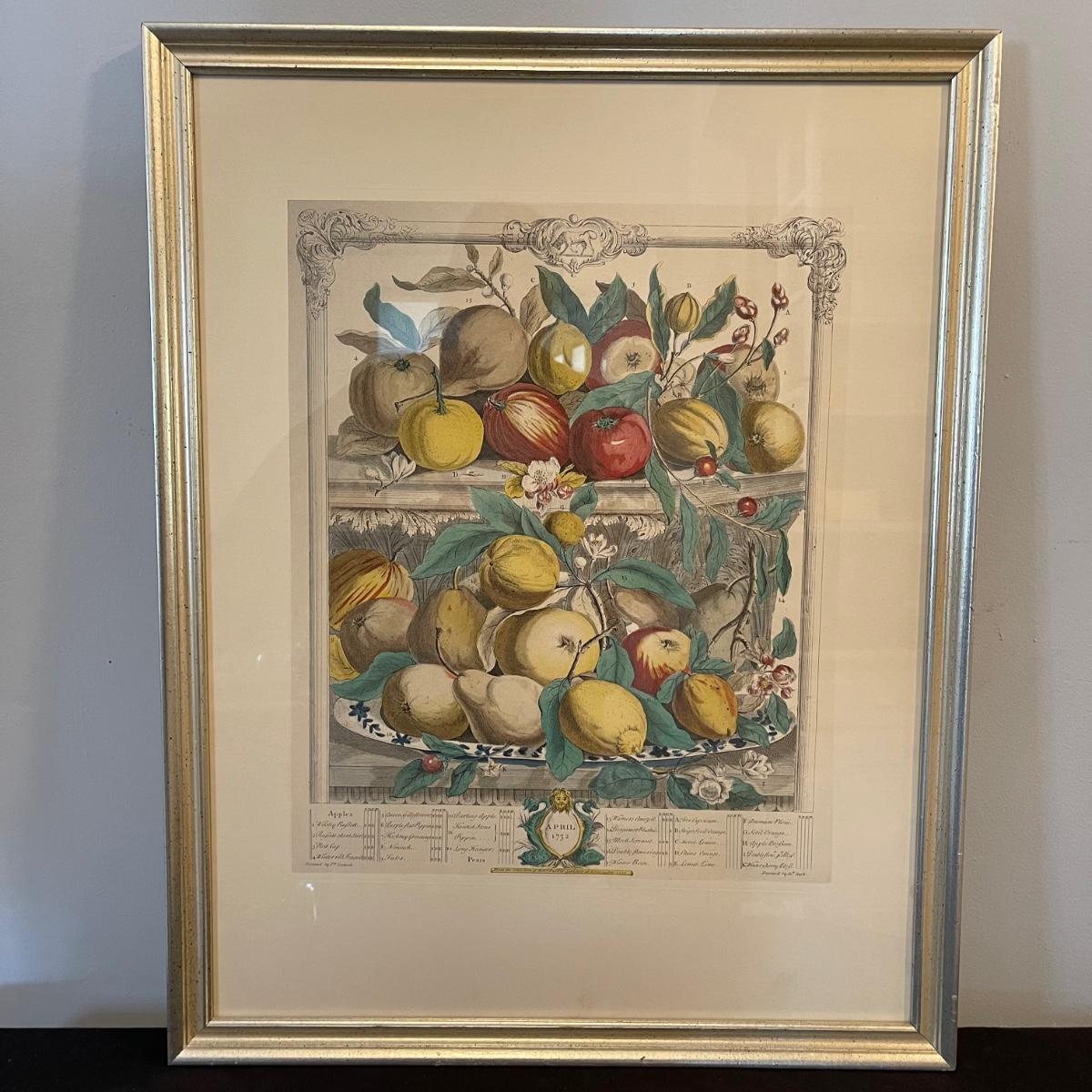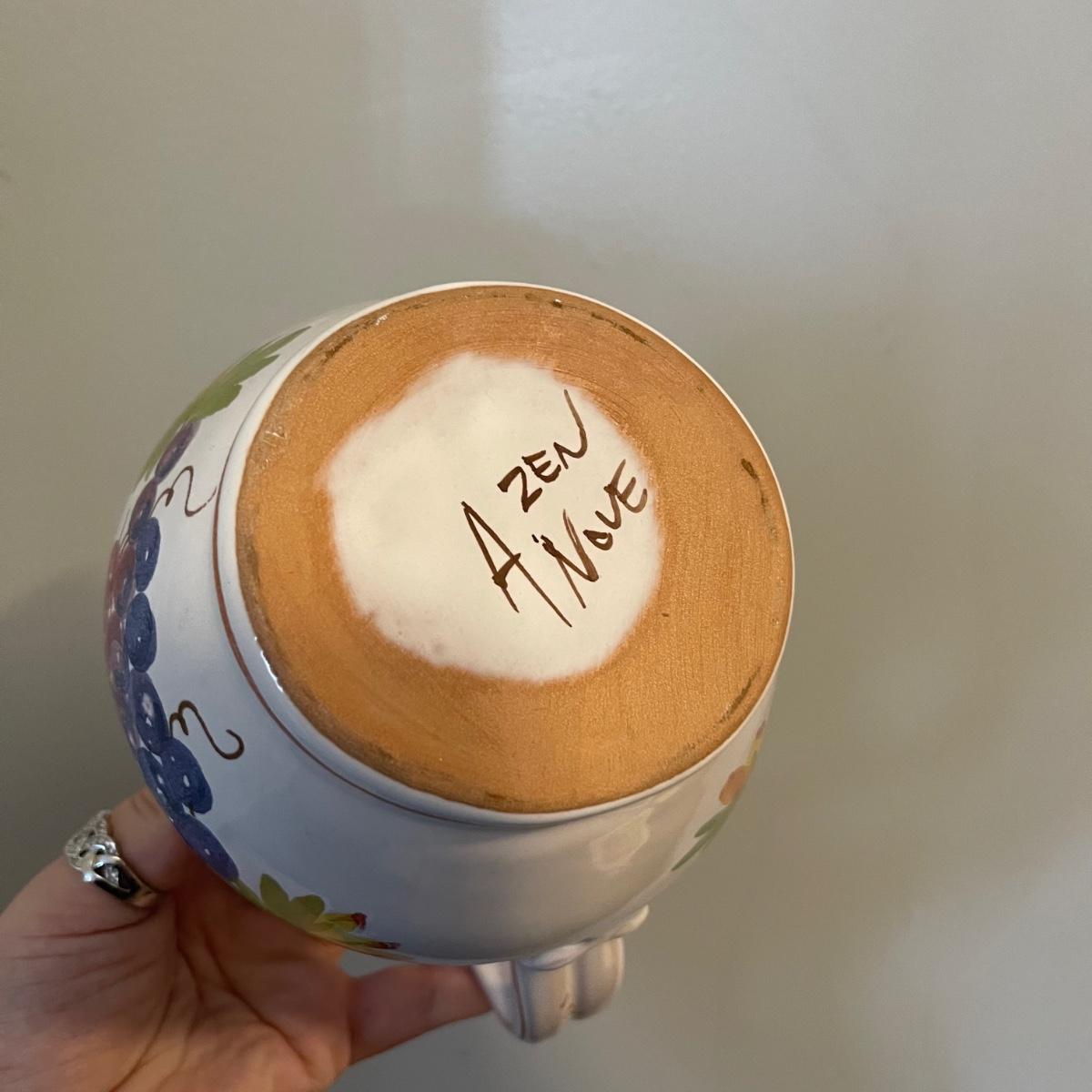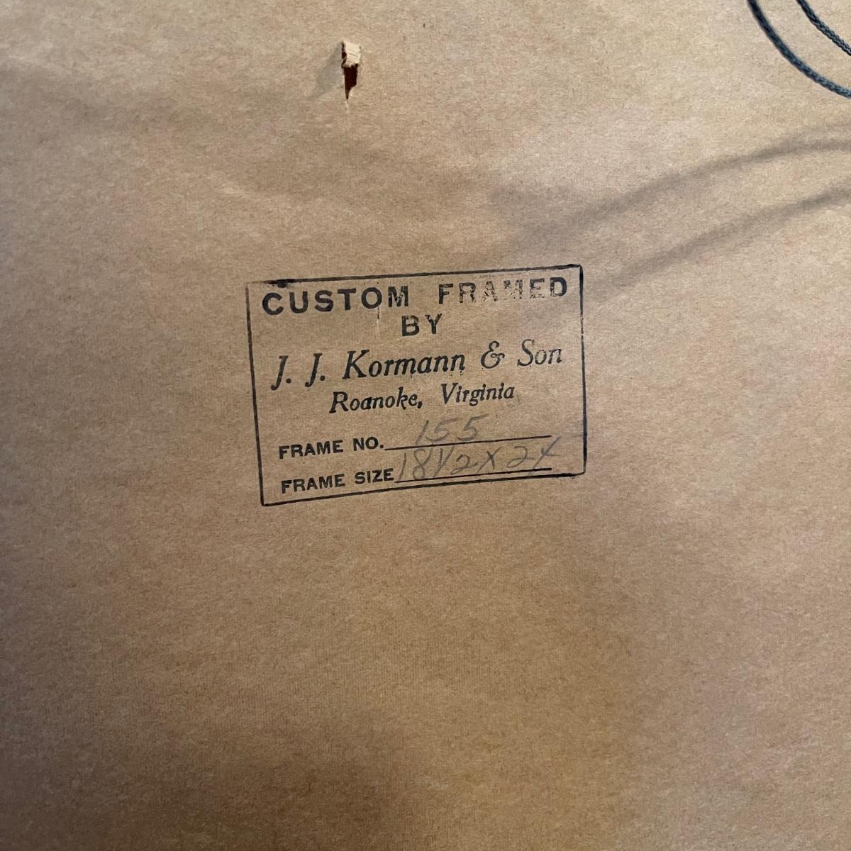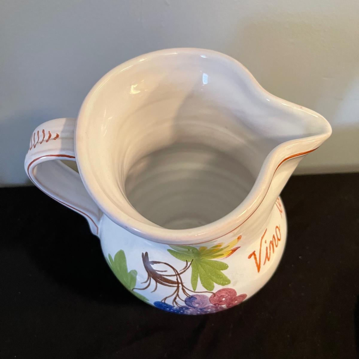 Starting this lot is a 18.5” x 24” printed artwork of fruits that’s been framed by J.J. Kormann & Son in Roanoke, VA. Next, a handmade ceramic pitcher decorated with fruit and “Vino Della Casa”, has the signature A. Zen Nove, and is 6.5” tall. There are three round ceramic trivets, an octagonal trivet with an apple, and lastly, a Pfaltzgraff painted bowl.