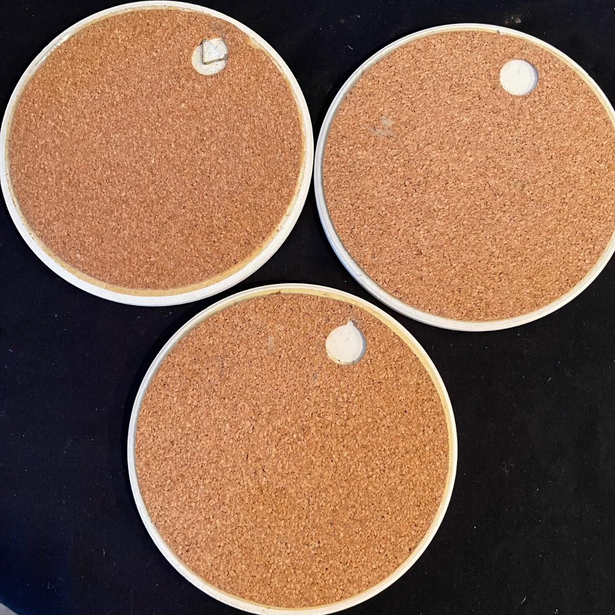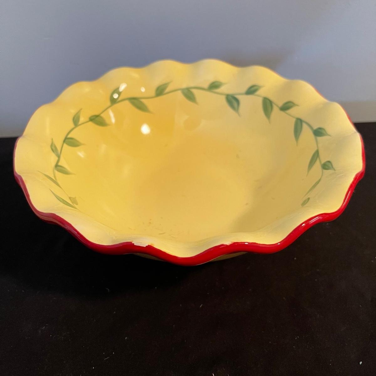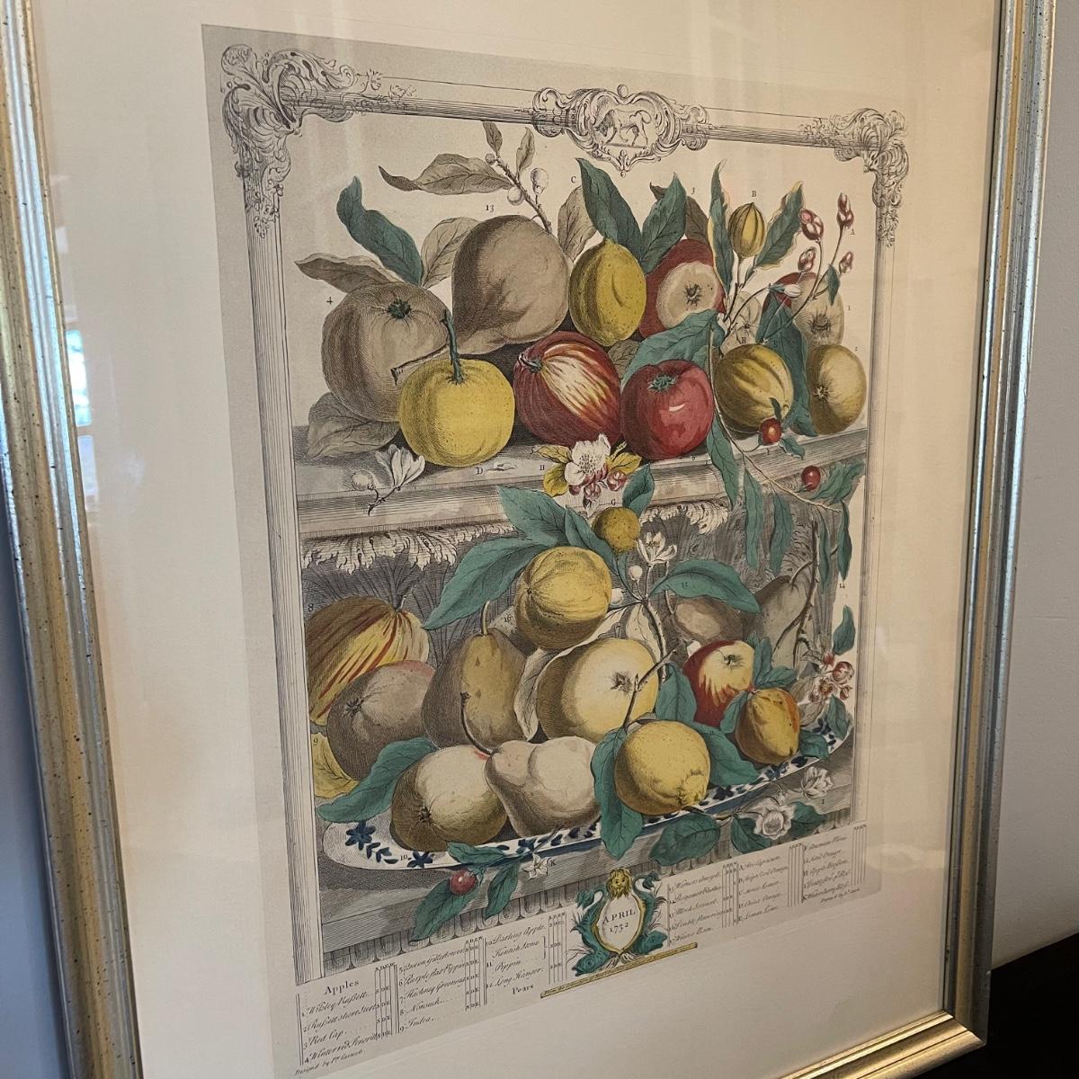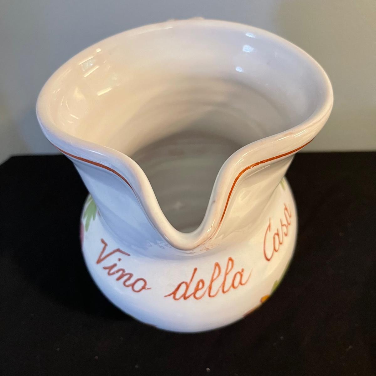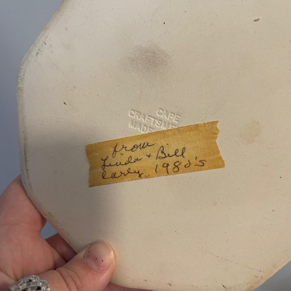 Starting this lot is a 18.5” x 24” printed artwork of fruits that’s been framed by J.J. Kormann & Son in Roanoke, VA. Next, a handmade ceramic pitcher decorated with fruit and “Vino Della Casa”, has the signature A. Zen Nove, and is 6.5” tall. There are three round ceramic trivets, an octagonal trivet with an apple, and lastly, a Pfaltzgraff painted bowl.