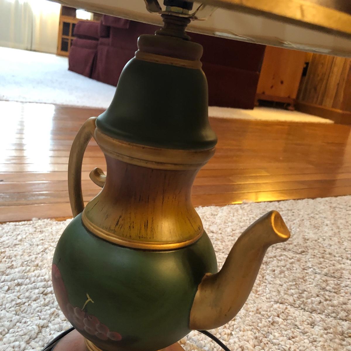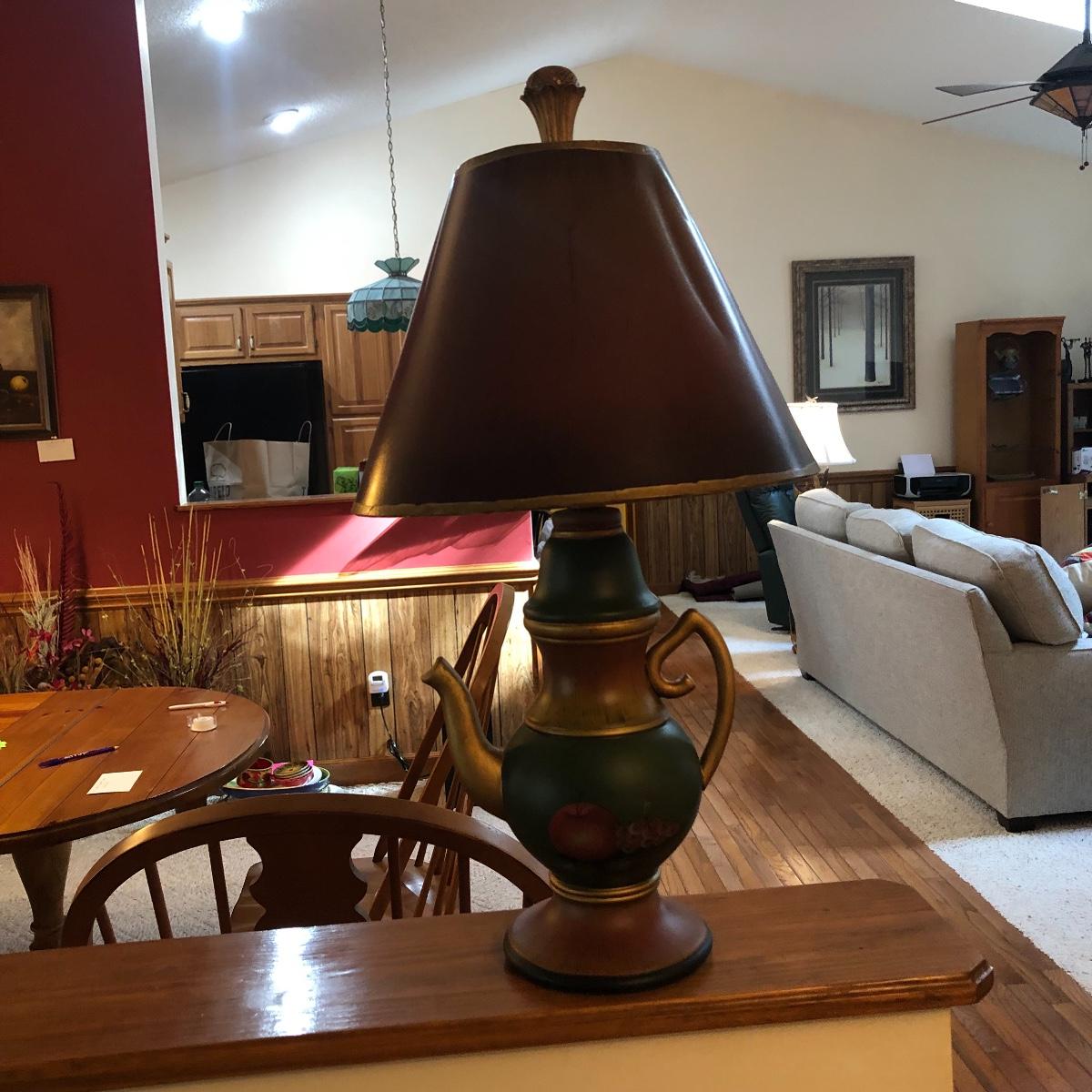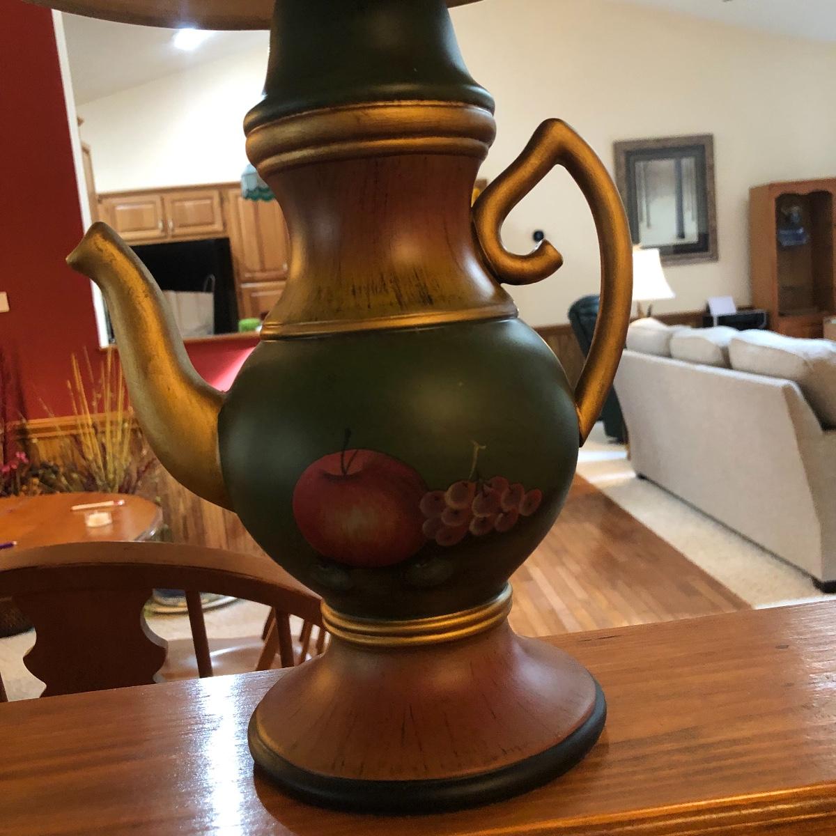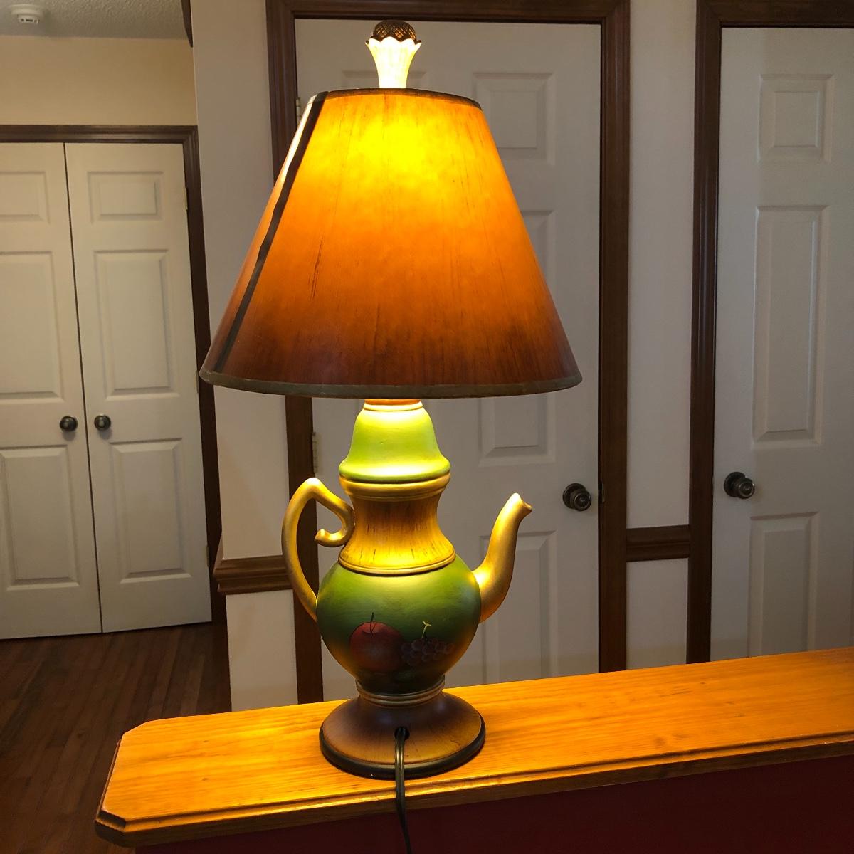 The base is 5.5” in diameter with the lamp being 8” wide and 21” tall. The teapot has a brass painted handle, base and spout. The body is a dark green. There is a small crease in the shade. Lamp appears to be ceramic. Local pick up only.