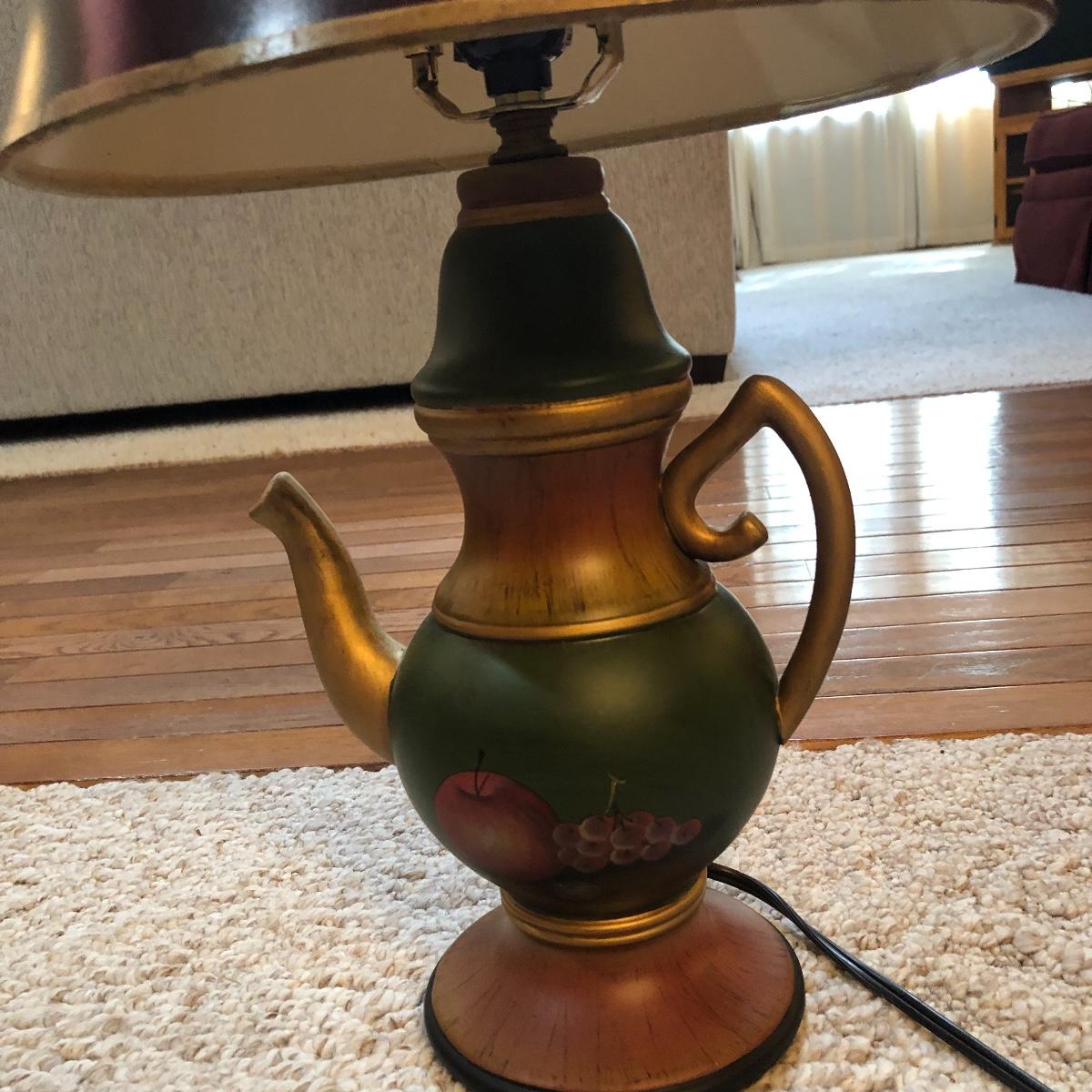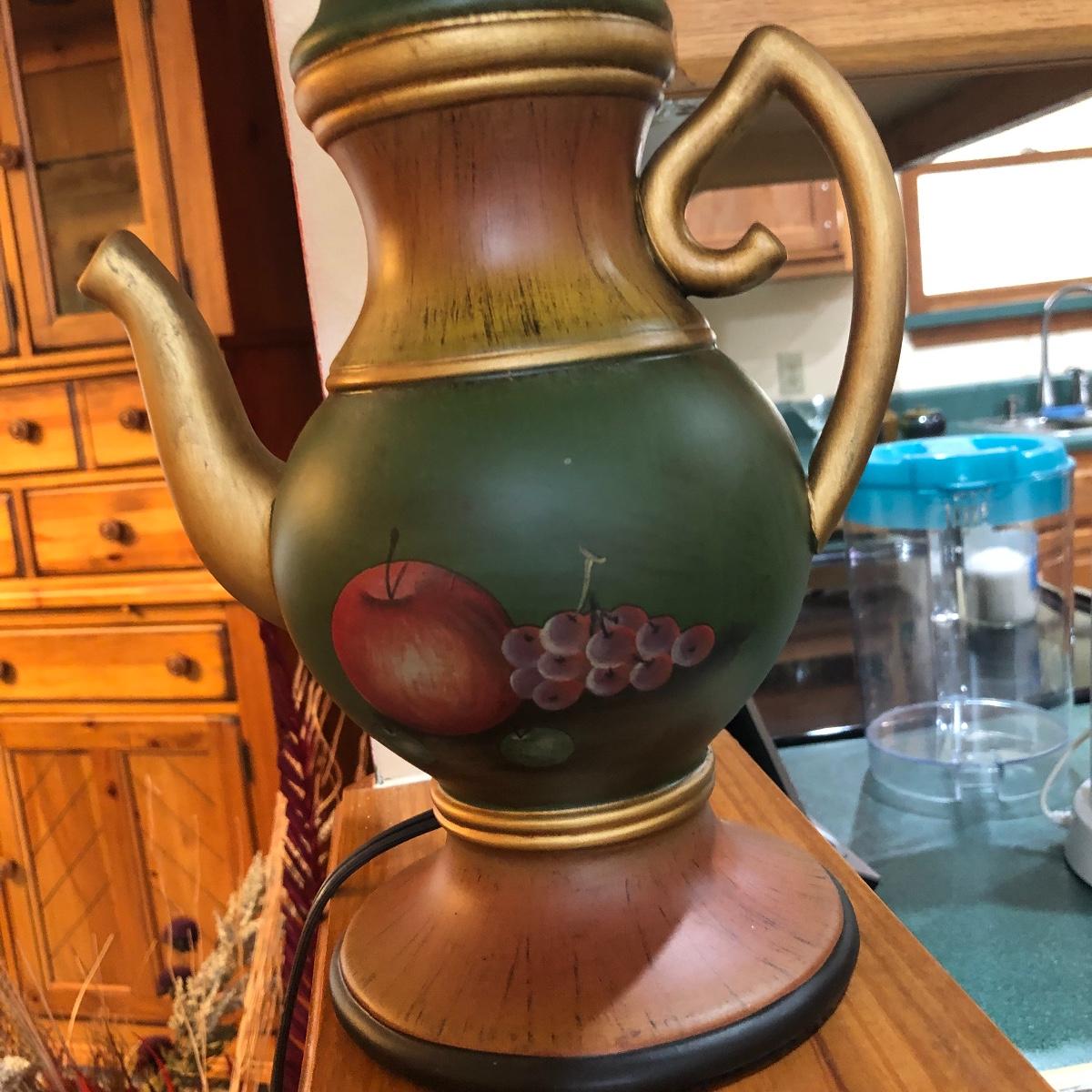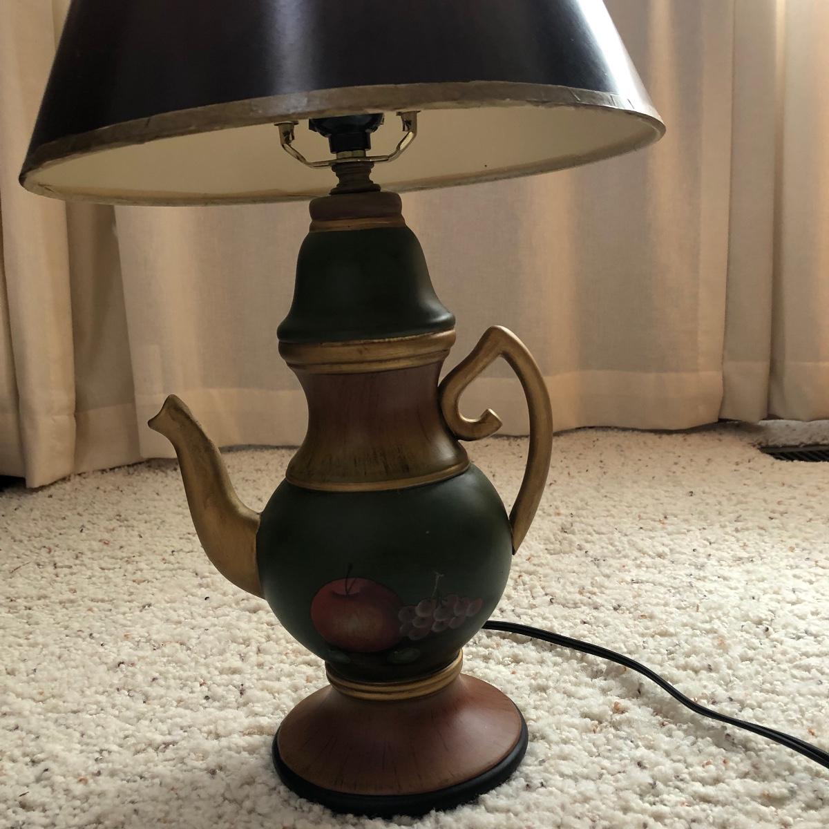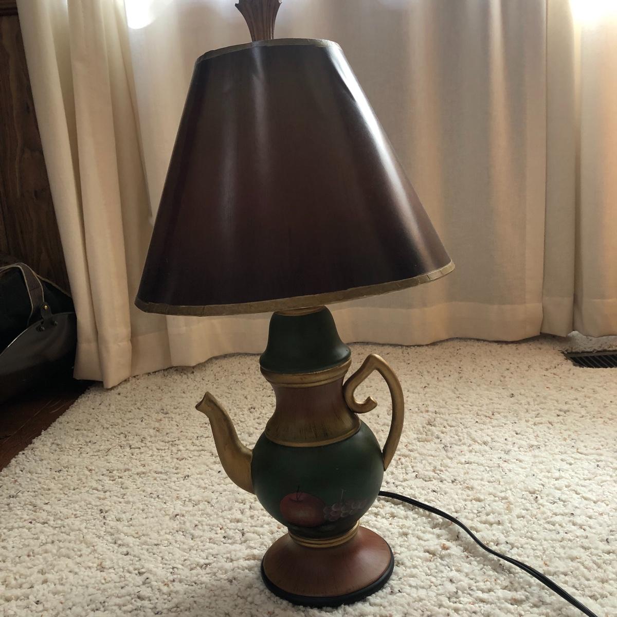 The base is 5.5” in diameter with the lamp being 8” wide and 21” tall. The teapot has a brass painted handle, base and spout. The body is a dark green. There is a small crease in the shade. Lamp appears to be ceramic. Local pick up only.