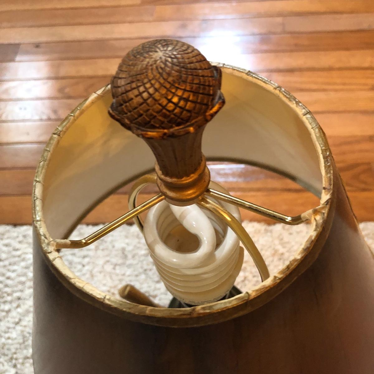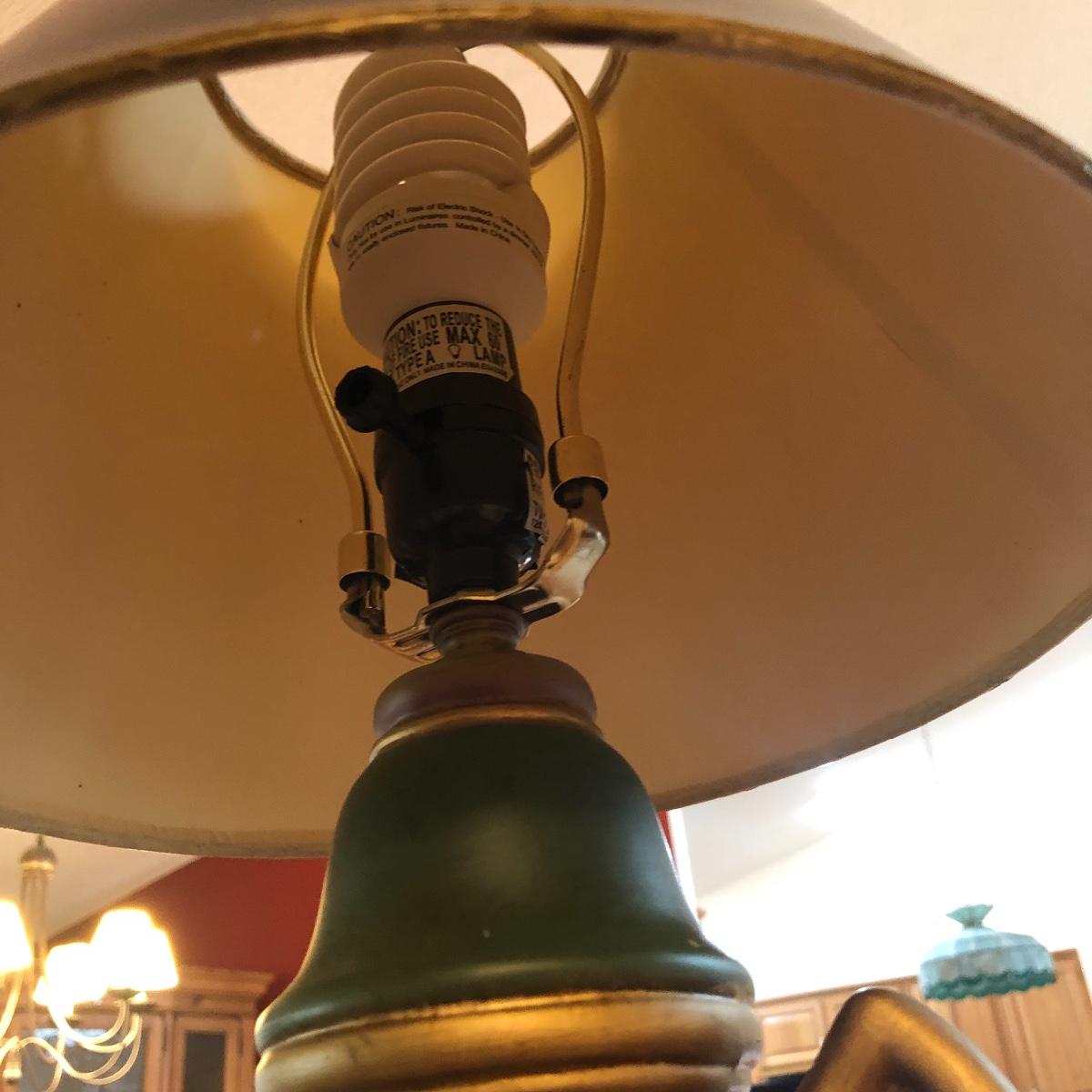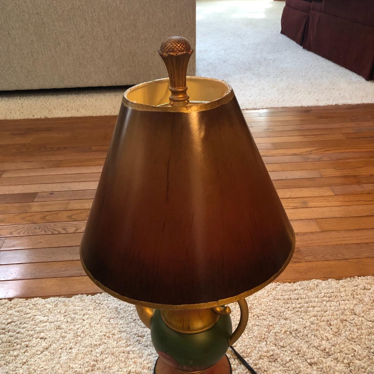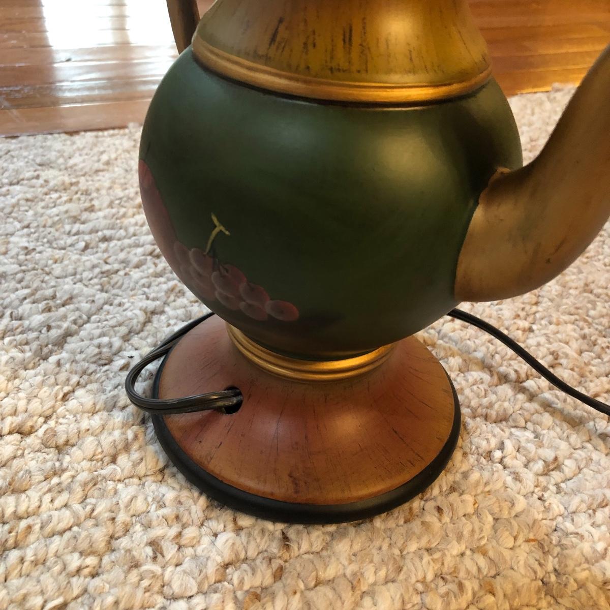 The base is 5.5” in diameter with the lamp being 8” wide and 21” tall. The teapot has a brass painted handle, base and spout. The body is a dark green. There is a small crease in the shade. Lamp appears to be ceramic. Local pick up only.