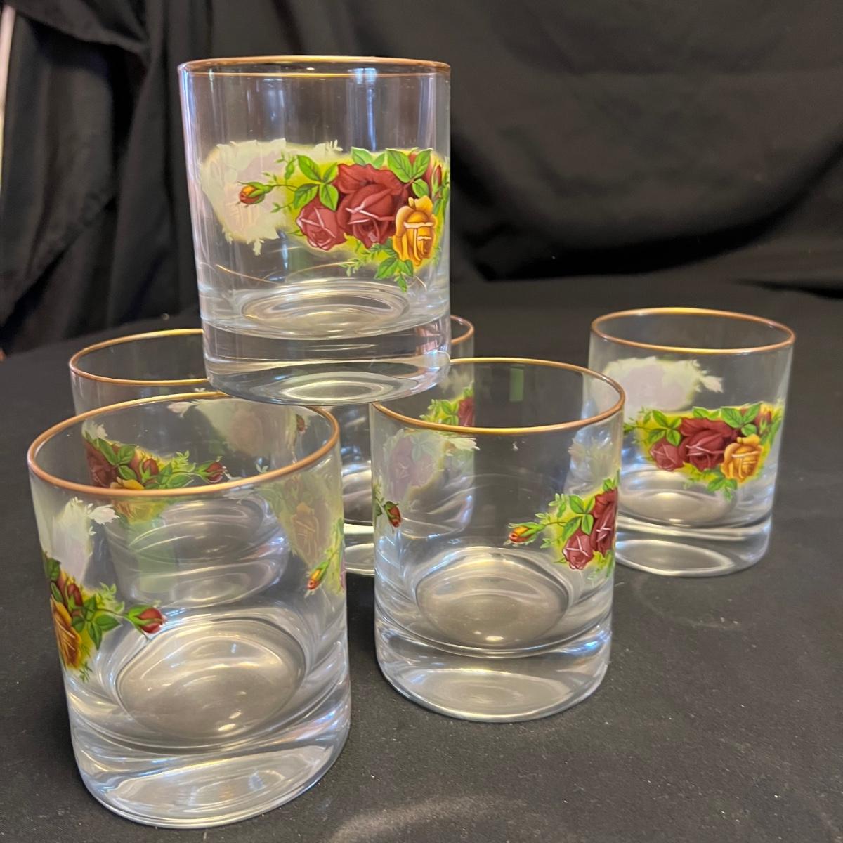 This tall glass pitcher has a gold accent and the six matching glasses have gold rims. Pitcher measures 4.5” x 11”. Lot also includes a set of six floral tumblers also with gold rims.