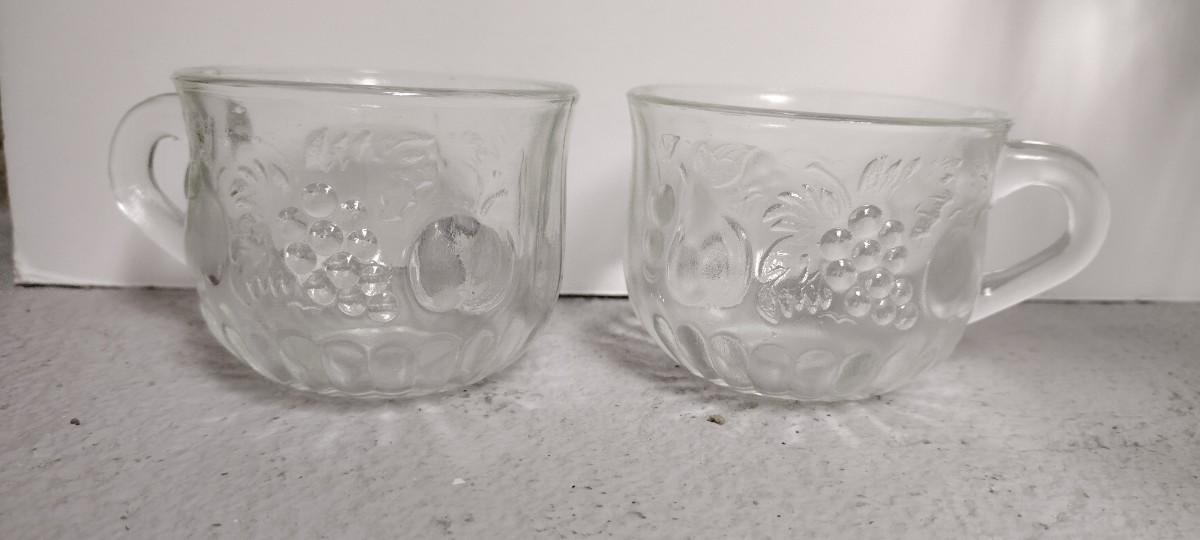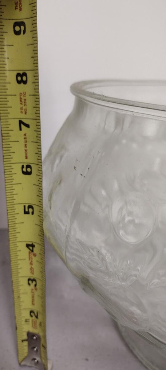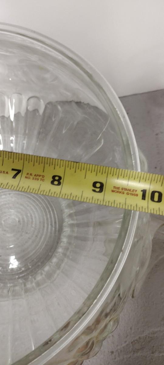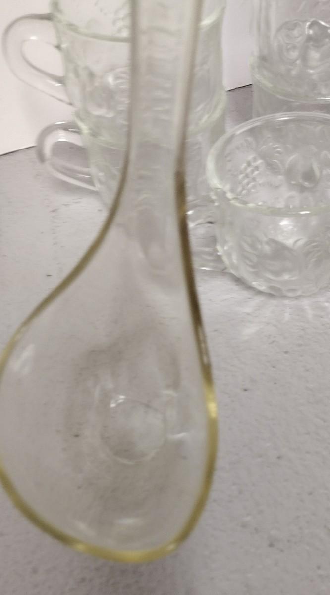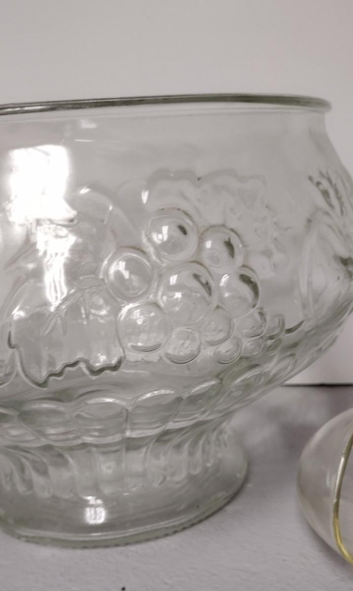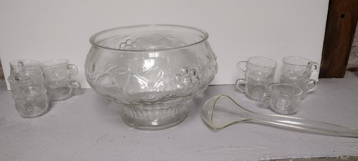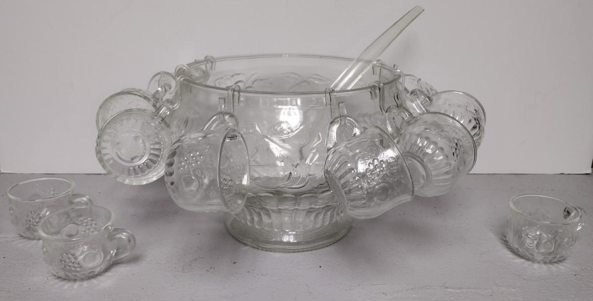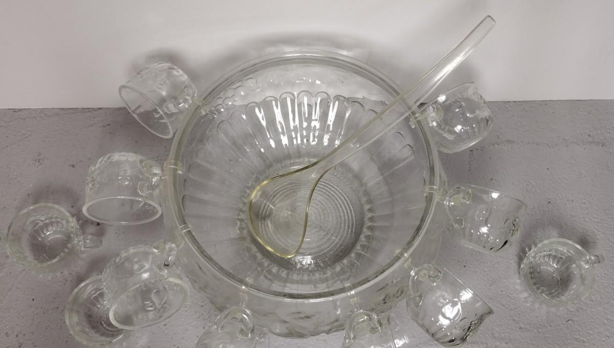 Glass Punch Bowl with 8 plastic hooks, 11 glass cups, and plastic ladle
