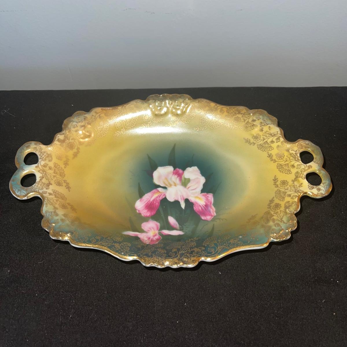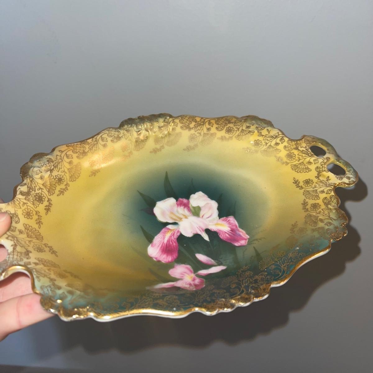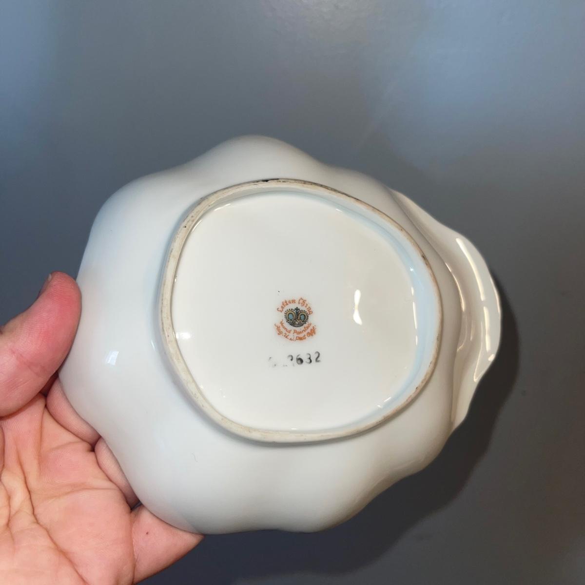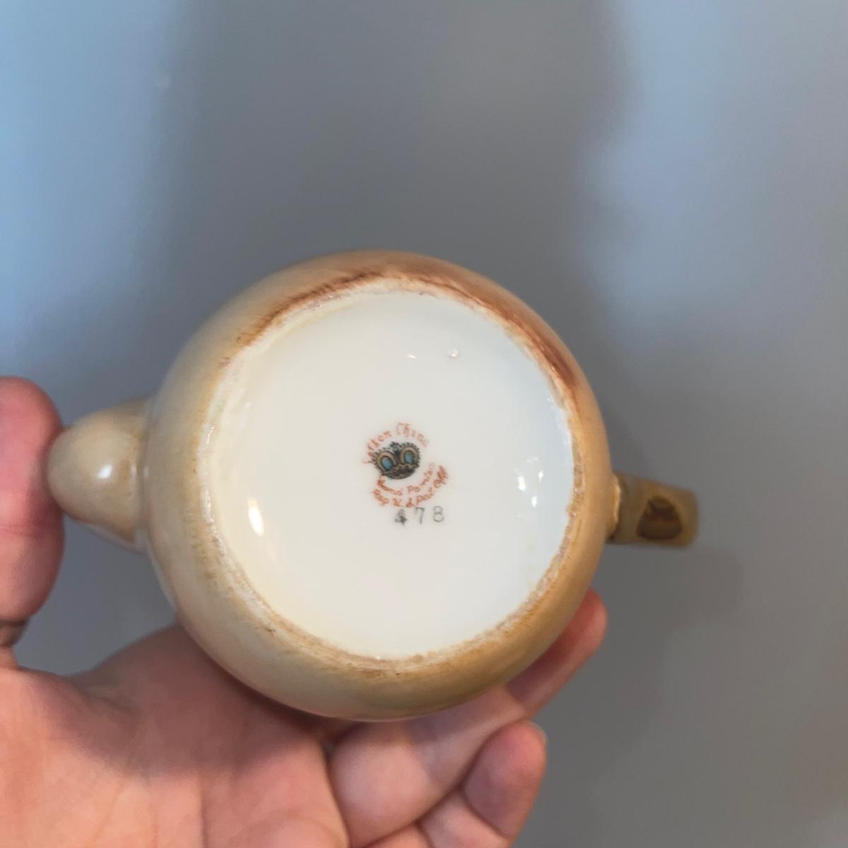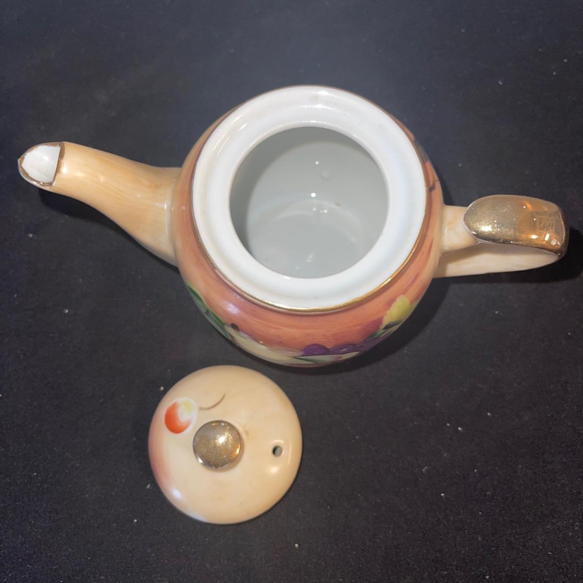Four items of fruit themed china. Included are a small teapot, a plate (10” in diameter), and two unique-shapes dishes. Each item has gold leaf trim and imagery of flora and fruits.