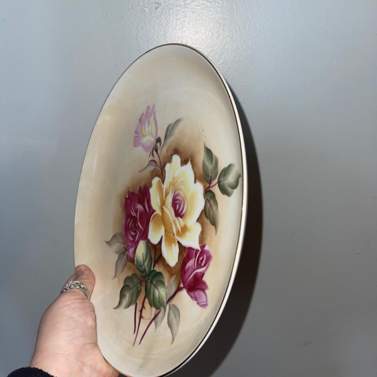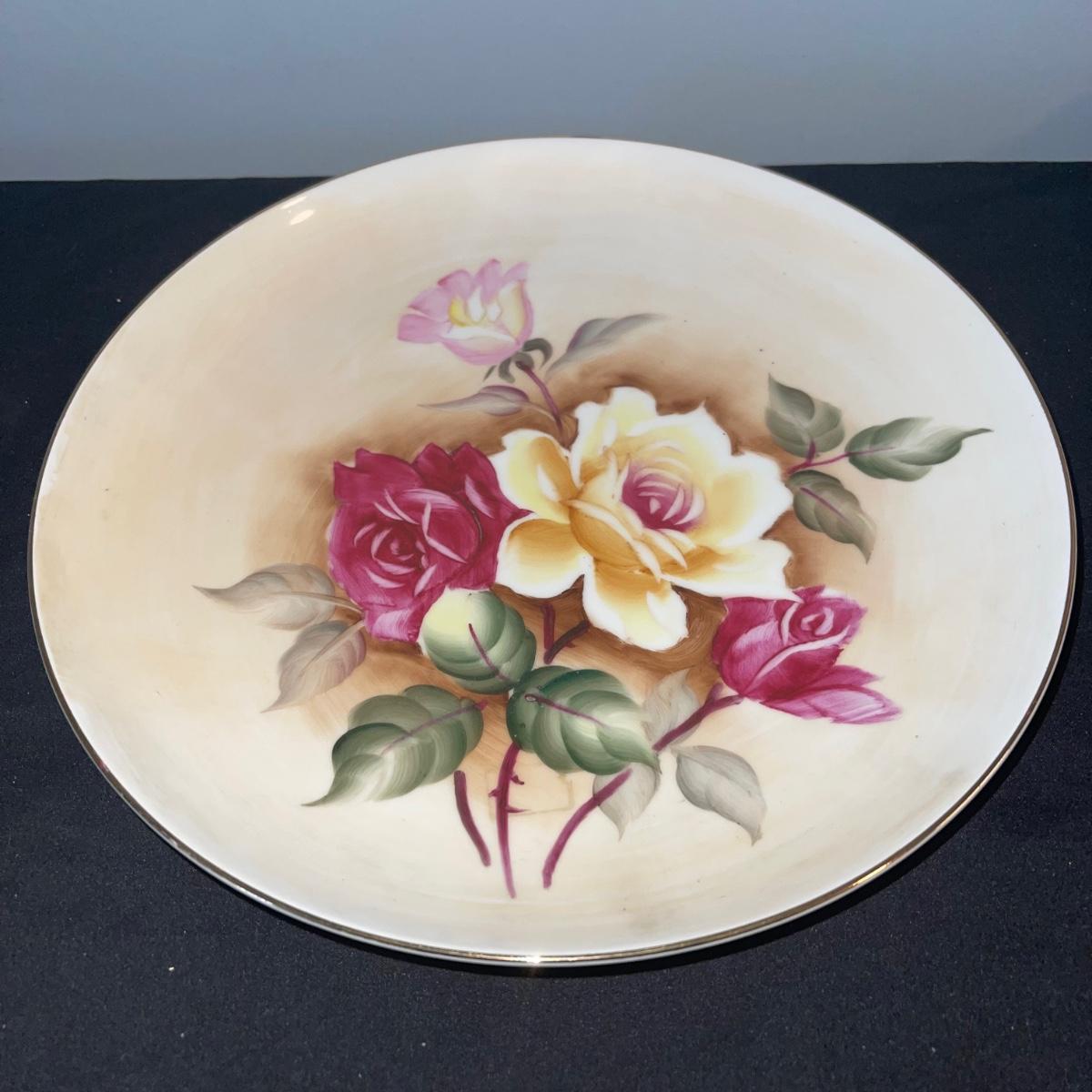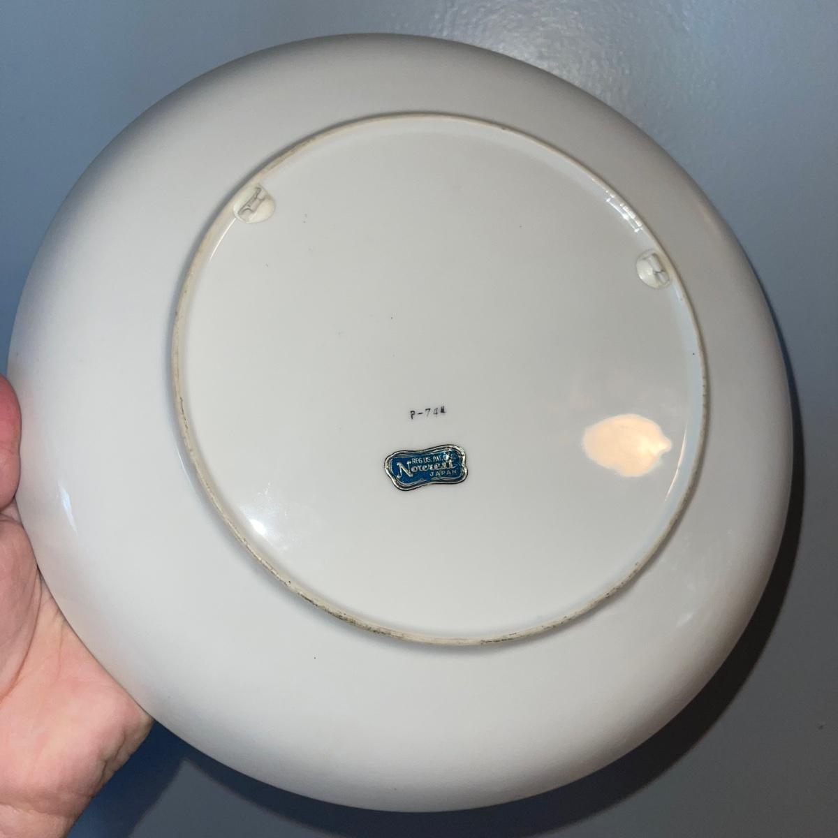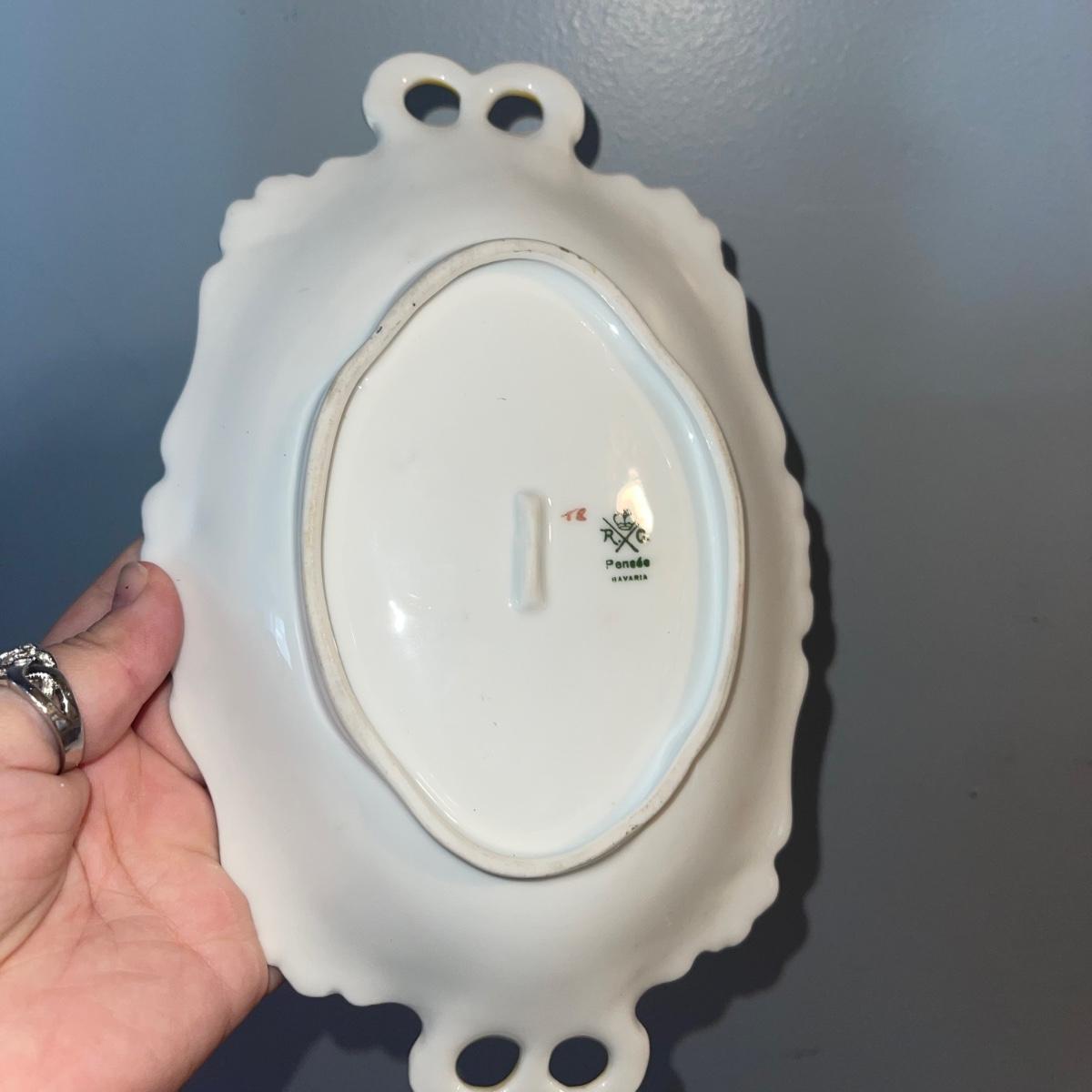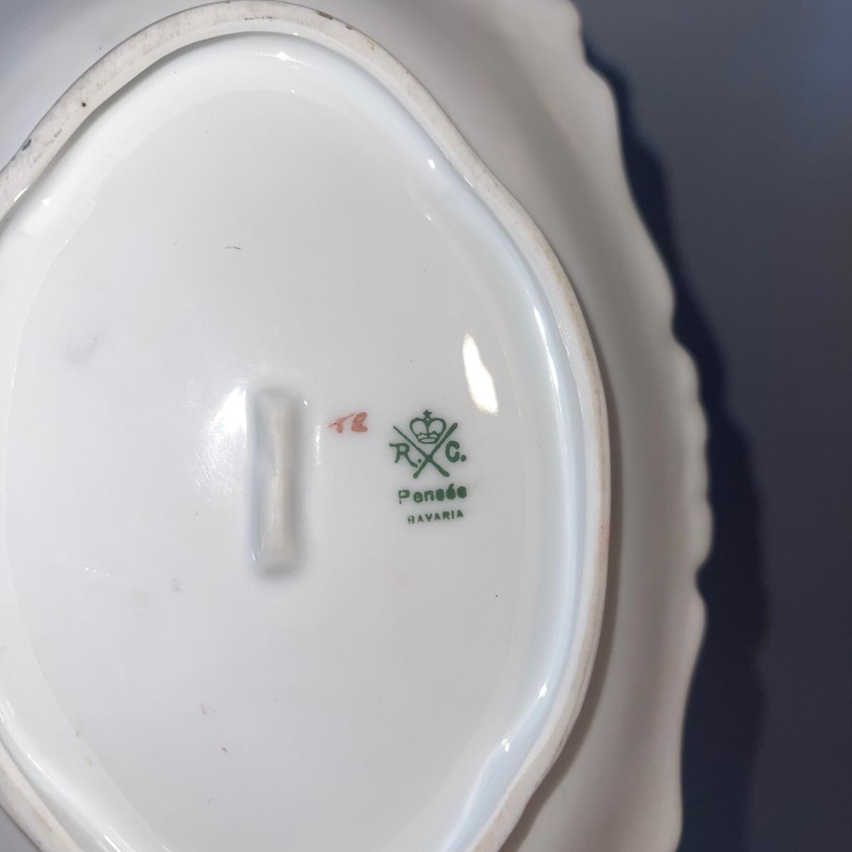 Four items of fruit themed china. Included are a small teapot, a plate (10” in diameter), and two unique-shapes dishes. Each item has gold leaf trim and imagery of flora and fruits.