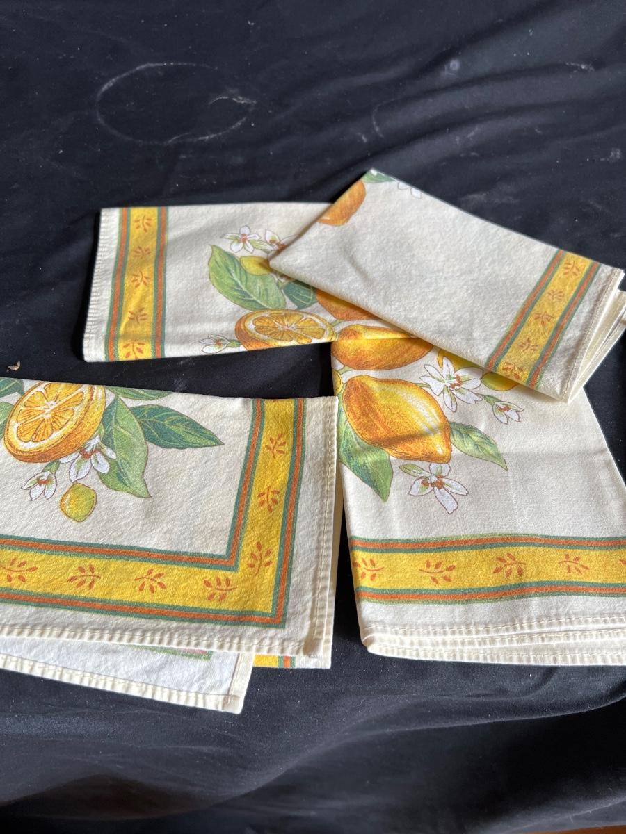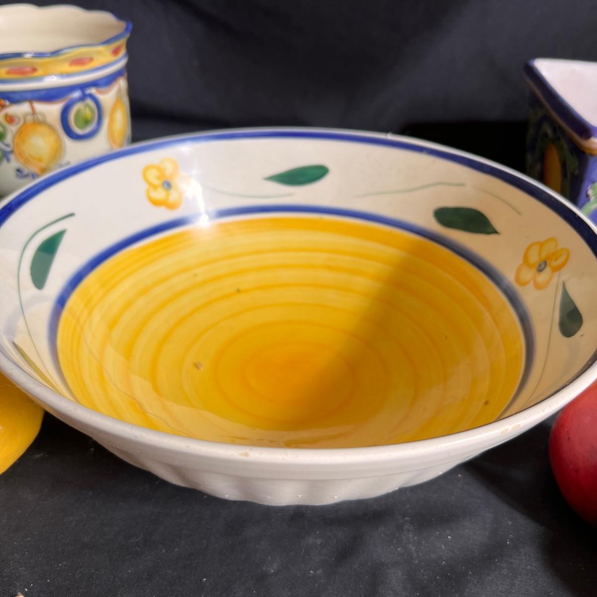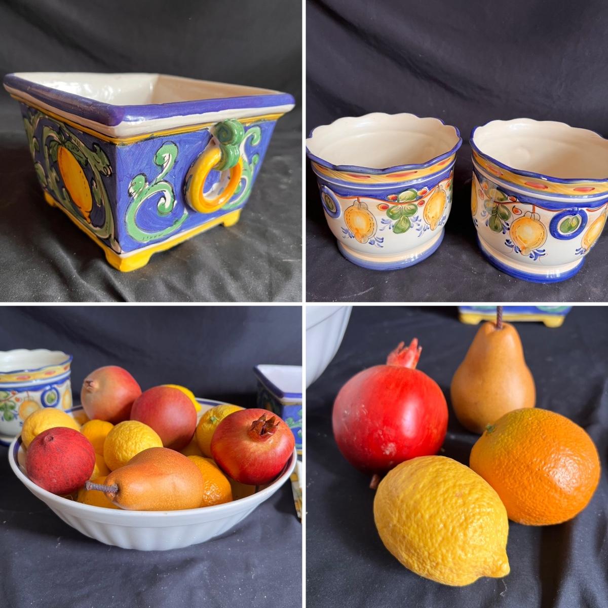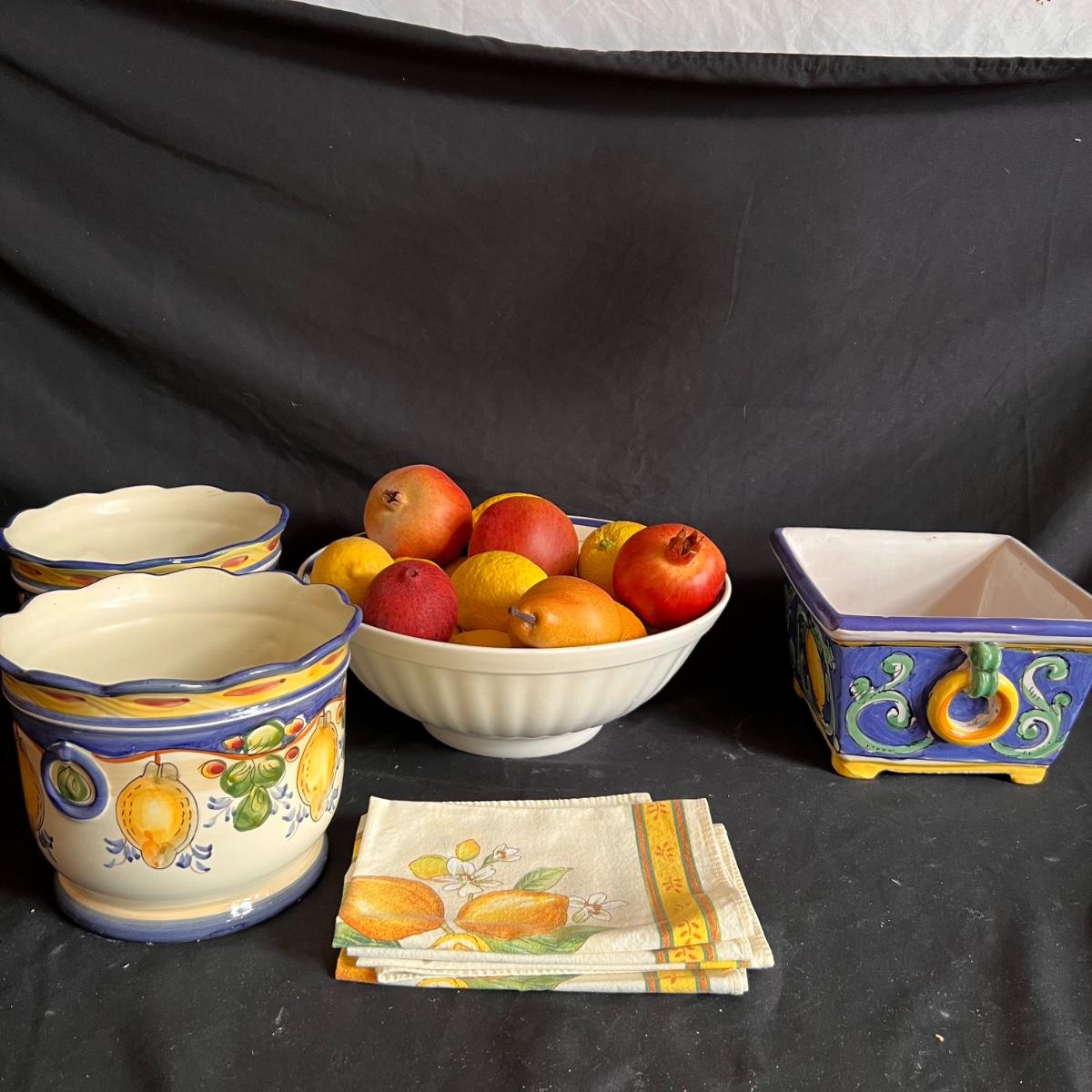 A matching pair of bowls could be used as such or as plant pots; small chip on one rim, see pic. The square shaped dish was made in Italy. Faux fruit appears to be made of a plastic type material. Four napkins have lemon design on them.