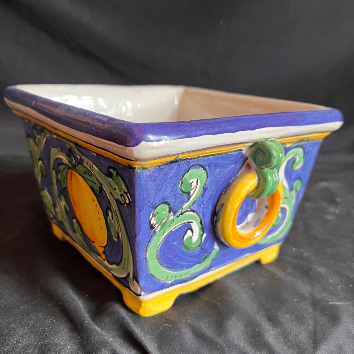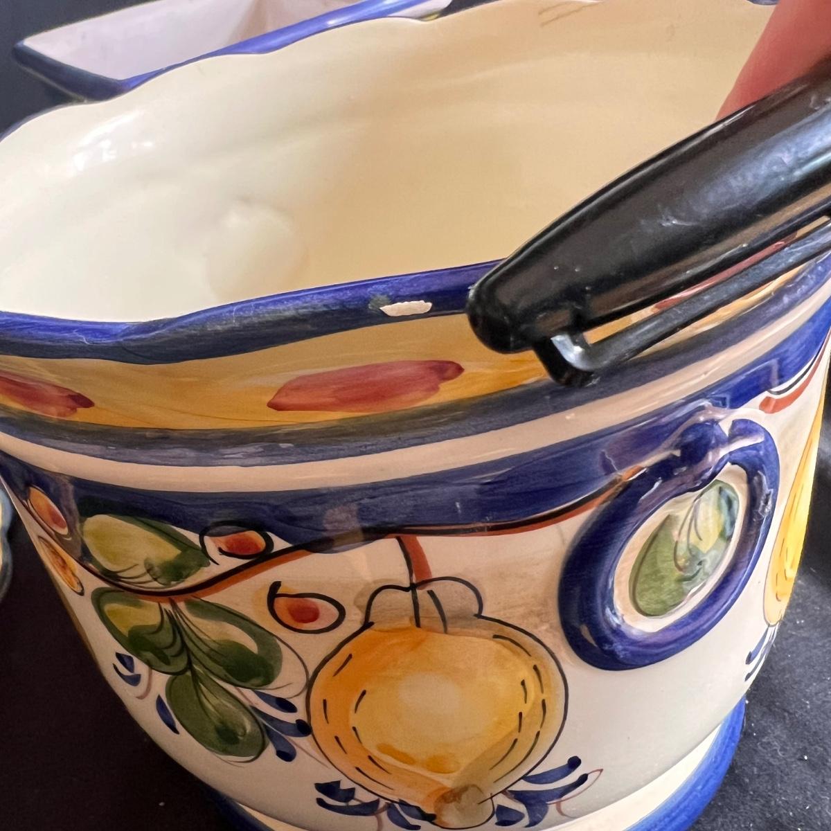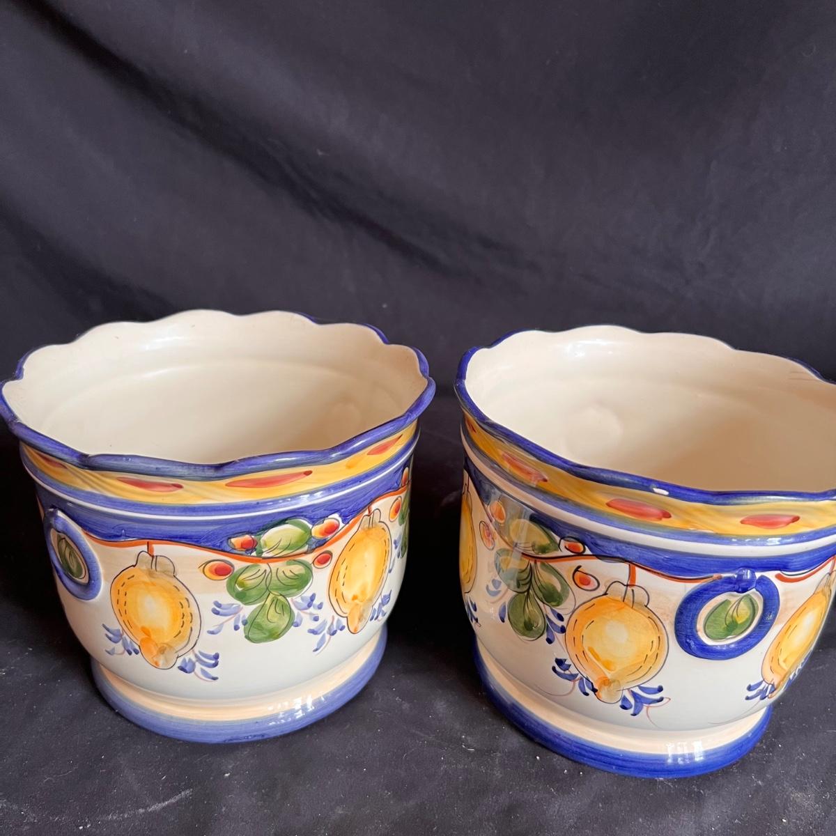 A matching pair of bowls could be used as such or as plant pots; small chip on one rim, see pic. The square shaped dish was made in Italy. Faux fruit appears to be made of a plastic type material. Four napkins have lemon design on them.