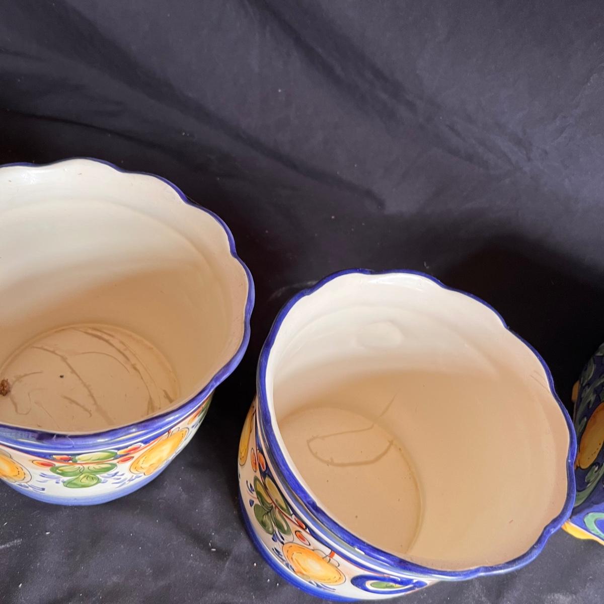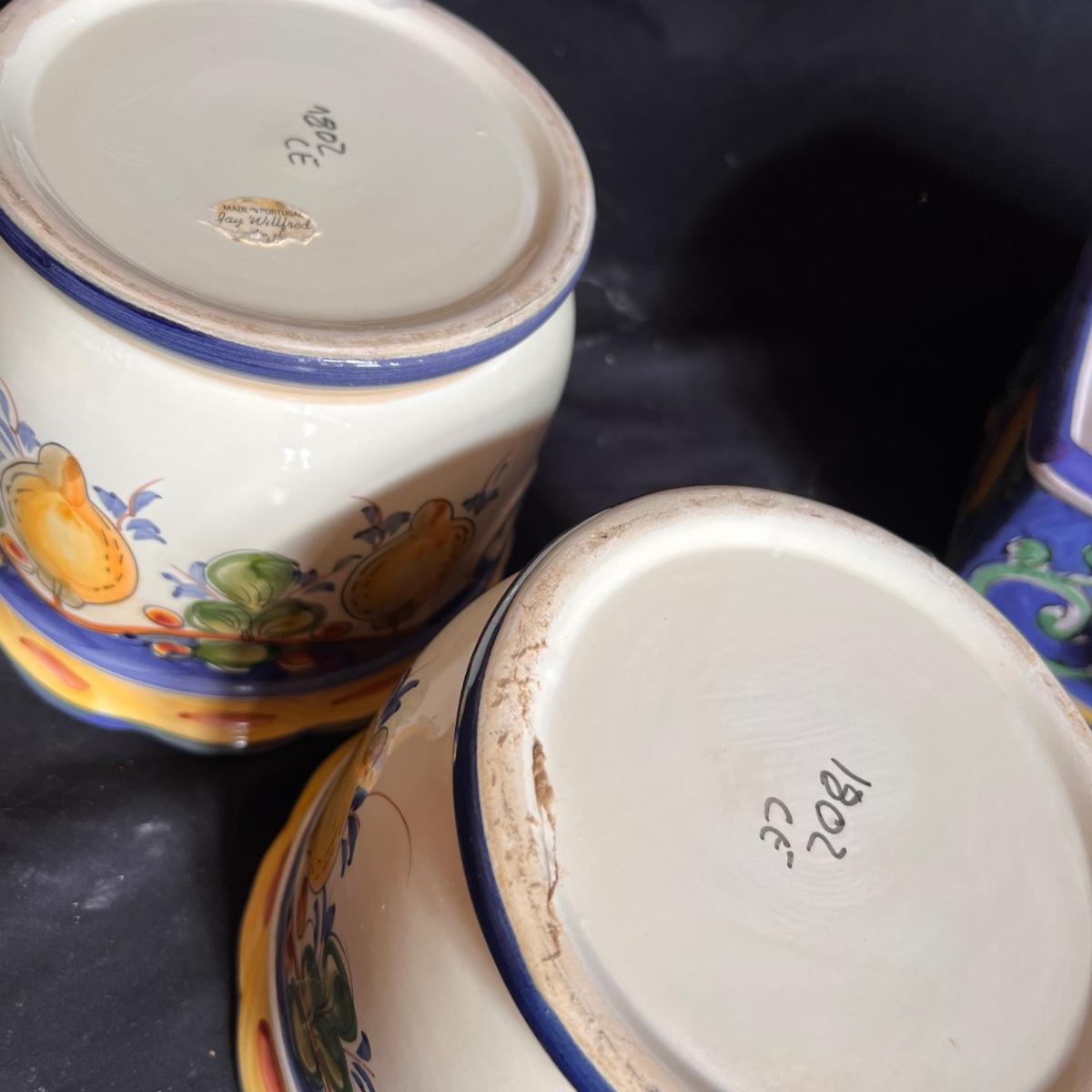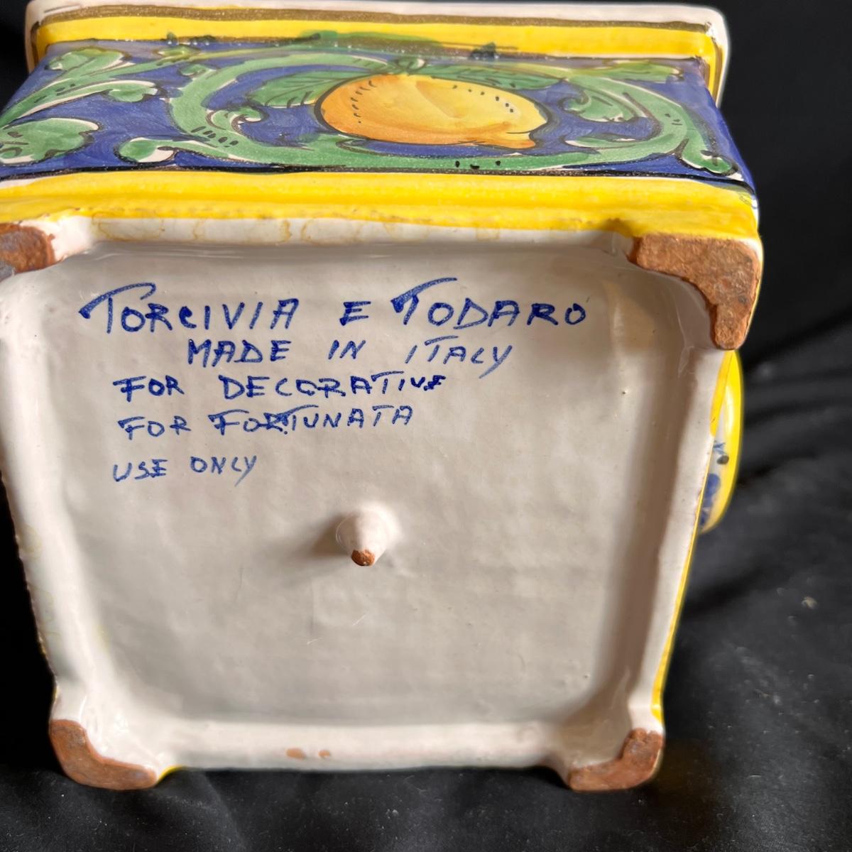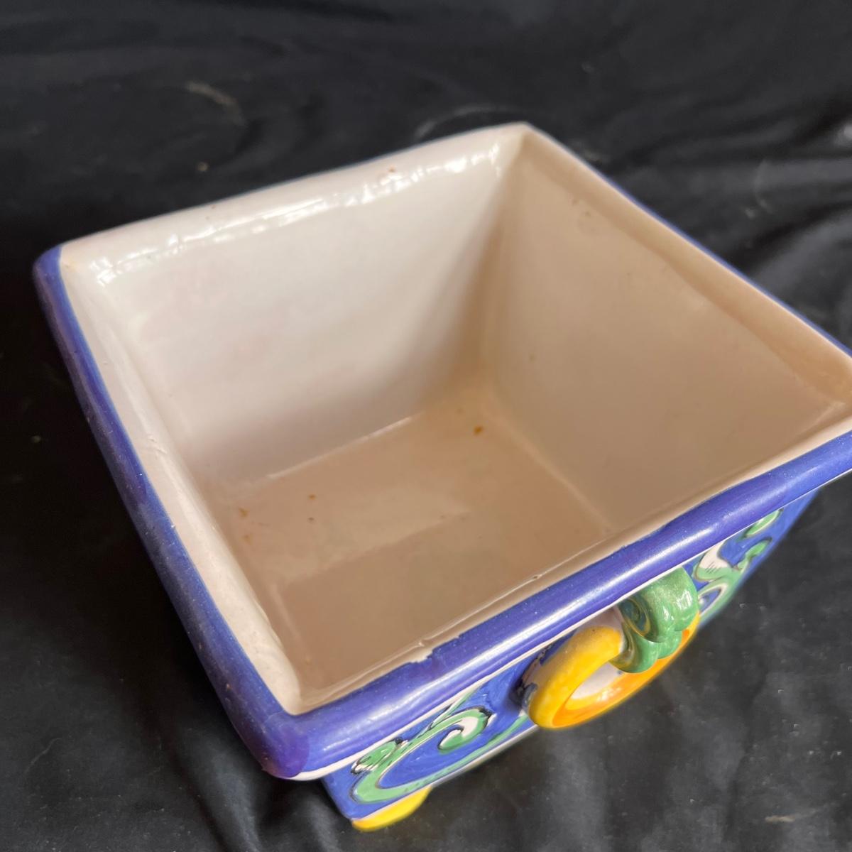 A matching pair of bowls could be used as such or as plant pots; small chip on one rim, see pic. The square shaped dish was made in Italy. Faux fruit appears to be made of a plastic type material. Four napkins have lemon design on them.