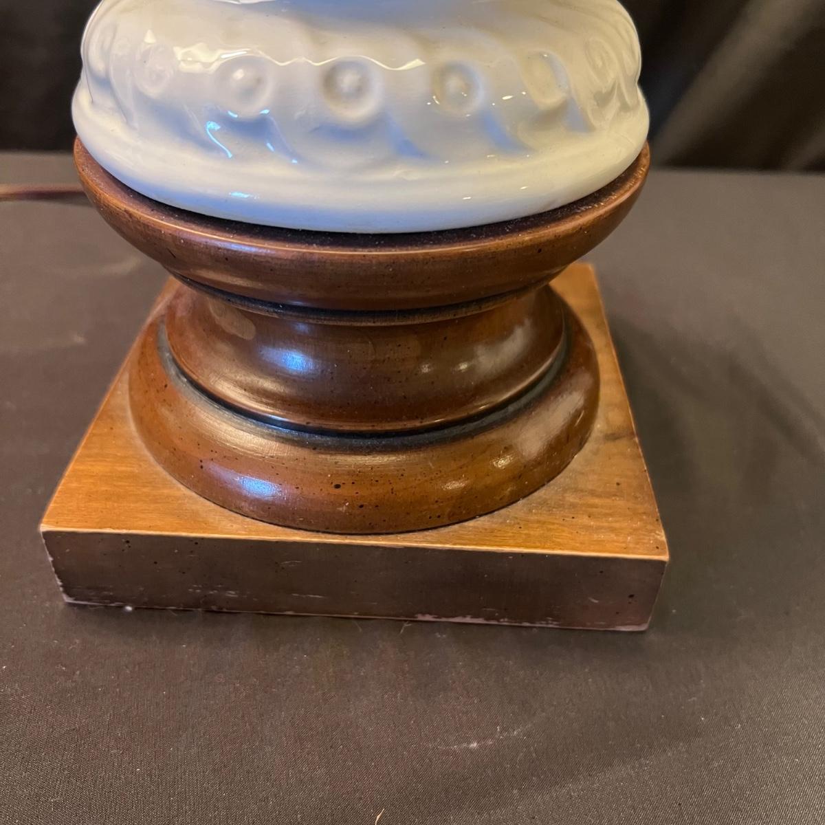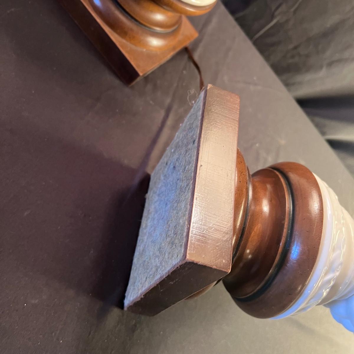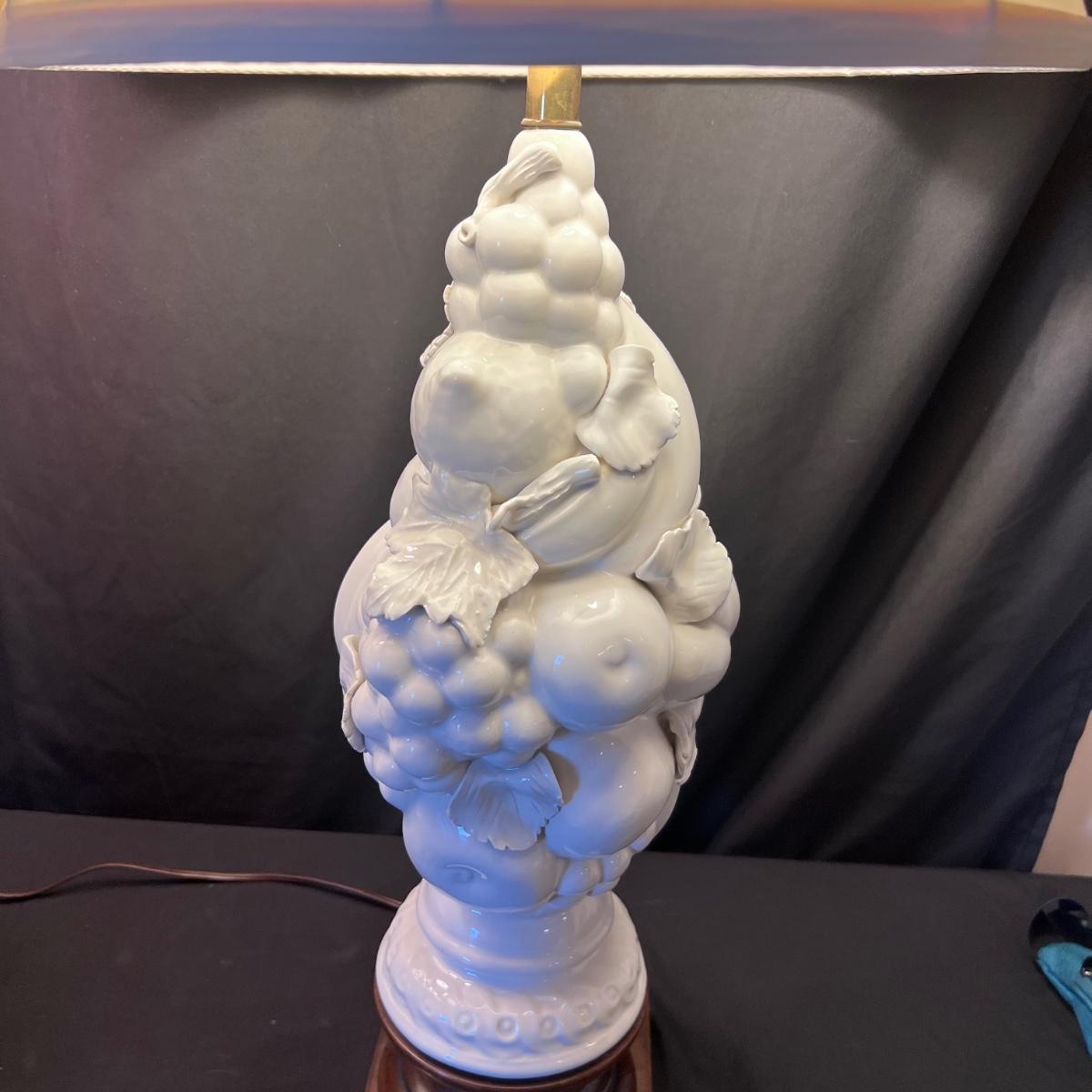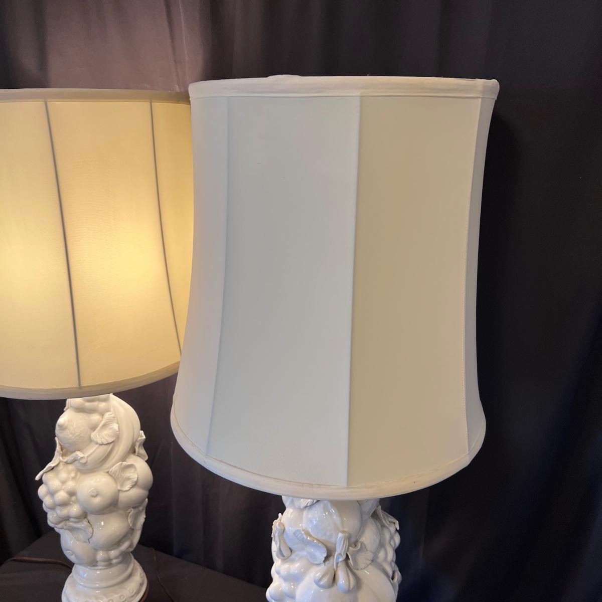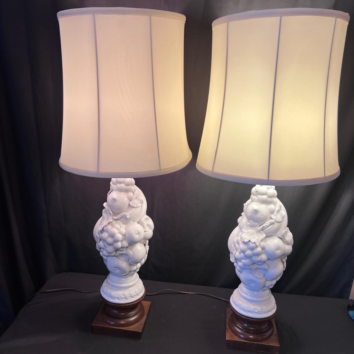 Matching pair of white porcelain fruit topiary table lamps with wood bases and cream colored shades. Lamps have an on/off switch and both turned on.