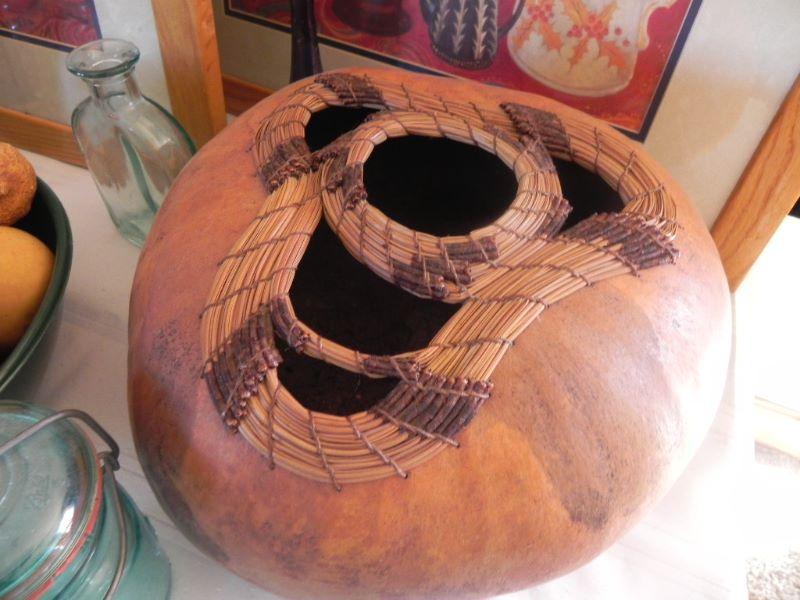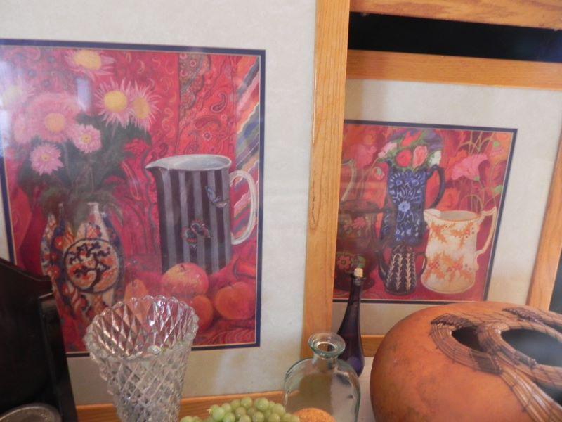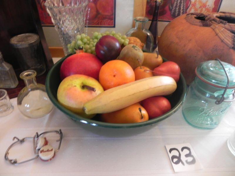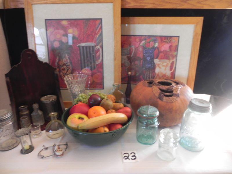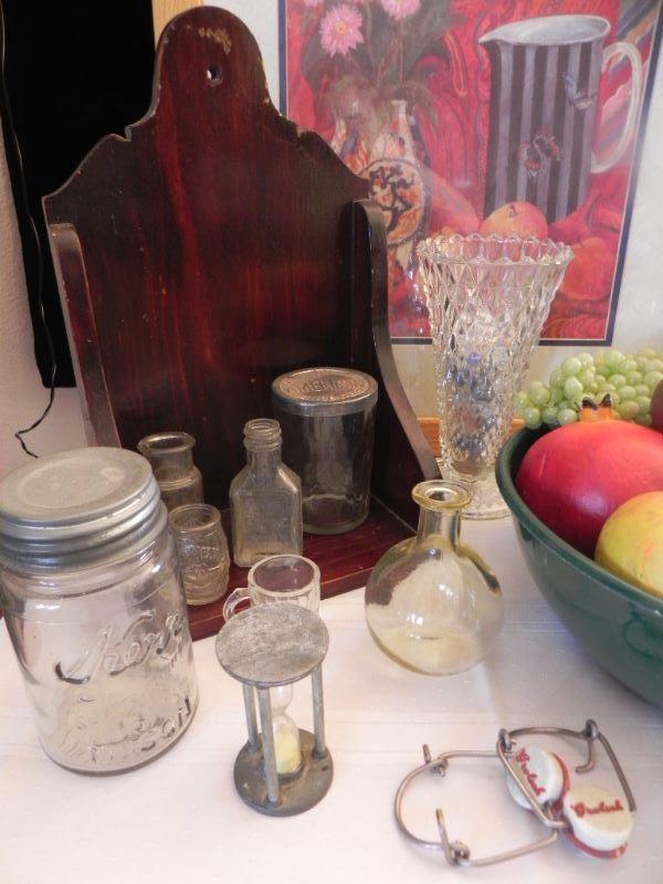 Antique shelf, various bottles and jars, 2 framed pictures, fruit bowl, and gourd