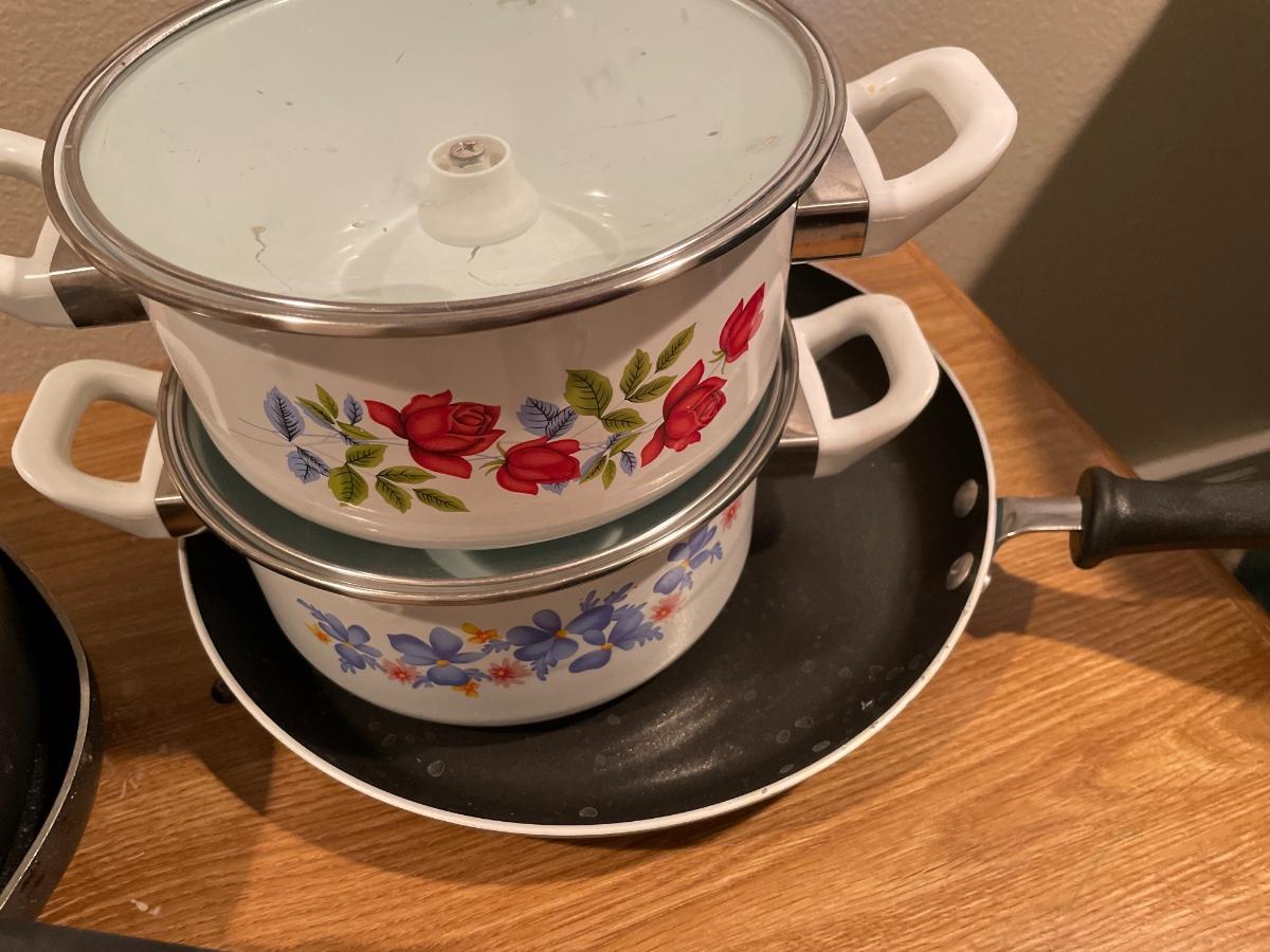 Different brands of frying pans and floral decorated pots