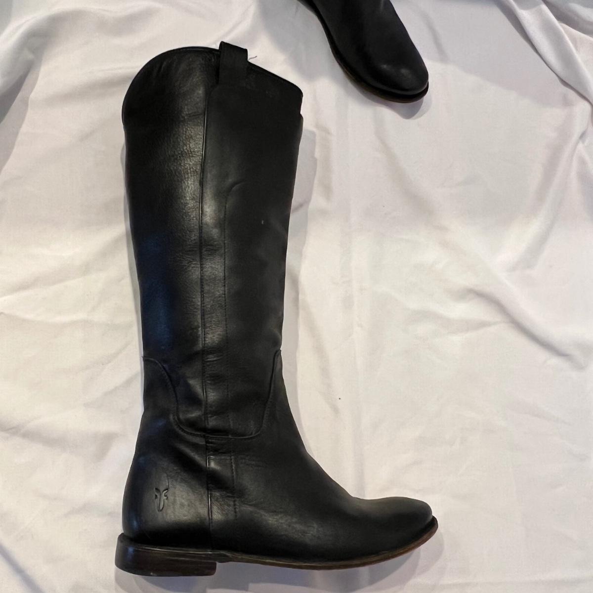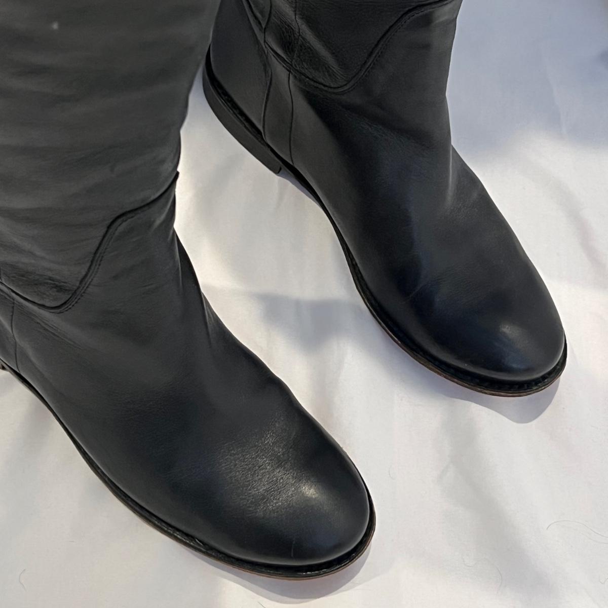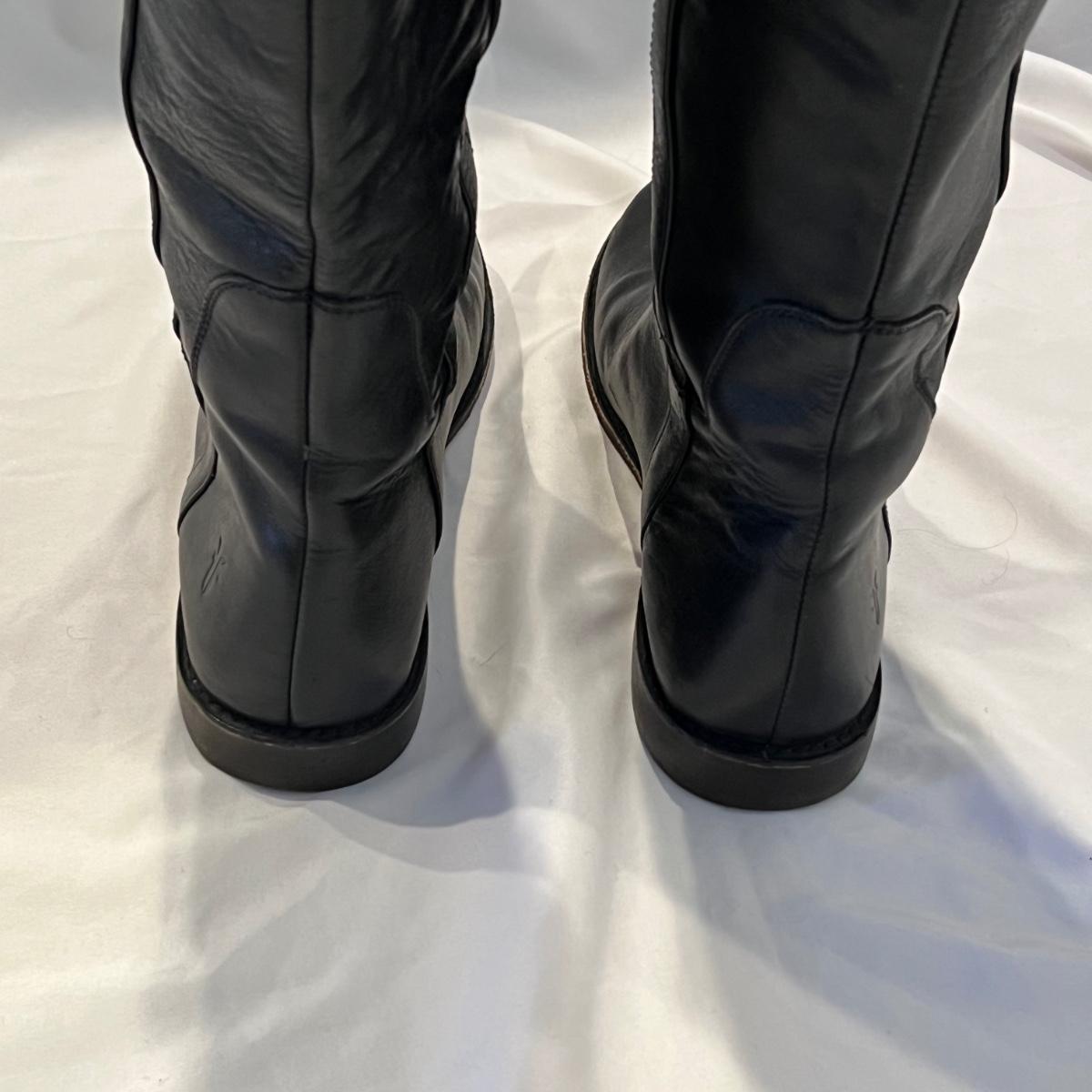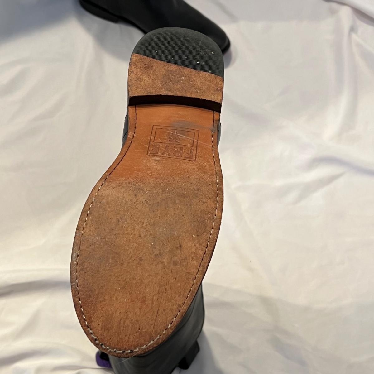 This pair of Frye boots appear to be leather but no leather label was found. They are in very good condition with plenty of wear left in them. Size 8, they are 17” tall.