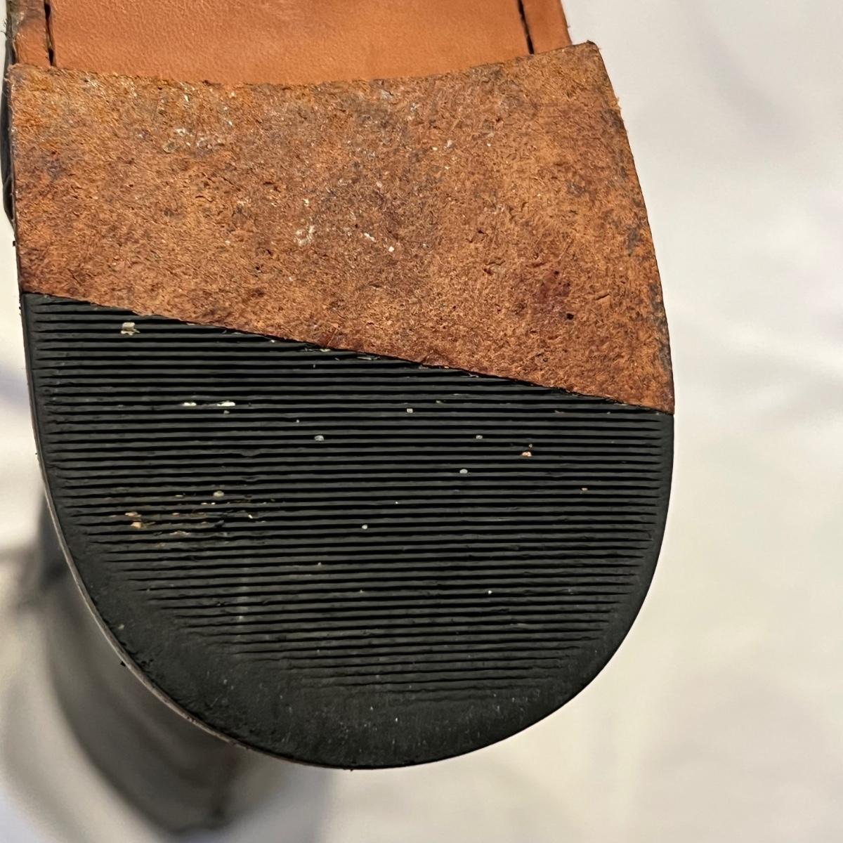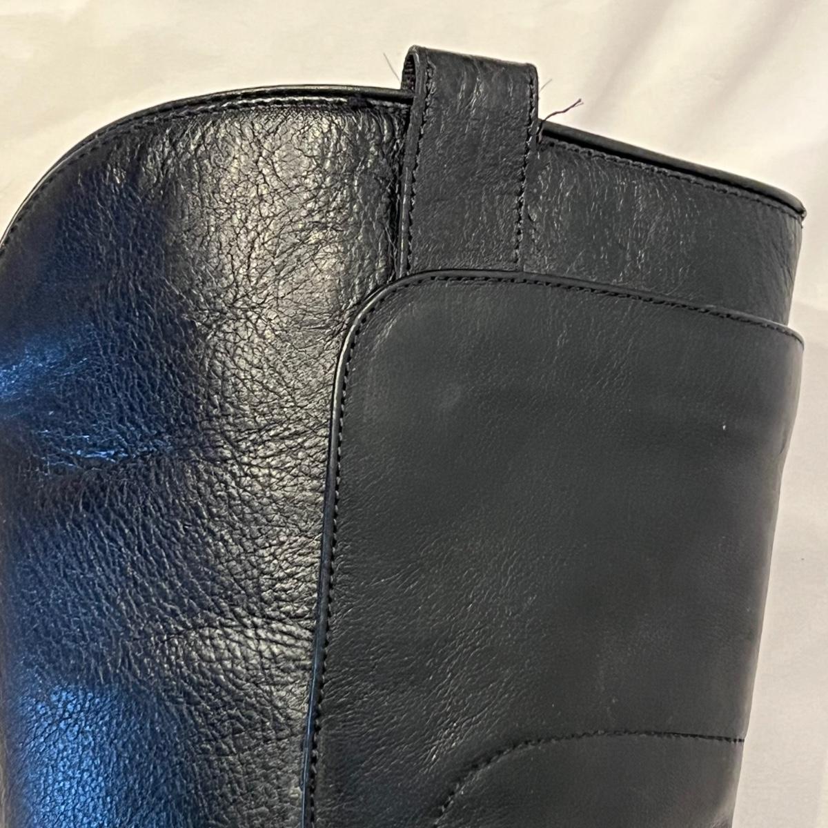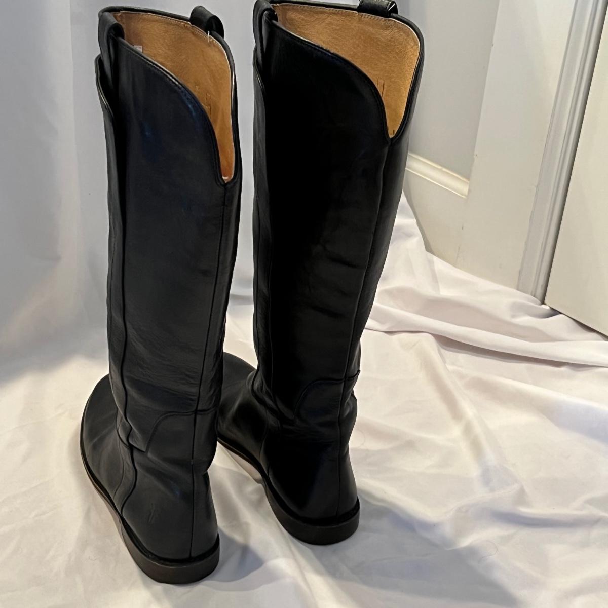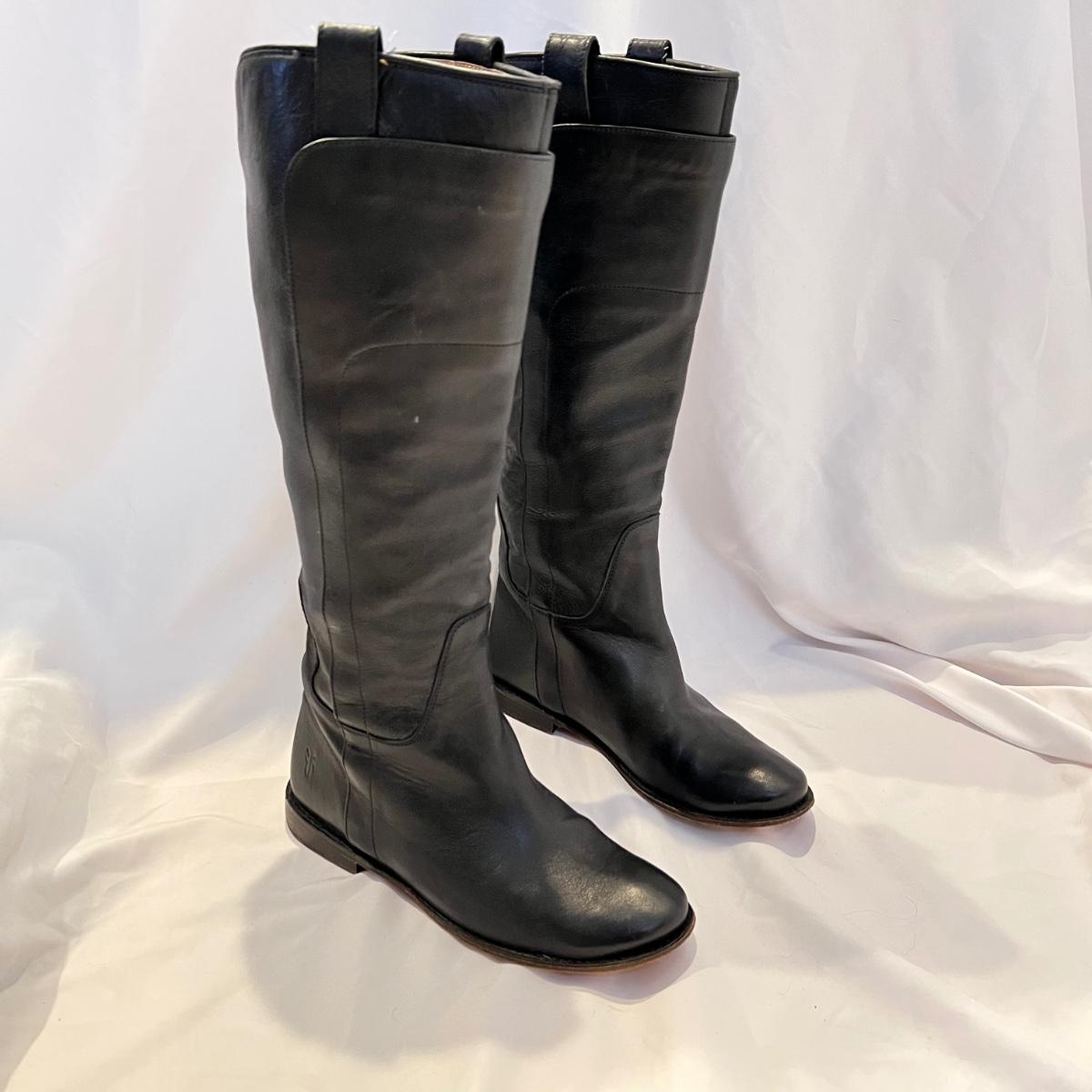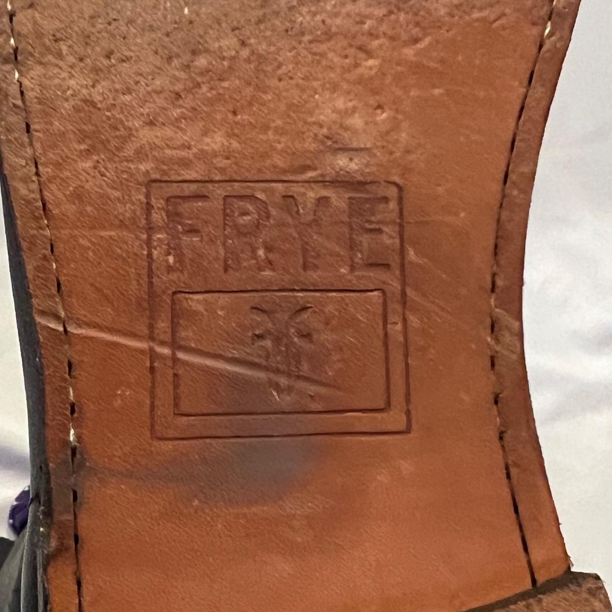 This pair of Frye boots appear to be leather but no leather label was found. They are in very good condition with plenty of wear left in them. Size 8, they are 17” tall.