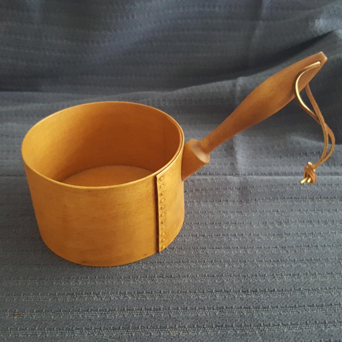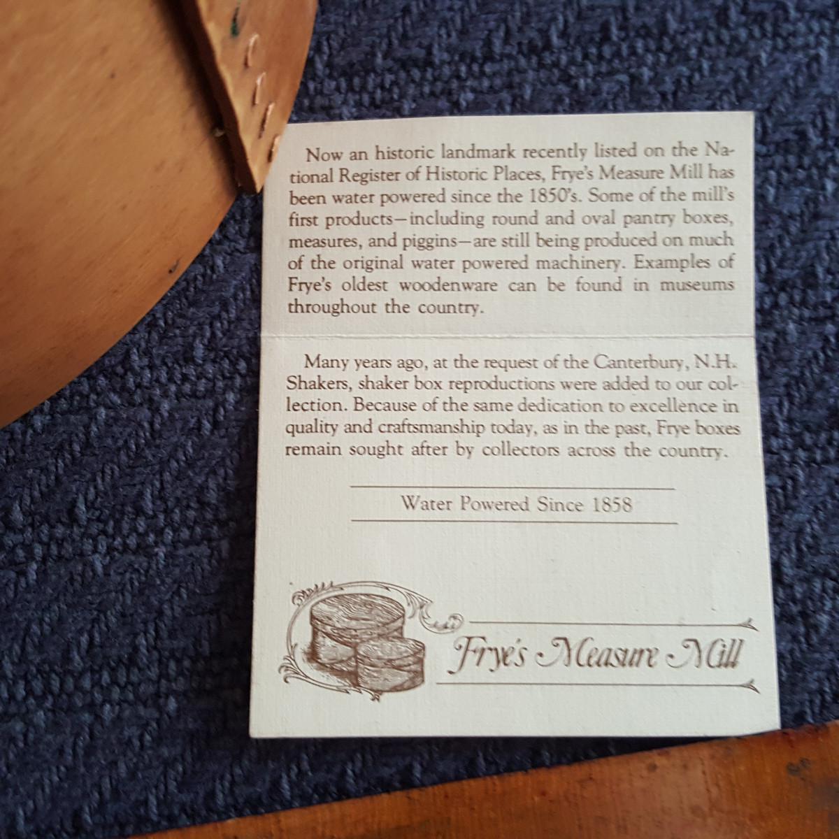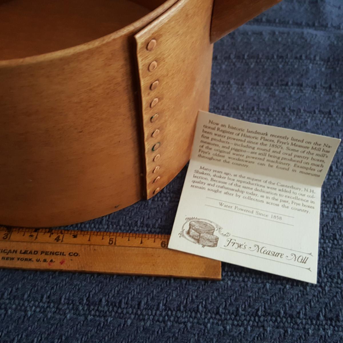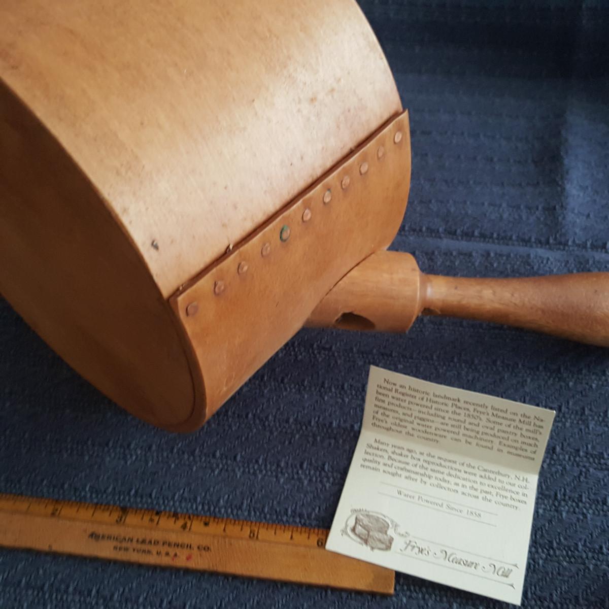 This auction lot is for a Frye's "Shaker-Style" Dry Measure Piggin. This handmade, wooden measure dipper is about 7-inches in diameter, this dipper was built to measure 2 quarts. This item is in as-new condition. In great-grandmother's day, a piggin was found in every home. Today, it is still an important kitchen utensil. Used as server, filled with a floral arrangement, or hung from a beam, it's a beautiful country addition. Made by the Frye Measure Mill in Wilton, NH. Hint: you can still buy these fresh from the mill for about $80 plus shipping.
