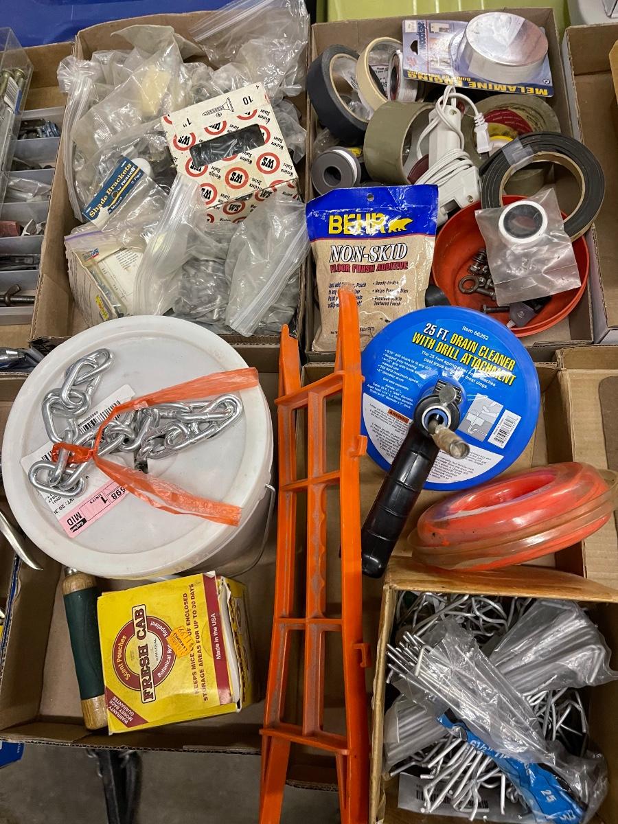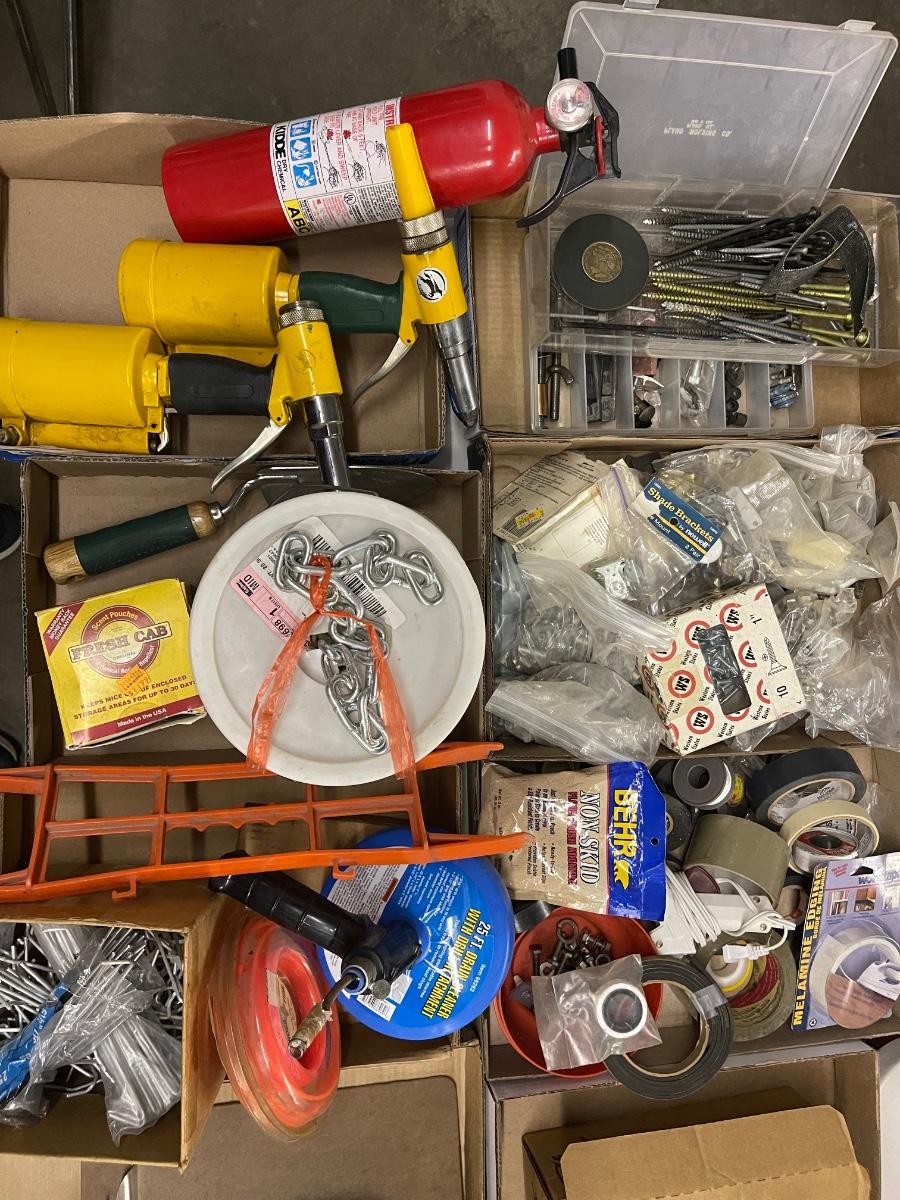 FS32-Utility chain, garden tool, drain cleaner, Thai wraps, assorted tape, miscellaneous hardware and attachments, fire extinguisher, pneumatic tools