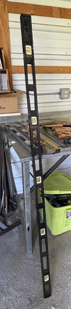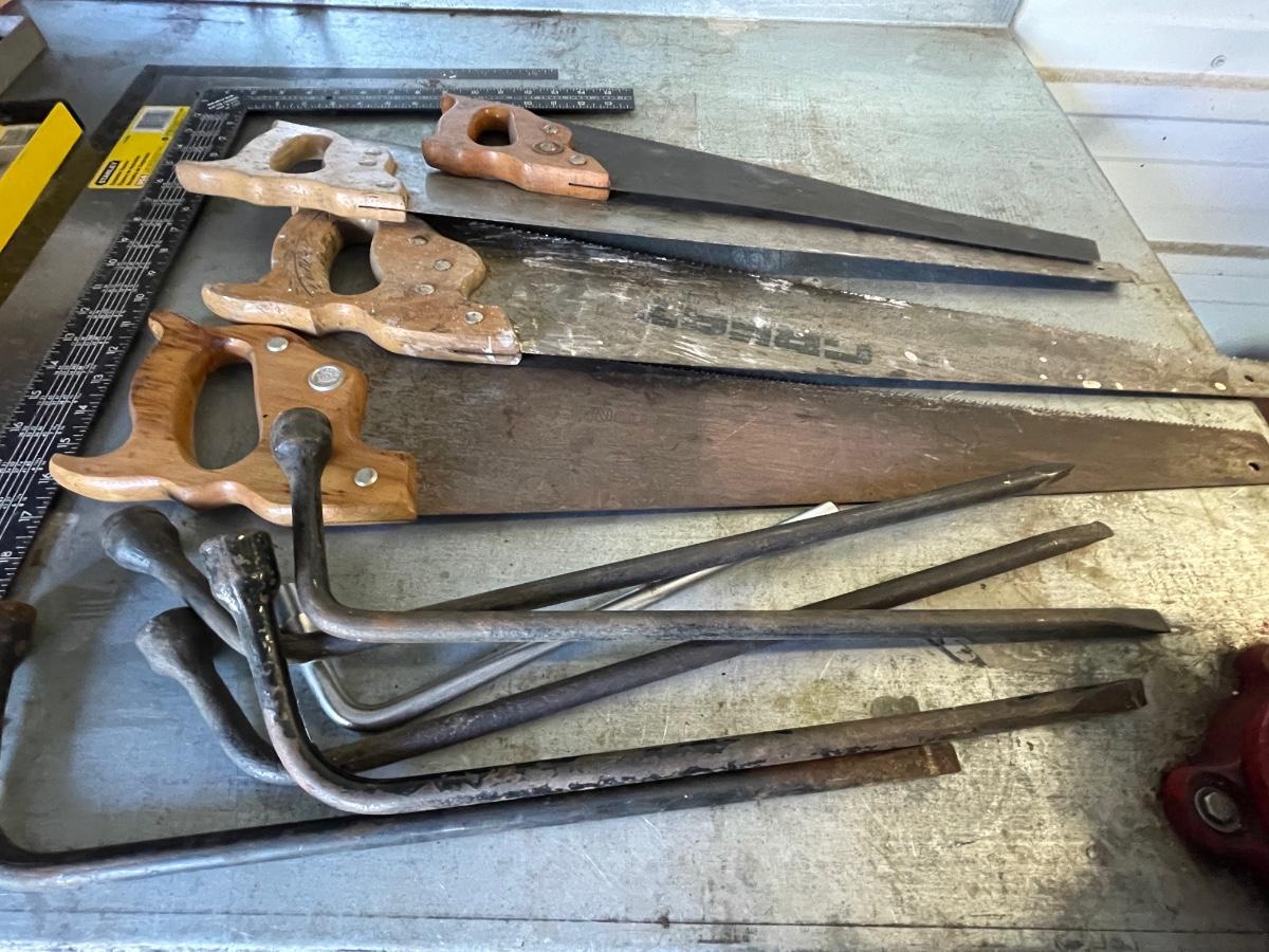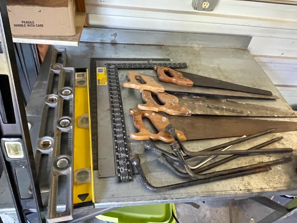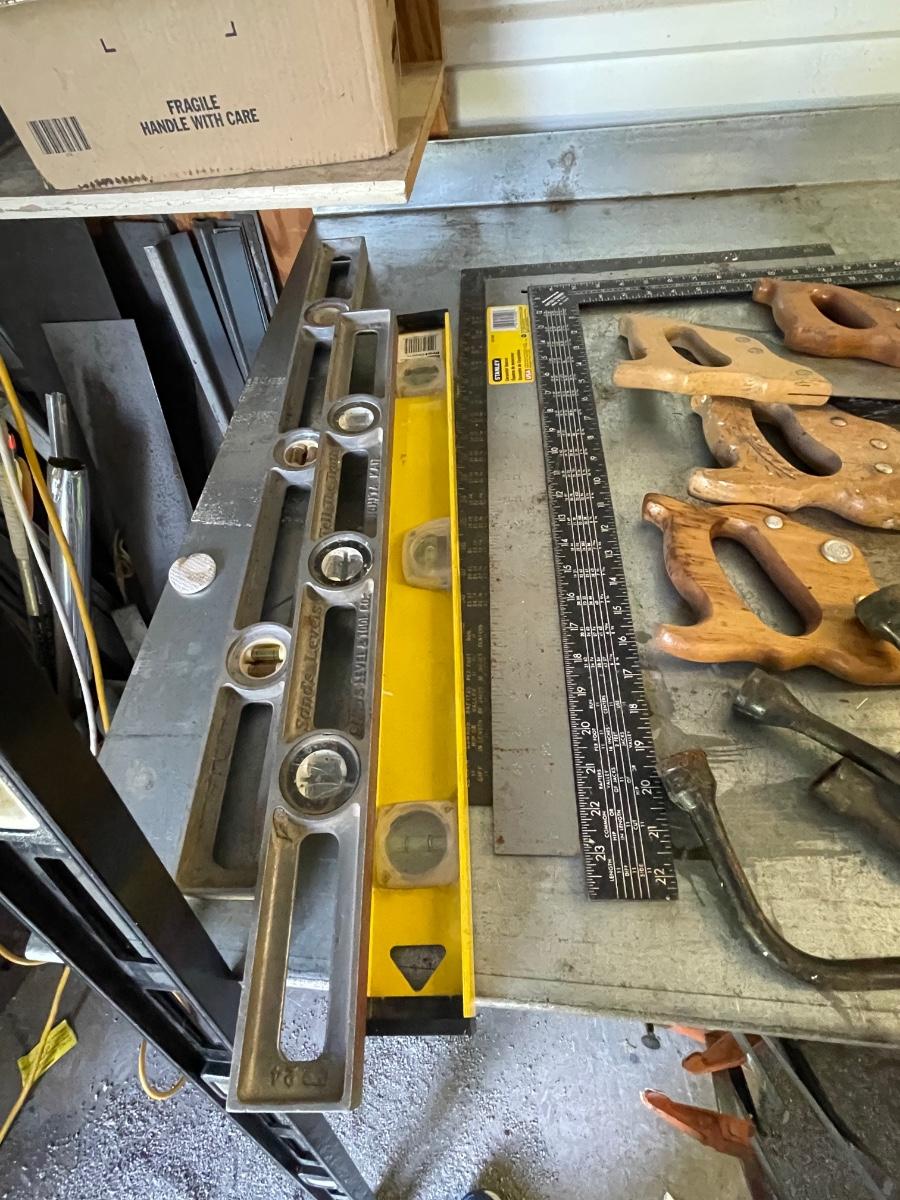 FS68 Levels, squares come up saws, miscellaneous tools and a roughneck tote with lid