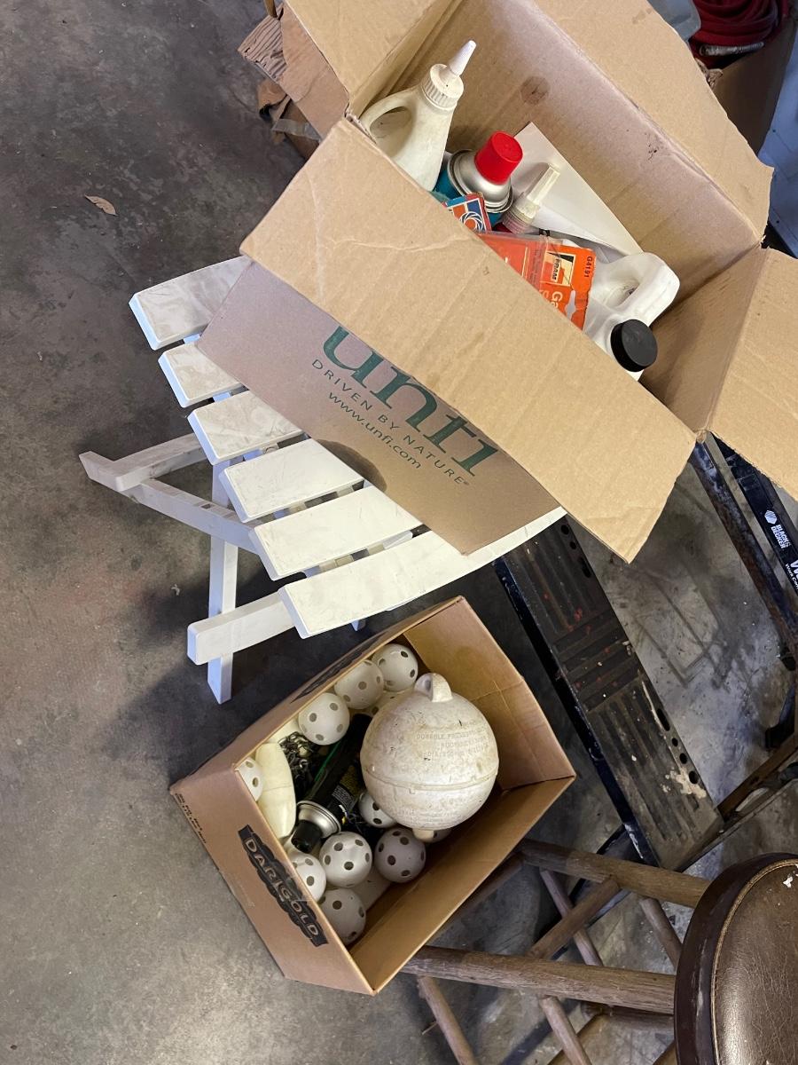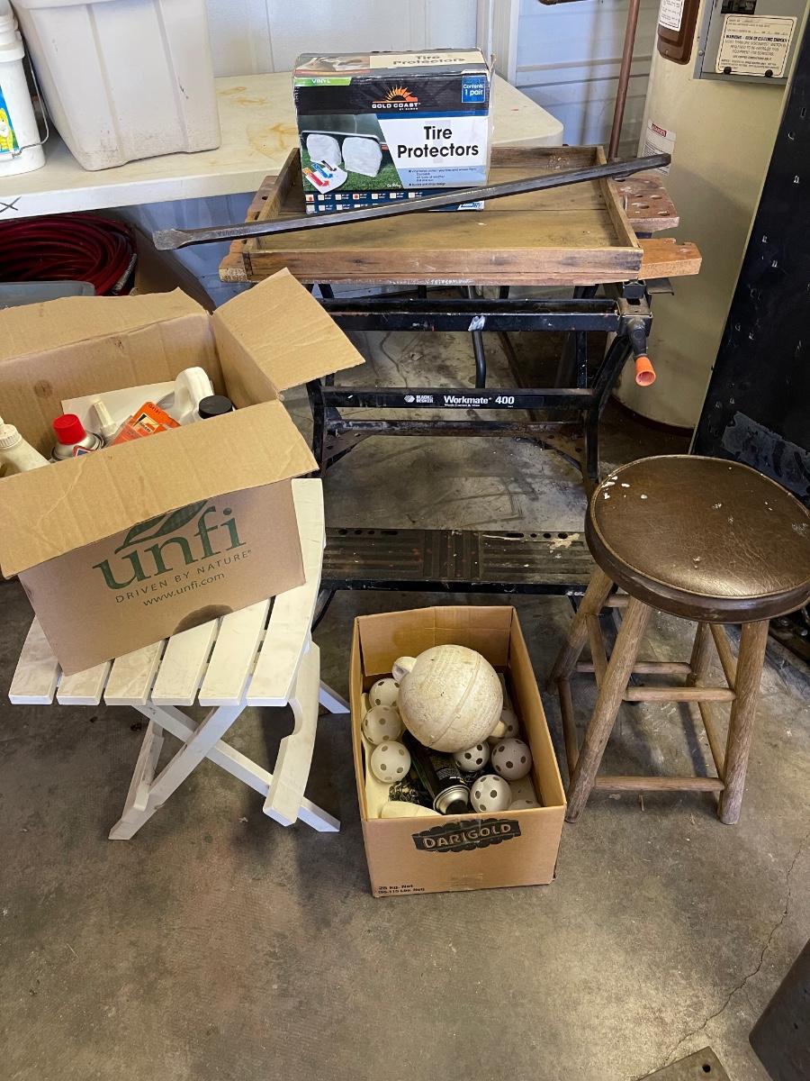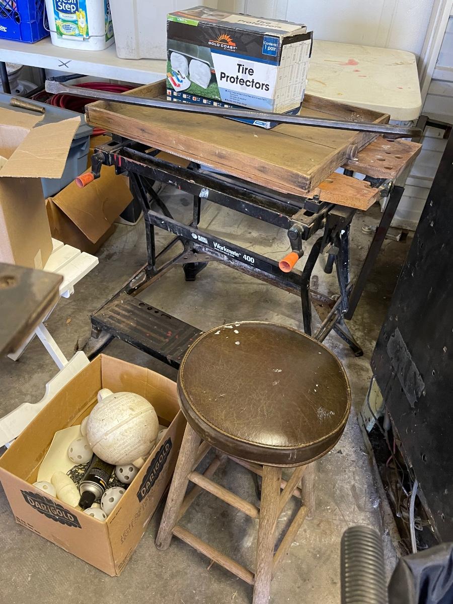 FS91 Workbench, small plastic table, stool, solvents, tire protector and miscellaneous