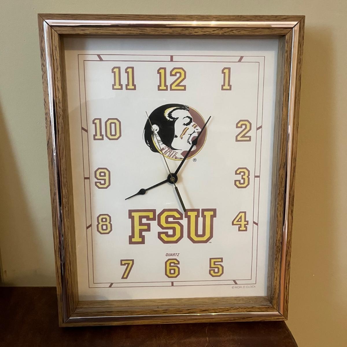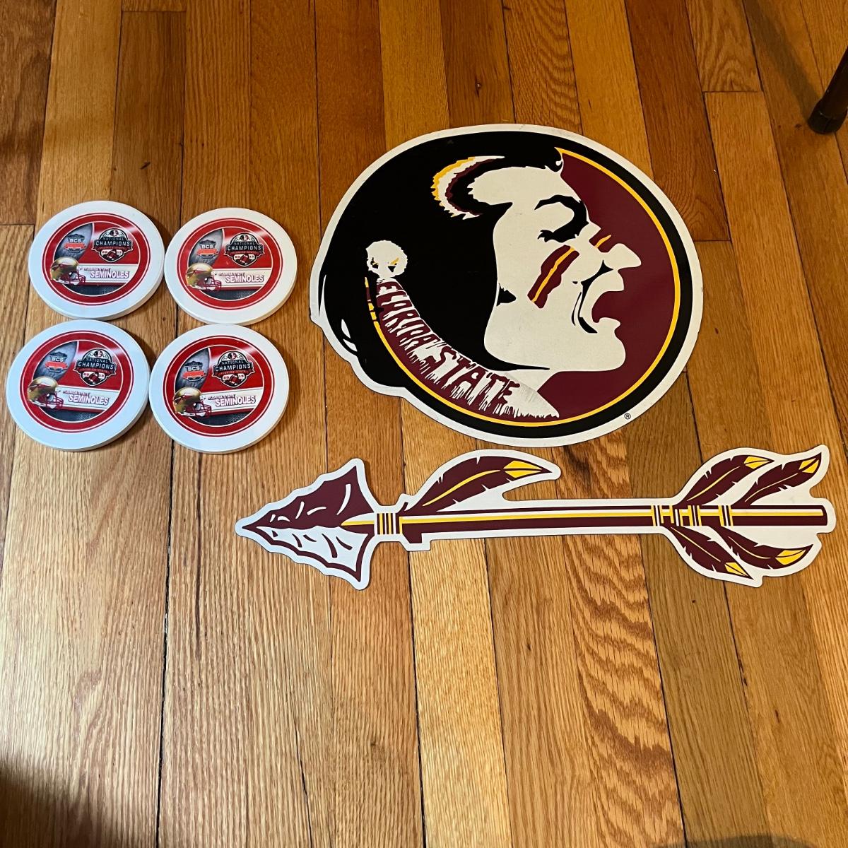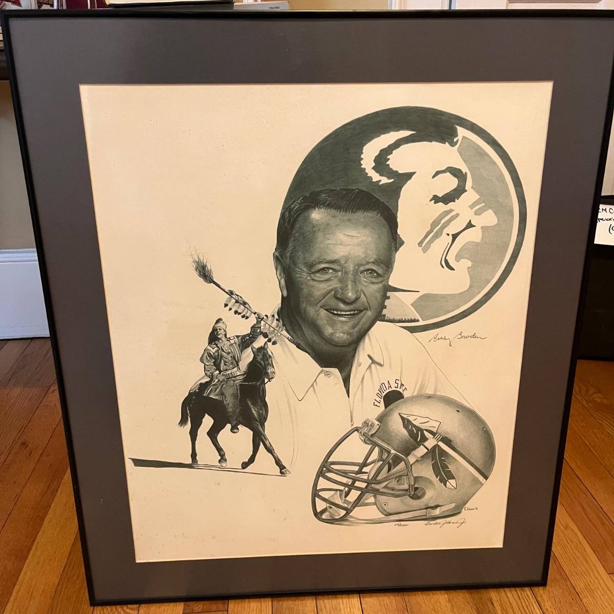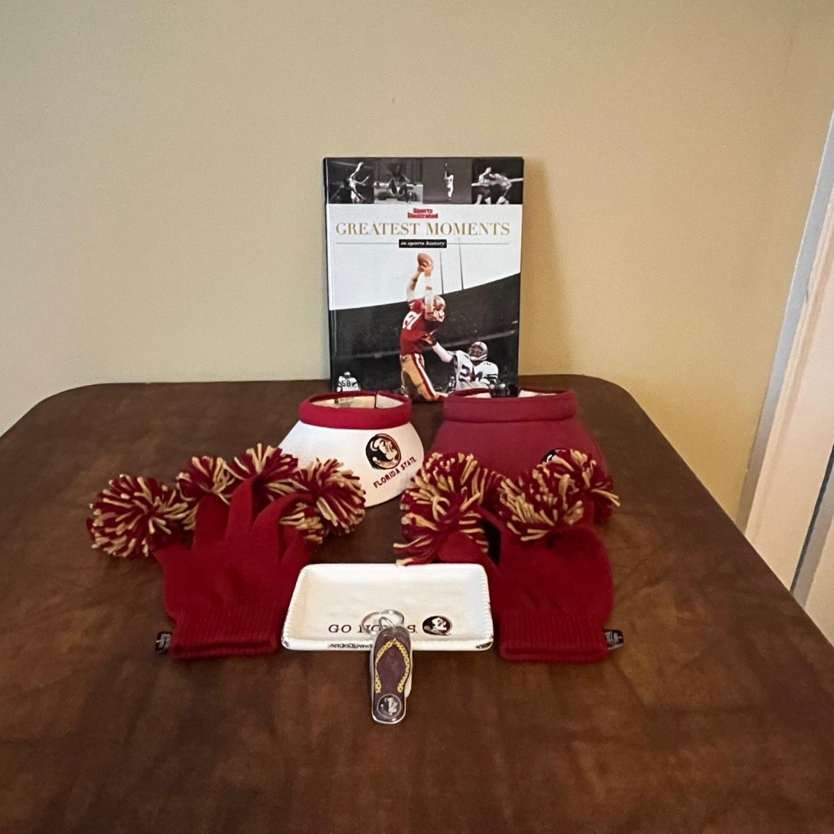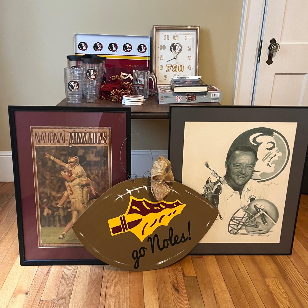 Florida State University Swag includes Saint Bobby signed book, FSU signed and numbered artwork, clock, Tervis tumblers, framed National Champions artwork, Car magnets, trays, puzzle, visors and more. Largest frame measures 23.5” x 27.5”.