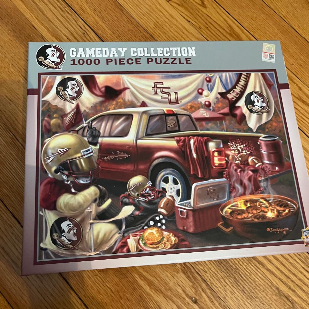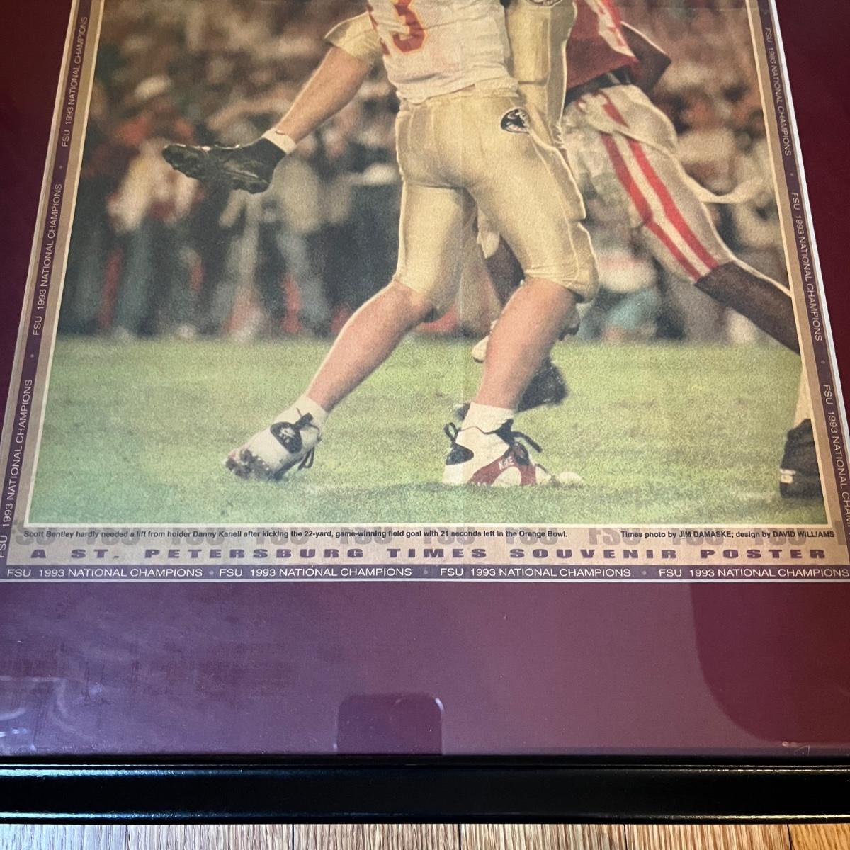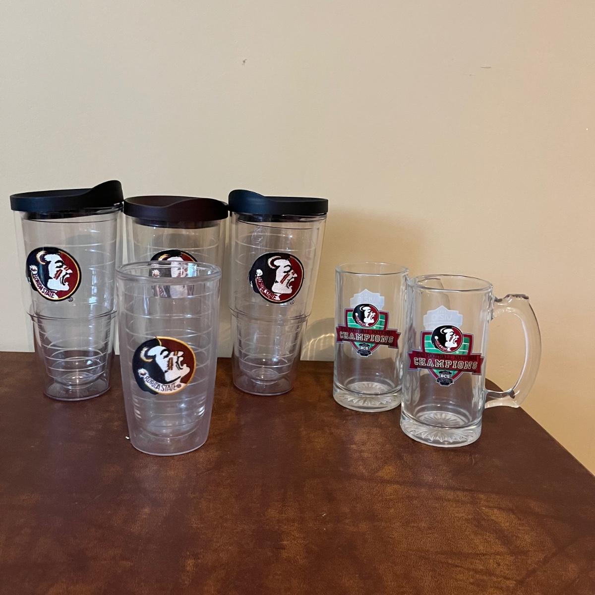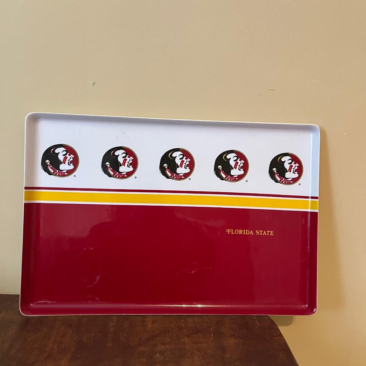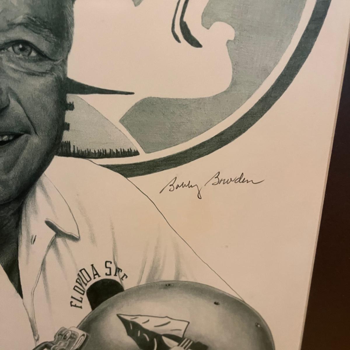 Florida State University Swag includes Saint Bobby signed book, FSU signed and numbered artwork, clock, Tervis tumblers, framed National Champions artwork, Car magnets, trays, puzzle, visors and more. Largest frame measures 23.5” x 27.5”.