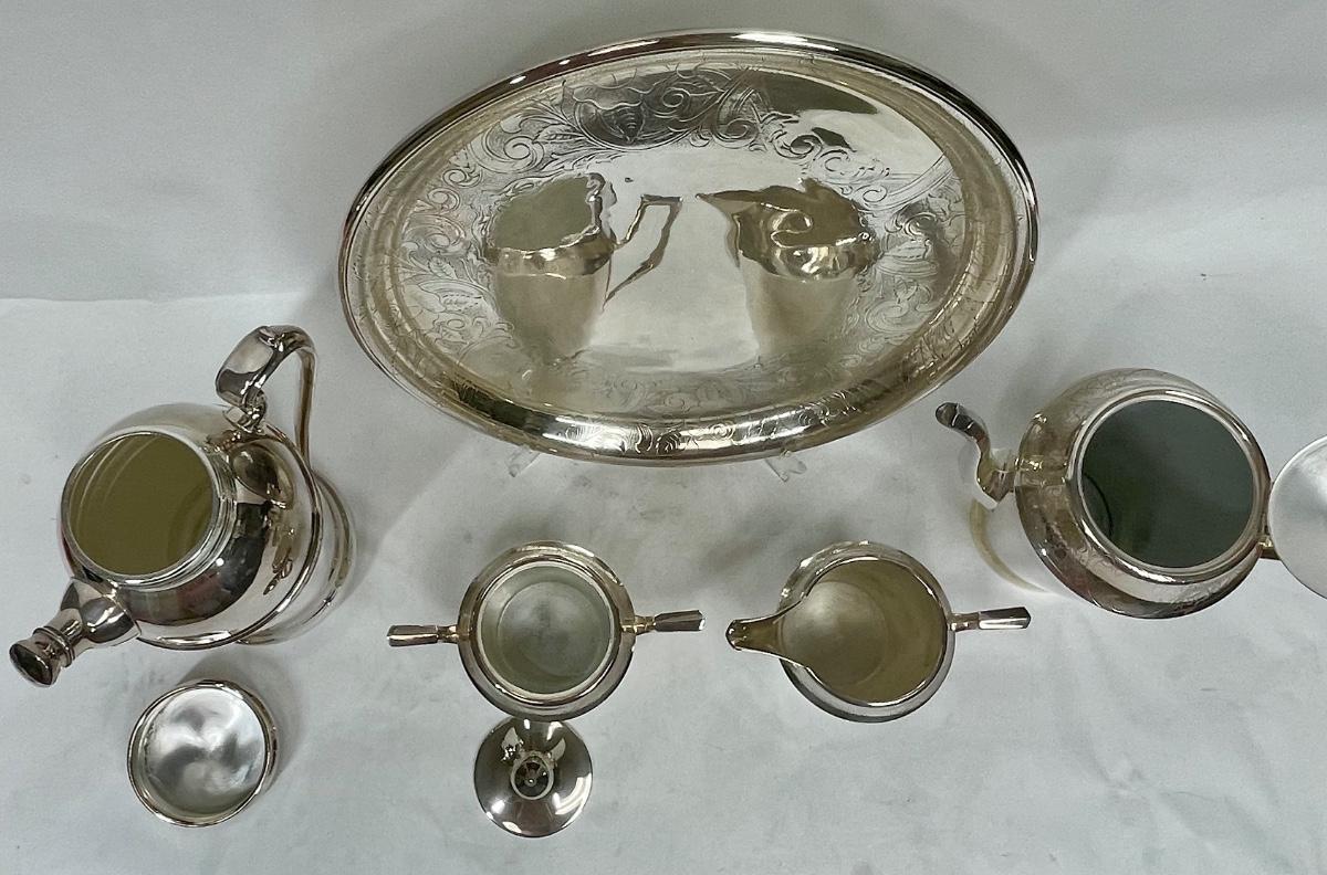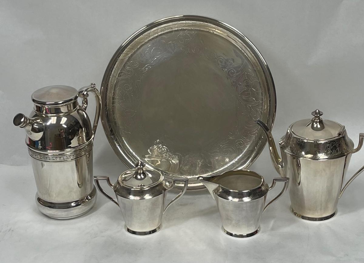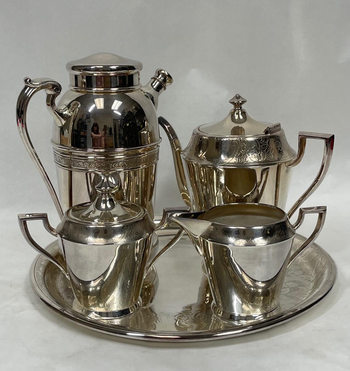 Modern Art Deco - 5 pieces of SilverPlate - Coffee Pot, Shaker Pot, Creamer, Sugar, and Tray