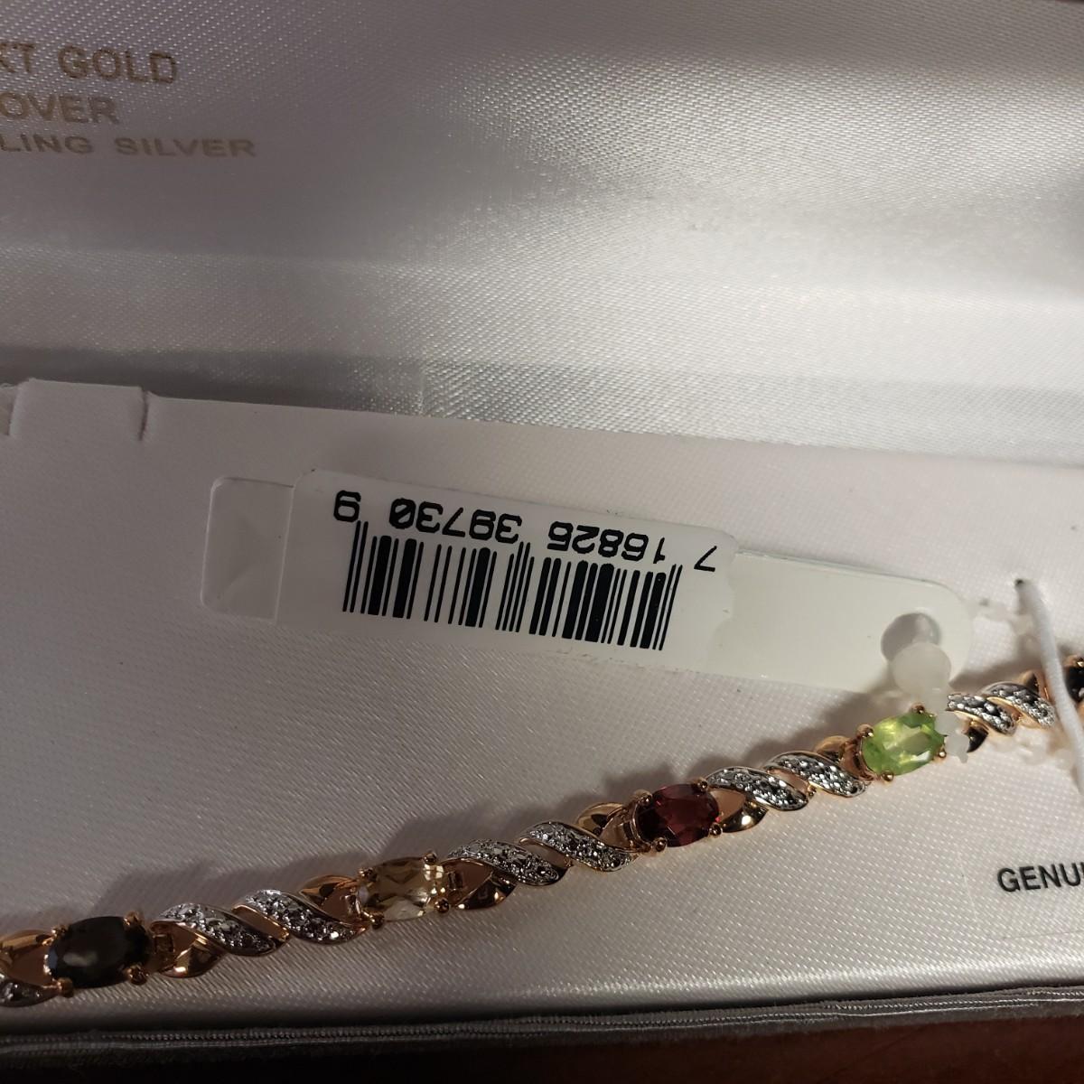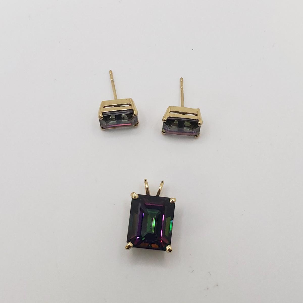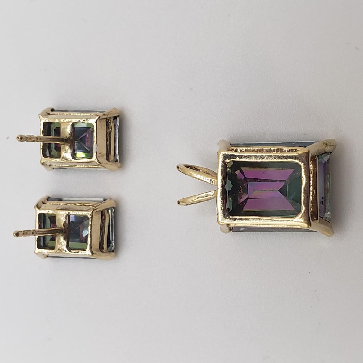 This four piece lot has three identical bracelets. There are four repeating stones in each bracelet. The clasp has two locked down fasteners for extra safety. Each bracelet measures 8". The emerald cut earring and pendant set resemble a Mystic Topaz color. Unfortunately the earrings do not come with backings.