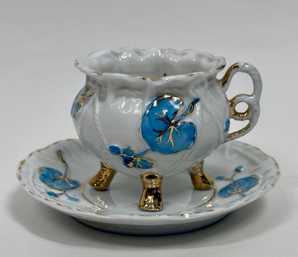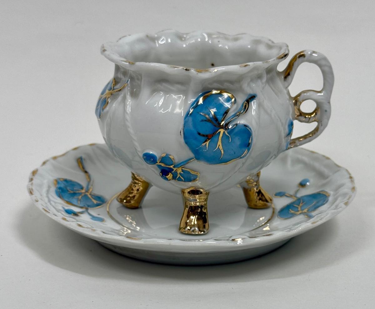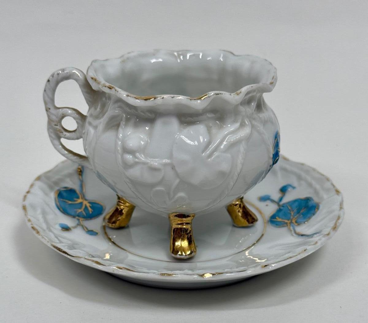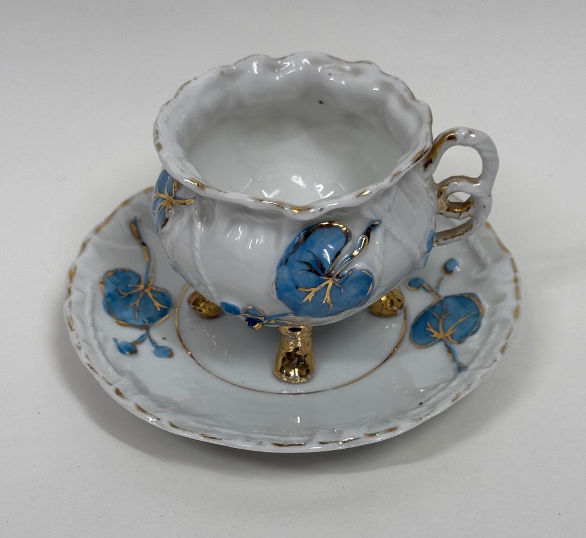 Vintage Demitasse Cup & Saucer blue flowers, gold leaf, three footed cup with rope handle