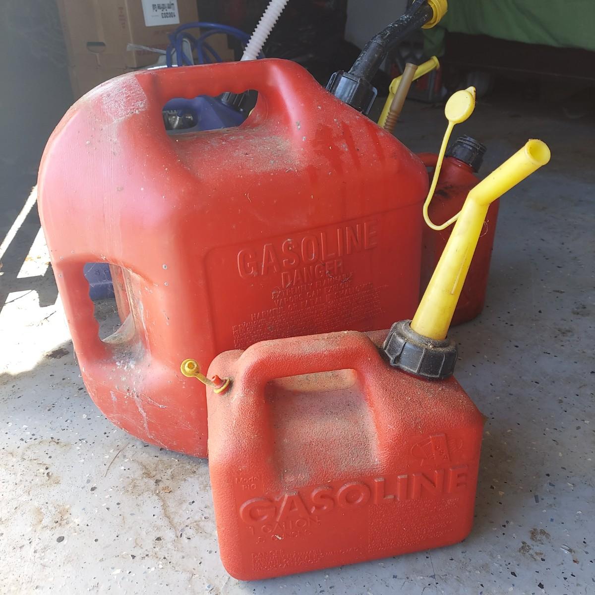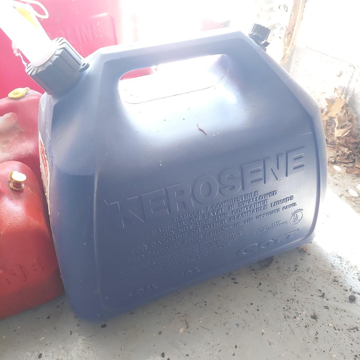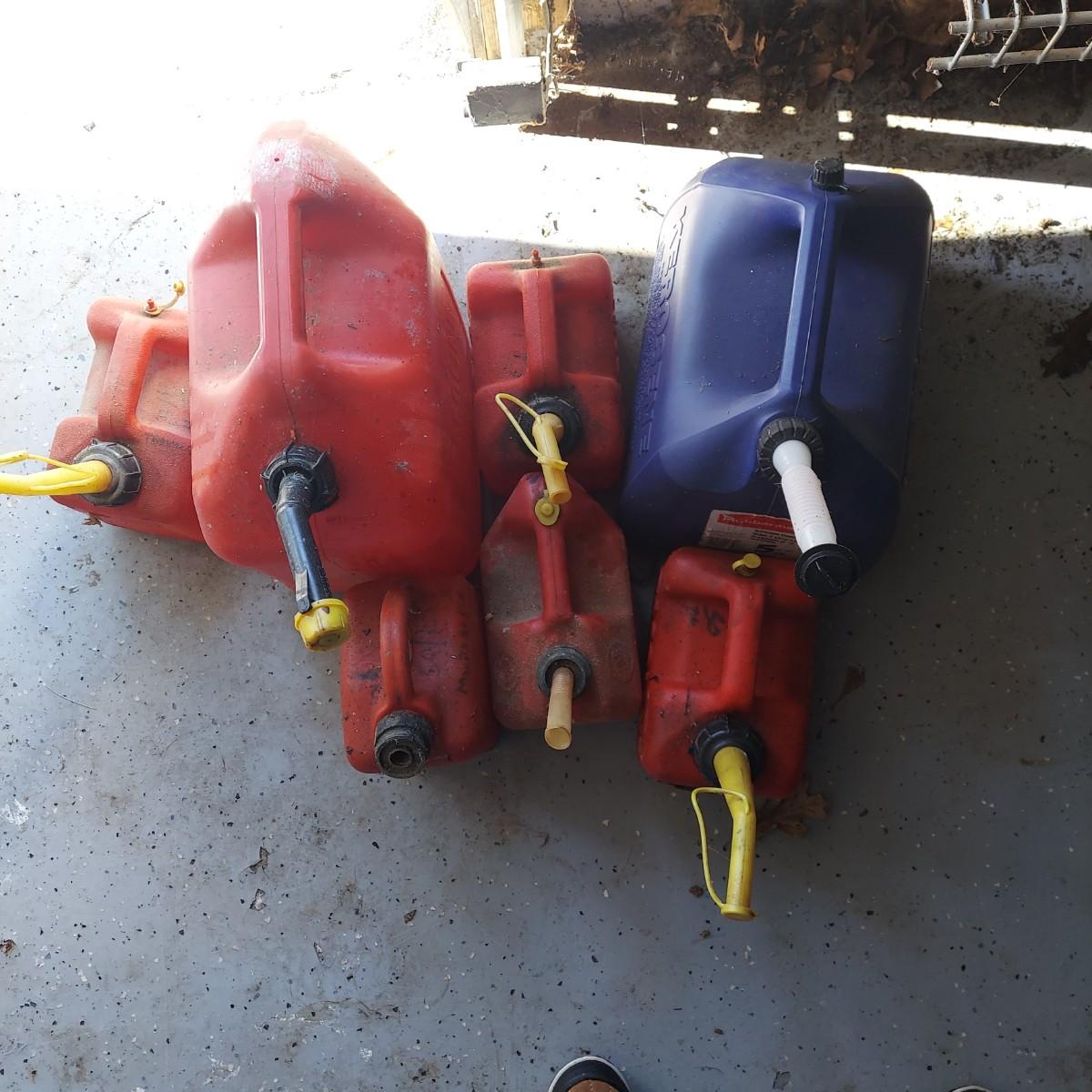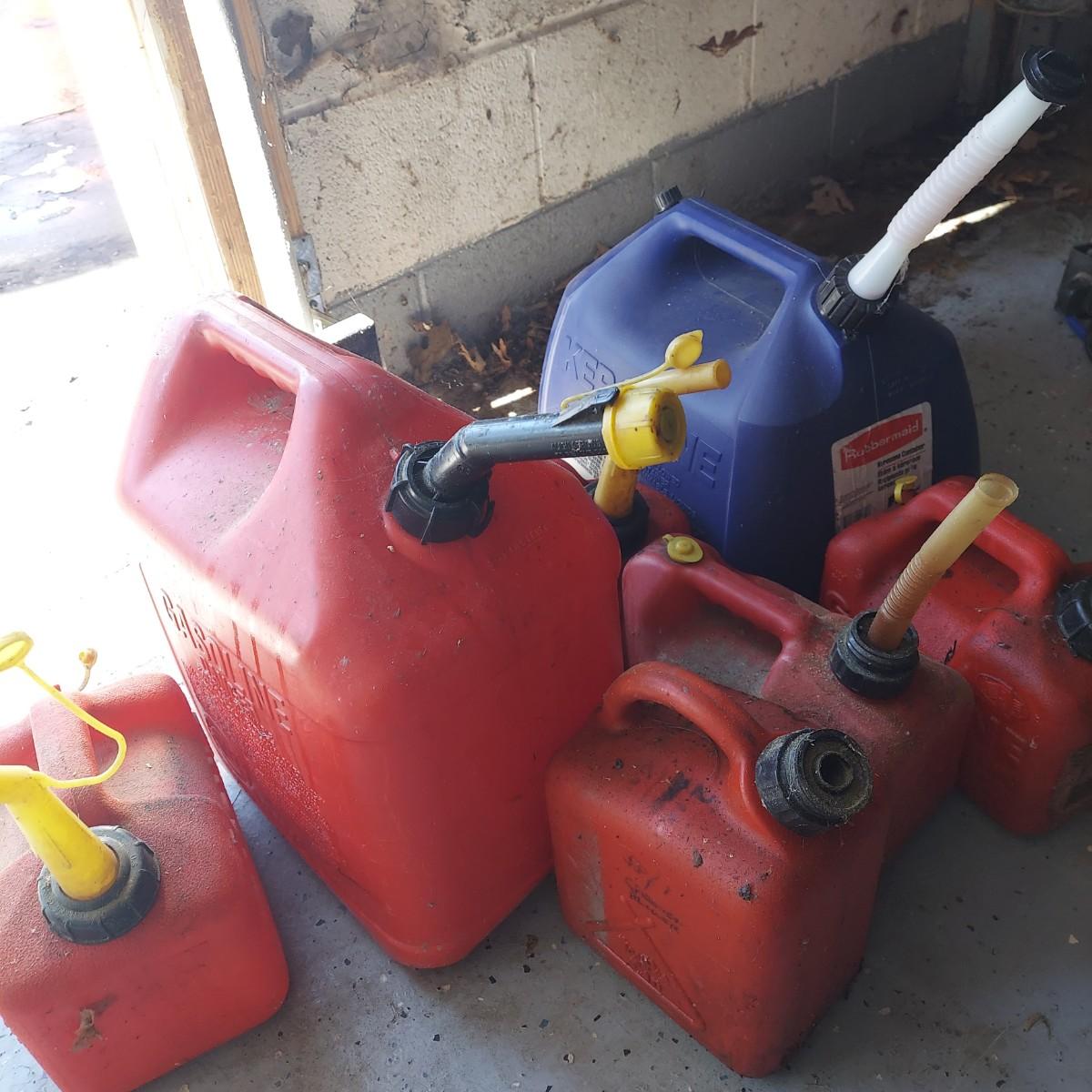 Lot includes six fuel cans that are 1 gallon or 5 gallon. There are five gasoline and one kerosene. The contents of each container cannot be verified. The cans have markings that say types of fuel. Local Pickup Only
