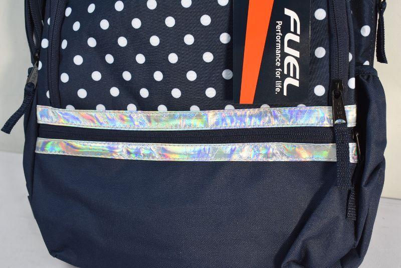 Fuel Mya Girl's Student Backpack with Secure Laptop Sleeve. Navy, White, Silver/Holo - New