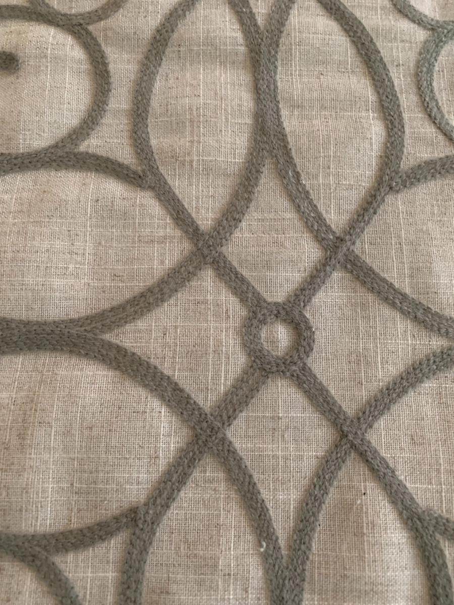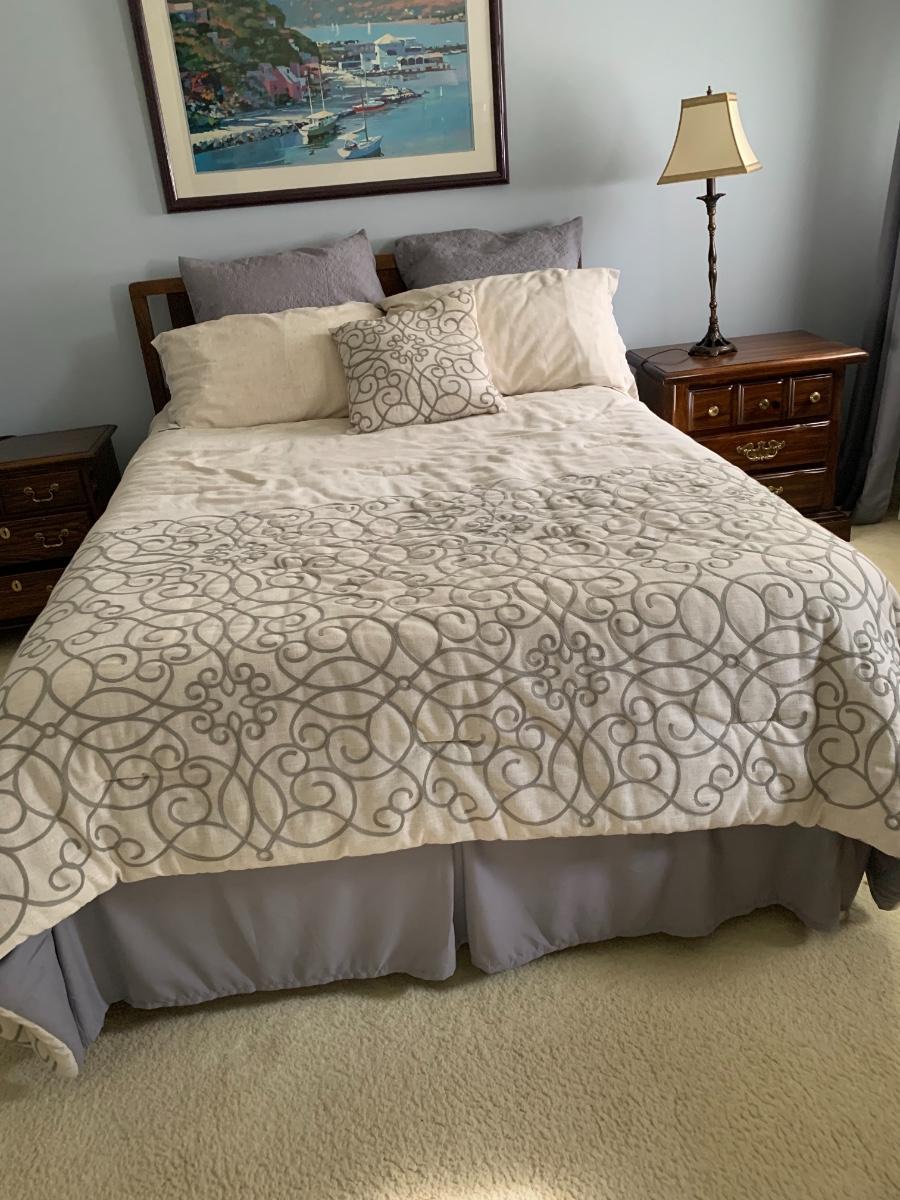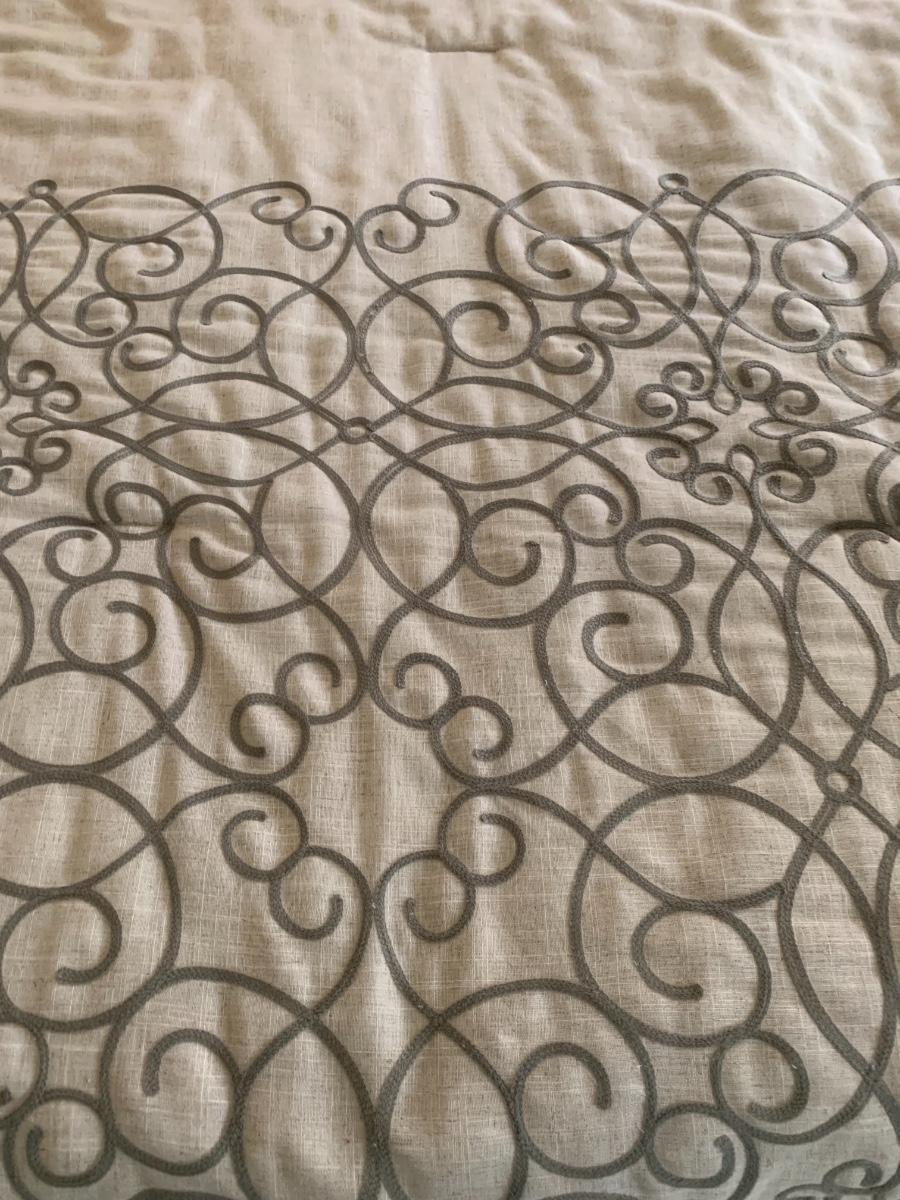 Full /queen bedspread with decorative pillow, 2 regular pillows adn to European shams. Poly/linen blend.