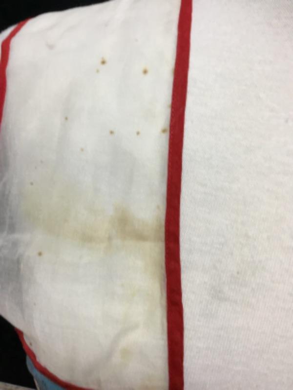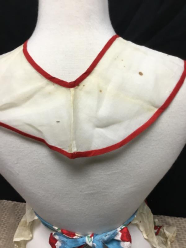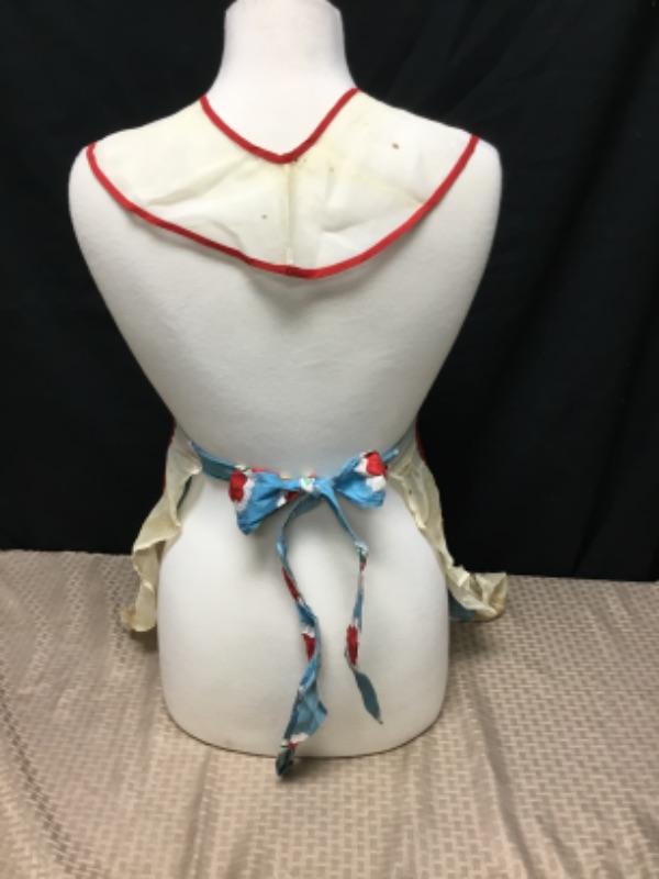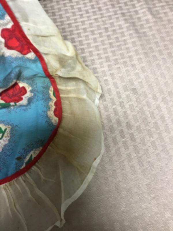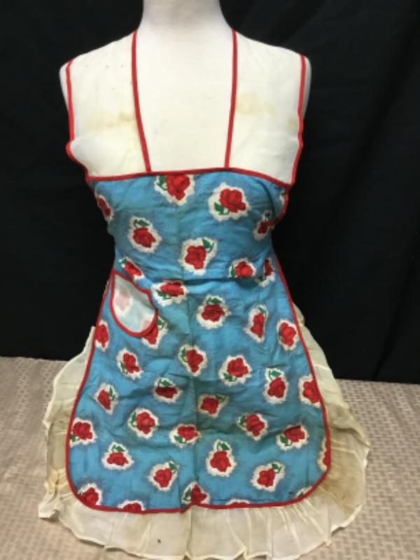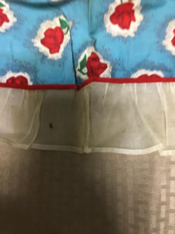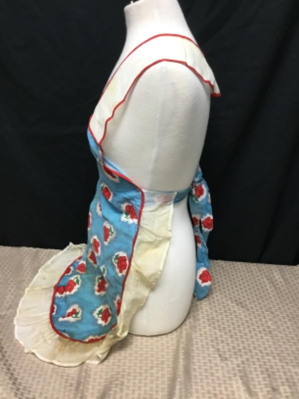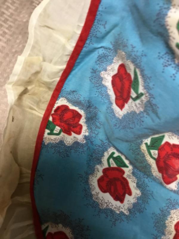 Full apron over head with red roses.one pocket and ruffled it does have some stains 42'l