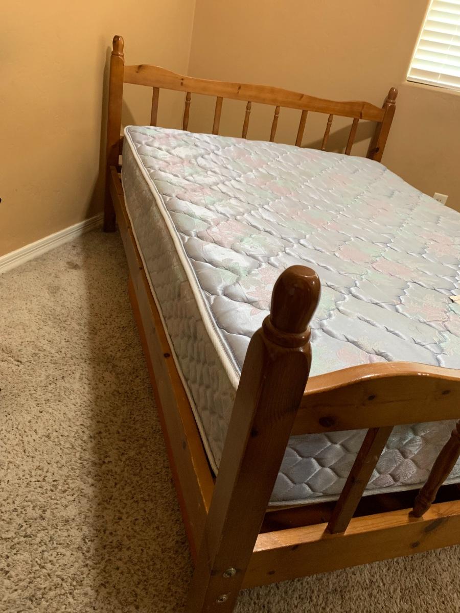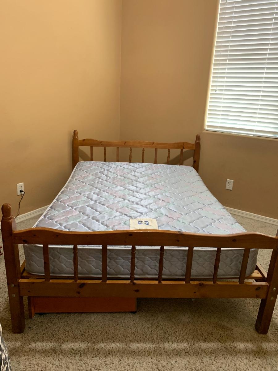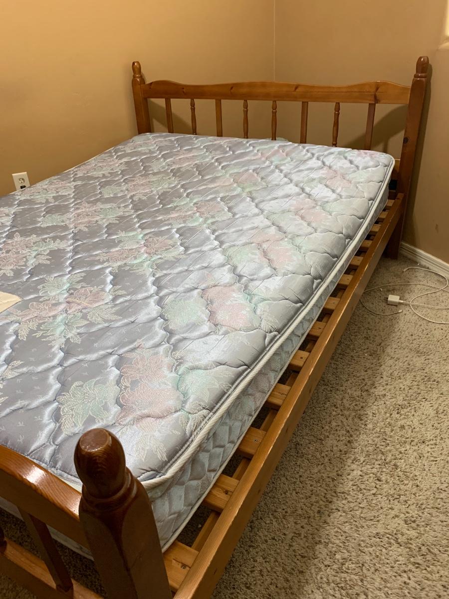 A full bed and bed frame. Mattress itself in good condition, bed frame is in okay condition, does have some obvious wear.