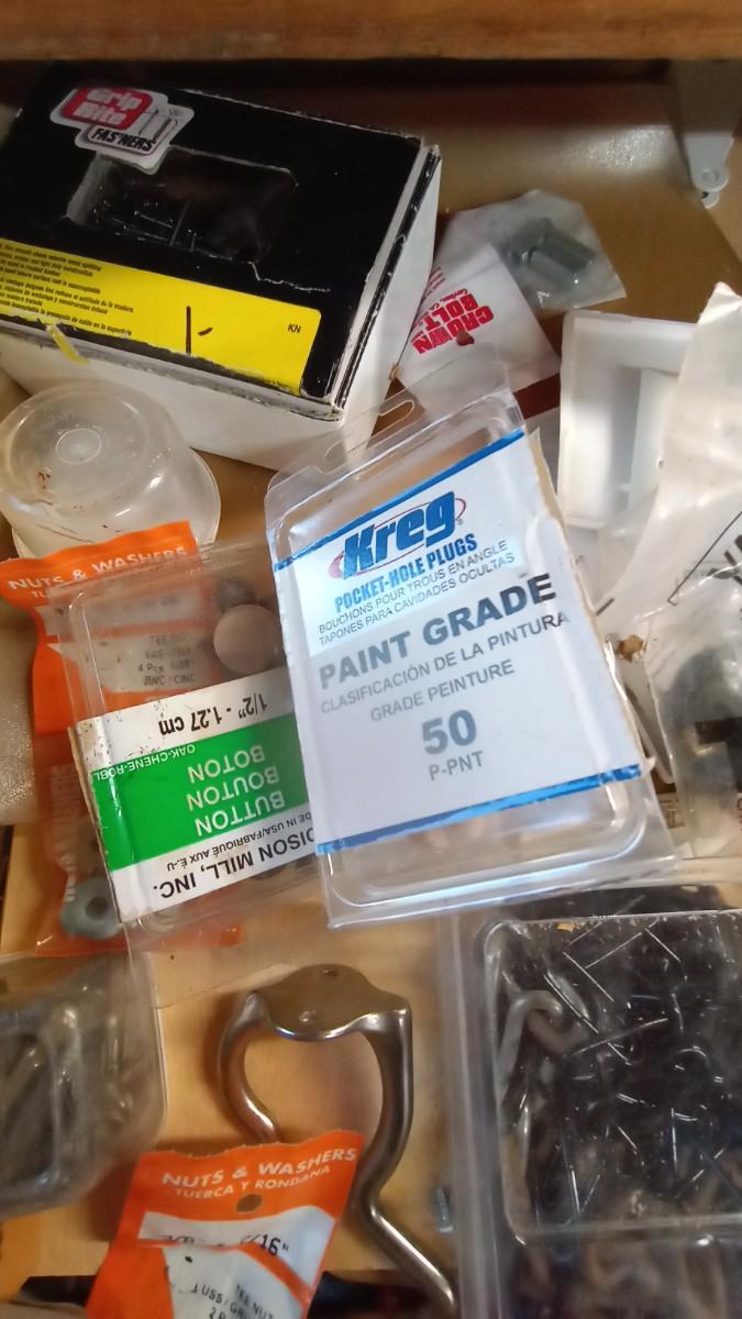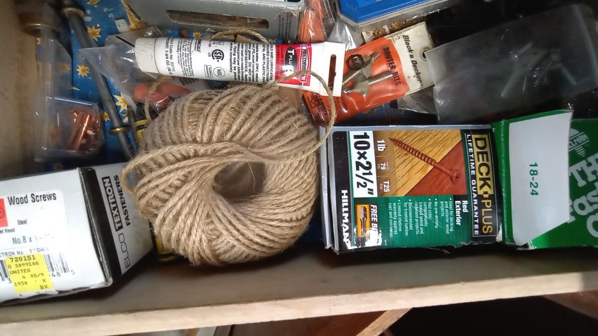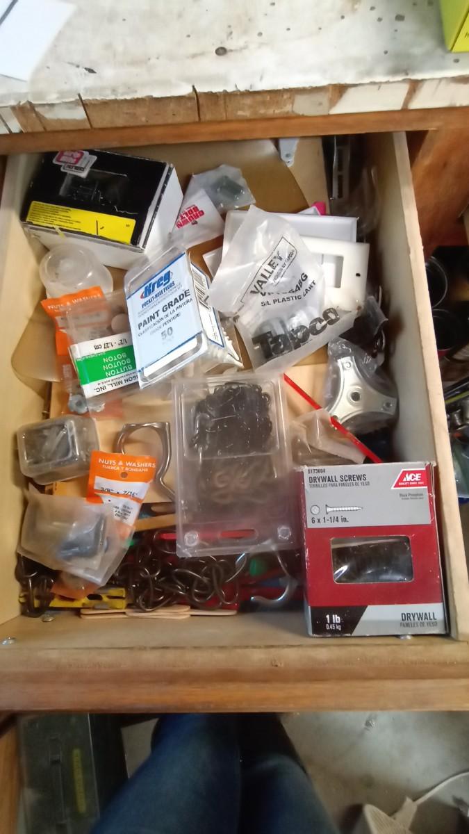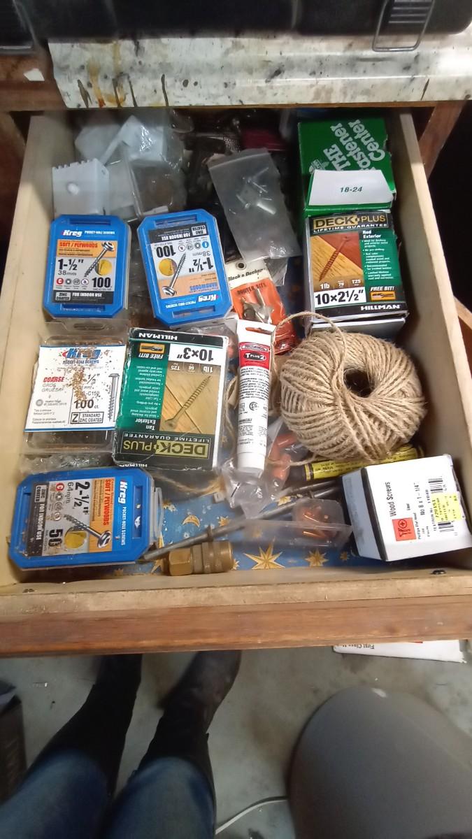 FULL DRAWER OF HARDWARE -TWINE-NAILS-SCREWS- AND MUCH MORE